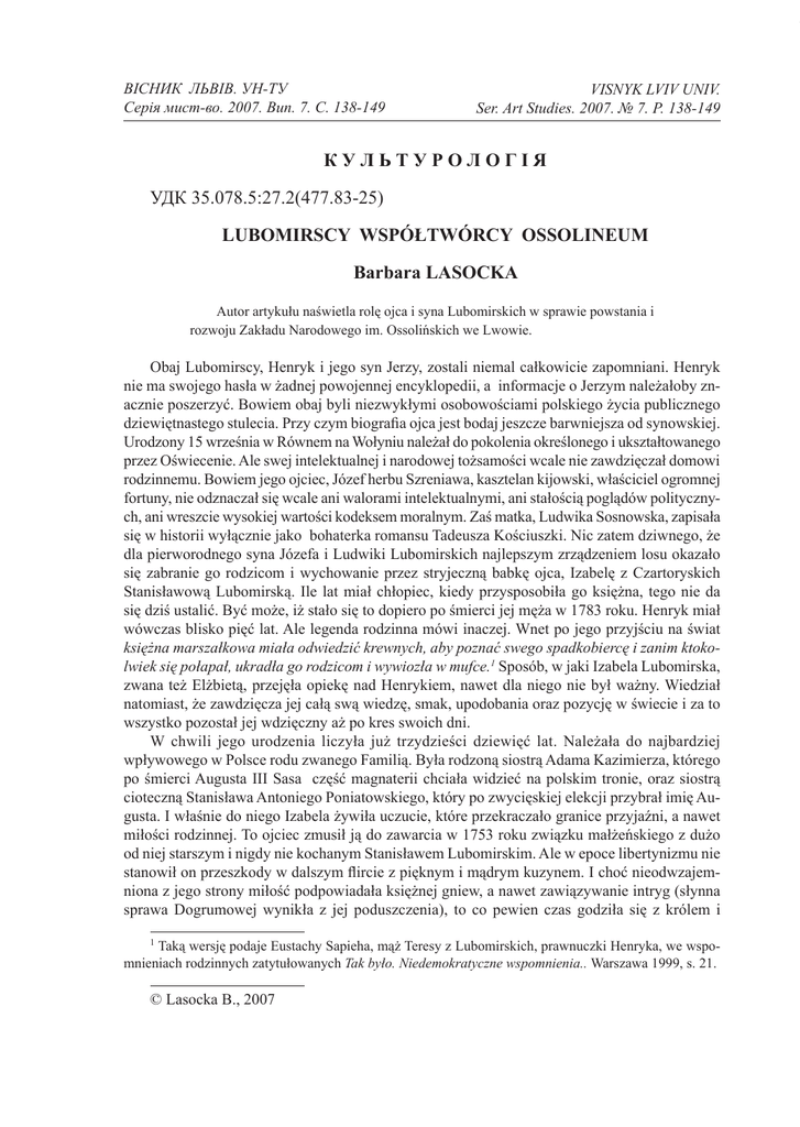 LUBOMIRSCY WSPÓŁTWÓRCY OSSOLINEUM Barbara LASOCKA
