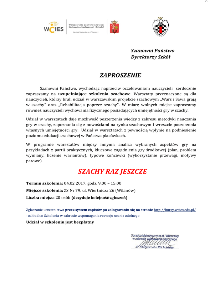 Szanowni Państwo Dyrektorzy Szkół ZAPROSZENIE Szanowni Państwo, wychodząc naprzeciw oczekiwaniom nauczycieli serdecznie zapraszamy na uzupełniające szkolenia szachowe. Warsztaty przeznaczone są dla nauczycieli, którzy brali udział w warszawskim projekcie szachowym „Wars i Sawa grają w szachy” oraz „Rehabilitacja poprzez szachy”. W miarę wolnych miejsc zapraszamy również nauczycieli wychowania fizycznego posiadających umiejętności gry w szachy. Udział w warsztatach daje możliwość poszerzenia wiedzy z zakresu metodyki nauczania gry w szachy, zapoznania się z nowościami na rynku szachowym i wreszcie poszerzenia własnych umiejętności gry. Udział w warsztatach z pewnością wpłynie na podniesienie poziomu edukacji szachowej w Państwa placówkach. W programie warsztatów między innymi: analiza wybranych aspektów gry na przykładach z partii praktycznych, kluczowe zagadnienia gry środkowej (plan, problem wymiany, liczenie wariantów), typowe końcówki (wykorzystanie przewagi, motywy patowe). SZACHY RAZ JESZCZE Termin szkolenia: 04.02 2017, godz. 9.00 – 15.00 Miejsce szkolenia: ZS Nr 79, ul. Wiertnicza 26 (Wilanów) Liczba miejsc: 20 osób (decyduje kolejność zgłoszeń) Zgłaszanie uczestnictwa przez system zapisów po zalogowaniu się na stronie http://kursy.wcies.edu.pl/ - zakładka: Szkolenia w zakresie wspomagania rozwoju ucznia zdolnego Udział w szkoleniu jest bezpłatny