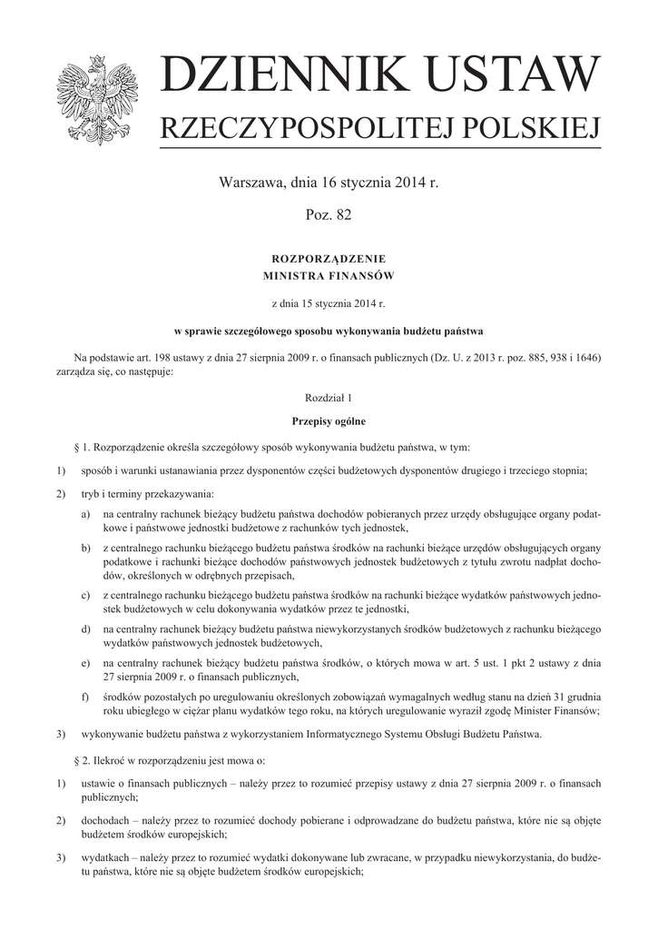 DZIENNIK USTAW RZECZYPOSPOLITEJ POLSKIEJ Warszawa, dnia 16 stycznia 2014 r. Poz. 82 ROZPORZĄDZENIE MINISTRA FINANSÓW z dnia 15 stycznia 2014 r. w sprawie szczegółowego sposobu wykonywania budżetu państwa Na podstawie art. 198 ustawy z dnia 27 sierpnia 2009 r. o finansach publicznych (Dz. U. z 2013 r. poz. 885, 938 i 1646) zarządza się, co następuje: Rozdział 1 Przepisy ogólne § 1. Rozporządzenie określa szczegółowy sposób wykonywania budżetu państwa, w tym: 1) sposób i warunki ustanawiania przez dysponentów części budżetowych dysponentów drugiego i trzeciego stopnia; 2) tryb i terminy przekazywania: a) na centralny rachunek bieżący budżetu państwa dochodów pobieranych przez urzędy obsługujące organy podatkowe i państwowe jednostki budżetowe z rachunków tych jednostek, b) z centralnego rachunku bieżącego budżetu państwa środków na rachunki bieżące urzędów obsługujących organy podatkowe i rachunki bieżące dochodów państwowych jednostek budżetowych z tytułu zwrotu nadpłat dochodów, określonych w odrębnych przepisach, c) z centralnego rachunku bieżącego budżetu państwa środków na rachunki bieżące wydatków państwowych jednostek budżetowych w celu dokonywania wydatków przez te jednostki, d) na centralny rachunek bieżący budżetu państwa niewykorzystanych środków budżetowych z rachunku bieżącego wydatków państwowych jednostek budżetowych, e) na centralny rachunek bieżący budżetu państwa środków, o których mowa w art. 5 ust. 1 pkt 2 ustawy z dnia 27 sierpnia 2009 r. o finansach publicznych, f) 3) środków pozostałych po uregulowaniu określonych zobowiązań wymagalnych według stanu na dzień 31 grudnia roku ubiegłego w ciężar planu wydatków tego roku, na których uregulowanie wyraził zgodę Minister Finansów; wykonywanie budżetu państwa z wykorzystaniem Informatycznego Systemu Obsługi Budżetu Państwa. § 2. Ilekroć w rozporządzeniu jest mowa o: 1) ustawie o finansach publicznych – należy przez to rozumieć przepisy ustawy z dnia 27 sierpnia 2009 r. o finansach publicznych; 2) dochodach – należy przez to rozumieć dochody pobierane i odprowadzane do budżetu państwa, które nie są objęte budżetem środków europejskich; 3) wydatkach – należy przez to rozumieć wydatki dokonywane lub zwracane, w przypadku niewykorzystania, do budżetu państwa, które nie są objęte budżetem środków europejskich; Dziennik Ustaw –2– Poz. 82 4) krajowych środkach finansowych – należy przez to rozumieć dochody i wydatki budżetu państwa, z wyłączeniem dochodów i wydatków budżetu środków europejskich, oraz środki do sfinansowania pożyczkowych potrzeb budżetu państwa; 5) rachunkach państwowych jednostek budżetowych – należy przez to rozumieć odpowiednio rachunki bieżące dochodów lub wydatków w zakresie krajowych środków finansowych dysponentów części budżetowych, dysponentów drugiego stopnia i dysponentów trzeciego stopnia lub rachunki pomocnicze w zakresie krajowych środków finansowych; 6) klasyfikacji budżetowej – należy przez to rozumieć klasyfikację określoną w rozporządzeniu Ministra Finansów wydanym na podstawie art. 39 ust. 4 pkt 1 i ust. 5 ustawy o finansach publicznych; 7) wydatkach niewygasających – należy przez to rozumieć wydatki ujęte w rozporządzeniu Rady Ministrów, o którym mowa w art. 181 ust. 2 ustawy o finansach publicznych; 8) rachunku bankowym do obsługi płatności – należy przez to rozumieć rachunek bankowy Ministra Finansów prowadzony w Banku Gospodarstwa Krajowego, o którym mowa w art. 192 ust. 1 ustawy o finansach publicznych, służący do obsługi płatności w ramach programów finansowanych z udziałem środków europejskich, z wyjątkiem środków na realizację Wspólnej Polityki Rolnej; 9) WPR – należy przez to rozumieć Wspólną Politykę Rolną; 10) rachunku bankowym do obsługi płatności WPR – należy przez to rozumieć rachunek bankowy Ministra Finansów prowadzony w Banku Gospodarstwa Krajowego w oparciu o umowę, o której mowa w art. 208 ust. 2 ustawy o finansach publicznych, służący do obsługi płatności na realizację Wspólnej Polityki Rolnej. Rozdział 2 Ustanawianie dysponentów drugiego i trzeciego stopnia przez dysponentów części budżetowych § 3. 1. Dysponentami środków budżetu państwa są dysponenci części budżetowych i kierownicy podległych tym dysponentom państwowych jednostek budżetowych, którzy zgodnie z odrębnymi przepisami dokonują wydatków budżetu państwa ujętych w planie finansowym jednostki lub realizują dochody budżetu państwa, z zastrzeżeniem ust. 5. 2. Kierownicy państwowych jednostek budżetowych, podlegli dysponentom części budżetowych, mogą być dysponentami środków budżetu państwa drugiego stopnia lub dysponentami środków budżetu państwa trzeciego stopnia. 3. Dysponent części budżetowej ustanawia bezpośrednio mu podległych dysponentów drugiego i trzeciego stopnia. 4. Dysponent części budżetowej ustanawia dysponentów trzeciego stopnia bezpośrednio podległych dysponentowi drugiego stopnia. 5. Dysponent części budżetowej może, w porozumieniu z Ministrem Finansów, ustanowić dysponentami środków budżetu państwa kierowników państwowych jednostek organizacyjnych niebędących państwowymi jednostkami budżetowymi. 6. Dysponent części budżetowej oraz dysponent drugiego stopnia może być jednocześnie dysponentem trzeciego stopnia w zakresie pobierania dochodów i dokonywania wydatków ujętych w planie finansowym jednostki. Rozdział 3 Tryb i terminy przekazywania dochodów oraz środków w celu dokonania wydatków § 4. 1. Dochody są gromadzone odpowiednio na rachunkach bieżących urzędów obsługujących organy podatkowe lub na rachunkach bieżących dochodów państwowych jednostek budżetowych i przekazywane na centralny rachunek bieżący budżetu państwa, którego dysponentem jest Minister F