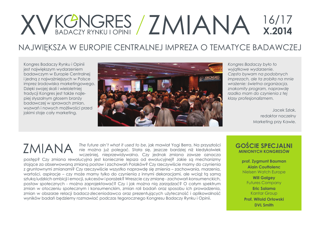 NAJWIĘKSZA W EUROPIE CENTRALNEJ IMPREZA O TEMATYCE BADAWCZEJ Kongres Badaczy Rynku i Opinii jest największym wydarzeniem badawczym w Europie Centralnej i jedną z najważniejszych w Polsce imprez środowiska marketingowego. Dzięki swojej skali i wieloletniej tradycji Kongres jest także najlepiej słyszalnym głosem branży badawczej w sprawach zmian, wyzwań i nowych możliwości przed jakimi staje cały marketing. The future ain’t what it used to be, jak mawiał Yogi Berra. Na przyszłości nie można już polegać. Stała się, jeszcze bardziej niż kiedykolwiek wcześniej, nieprzewidywalna. Czy jednak zmiana zawsze oznacza postęp? Czy zmiana rewolucyjna jest koniecznie lepsza od ewolucyjnej? Jakie są mechanizmy stojące za obserwowaną zmianą postaw i zachowań Polaków? Czy rzeczywiście mamy do czynienia z gruntownymi zmianami? Czy rzeczywiście wszystko naprawdę się zmienia – zachowania, marzenia, wartości, aspiracje – czy może mamy tylko do czynienia z innymi dekoracjami, ale wciąż tą samą sztuką ludzkich ambicji i emocji, sukcesów i porażek? Wreszcie czy zmianę - zachowań konsumenckich, postaw społecznych - można zaprojektować? Czy i jak można nią zarządzać? O całym spektrum zmian w otoczeniu społecznym i konsumenckim, zmian roli badań oraz sposobu ich prowadzenia, zmian w obszarze relacji badacz-zleceniodawca oraz prezentujących użyteczność i aplikowalność wyników badań będziemy rozmawiać podczas tegorocznego Kongresu Badaczy Rynku i Opinii. Kongres Badaczy było to wyjątkowe wydarzenie. Często bywam na podobnych imprezach, ale ta zrobiła na mnie wrażenie: świetna organizacja, znakomity program, naprawdę rzadko mam do czynienia z tej klasy profesjonalizmem. Jacek Szlak, redaktor naczelny Marketing przy Kawie. GOŚCIE SPECJALNI MINIONYCH KONGRESÓW prof. Zygmunt Bauman Alain Couttolenc Nielsen Watch Europe Will Galgey Futures Company Eric Salama Kantar Group Prof. Witold Orłowski DVL Smith W SKŁAD KAŻDEGO PAKIETU SPONSORA GŁÓWNEGO WCHODZI: 1. Nadanie tytułu Sponsora Głównego Kongresu Badaczy 2. Reklama i promocja Sponsora poprzez umieszczenie informacji o Sponsorze we wszystkich materiałach promocyjnych Kongresu w tym: • na stronie www Kongresu (logotyp + informacja tekstowa o Sponsorze i jego ofercie) • w e-mailingach promocyjnych Kongresu (logotyp + hiperłącze) • w materiałach drukowanych Kongresu (logotyp) • na planszach, tablicach, bannerach Kongresu (logotyp) • zamieszczenie materiałów drukowanych/gadżetów Sponsora w pakietach dla uczestników Kongresu • Informacje w materiałach prasowych i komunikatach o Kongresie 3. Udostępnienie miejsca reklamowego podczas Kongresu, w tym: • ekspozycja plansz, bannerów i tablic Sponsora wraz ze stoiskiem promocyjnym wielkości 3,5x2m 4. jednorazowa wysyłka e-mailingu informującego o objęciu przez Zleceniodawcę Kongresu sponsoringiem oraz zawierającego informacje na temat oferty handlowej Sponsora, ok. 5000 odbiorców; 5. udostępnienie w programie kongresu czasu na 30 minutową prezentację Sponsora 6. 4 zaproszenia do dyspozycji Sponsora Koszt pakietu Sponsora Głównego Kongresu Badaczy wynosi uczestnicy minionych edycji średnia z lat 2009-2012 OFERTA LIMITOWANA: 25 tys. zł netto pakiet sponsora głównego W SKŁAD KAŻDEGO PAKIETU SPONSORSKIEGO WCHODZI: 1. Nadanie tytułu Sponsora Kongresu Badaczy 2. Reklama i promocja Sponsora poprzez umieszczenie informacji o Sponsorze we wszystkich materiałach promocyjnych Kongresu w tym: • na stronie www Kongresu (logotyp + informacja tekstowa o Sponsorze i jego ofercie) • w e-mailingach promocyjnych Kongresu (logotyp + hiperłącze) • w materiałach drukowanych Kongresu (logotyp) • na planszach, tablicach, bannerach Kongresu (logotyp) • zamieszczenie materiałów drukowanych/gadżetów Sponsora w pakietach dla uczestników Kongresu • Informacje w materiałach prasowych i komunikatach o Kongresie 3. Udostępnienie miejsca reklamowego podczas Kongresu, w tym ekspozycja plansz, bannerów i tablic Sponsora 4. 2 zaproszenia do dyspozycji Sponsora Koszt pakietu sponsorskiego Kongresu Badaczy wynosi 10 tys. zł netto OFERTA LIMITOWANA: pakietów sponsorskich Biuro Organizacji Kongresu: 02-609 Warszawa, ul. Szarotki 11 tel. 22 649 97 74, tel/fax: 22 649 97 75 e-mail: [email protected] sponsorzy minionych edycji: