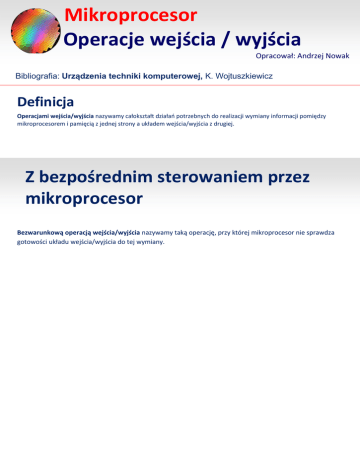 Mikroprocesor Operacje wejścia / wyjścia Opracował: Andrzej Nowak Bibliografia: Urządzenia techniki komputerowej, K. Wojtuszkiewicz Definicja Operacjami wejścia/wyjścia nazywamy całokształt działań potrzebnych do realizacji wymiany informacji pomiędzy mikroprocesorem i pamięcią z jednej strony a układem wejścia/wyjścia z drugiej. Z bezpośrednim sterowaniem przez mikroprocesor Bezwarunkową operacją wejścia/wyjścia nazywamy taką operację, przy której mikroprocesor nie sprawdza gotowości układu wejścia/wyjścia do tej wymiany. Z testowaniem stanu układu wejścia/wyjścia Przy realizacji operacji wejścia/wyjścia z testowaniem stanu układu wejścia/wyjścia, mikroprocesor sprawdza sygnał (np.. może to być określony bit) gotowości układu wejścia/wyjścia do tej wymiany. W przypadku potwierdzenia gotowości do wymiany przez układ jest ona realizowana. Z przerwaniem programu Realizowane są przez 1. Sterownik przerwań Zadania sterownika przerwań pośredniczenie w przyjmowaniu zgłoszeń przerwań pomiędzy mikroprocesorem a innymi układami wejścia / wyjścia przyjmowanie zgłoszeń przerwań od wielu układów wejścia / wyjścia wybór spośród kilku jednocześnie zgłoszonych przerwań tego, które zostanie obsłużone zasygnalizowanie dokonanego wyboru przez podanie numeru (adresu) układu wejścia / wyjścia, z którym zostanie wykonana wymiana, a dokładniej, adresu programu obsługi przerwania realizującego tą wymianę po przyjęciu sygnałów zgłoszeń przerwań od układów wejścia / wyjścia i wyborze układu, który będzie obsłużony, wygenerowanie sygnału zgłoszenia przerwania bezpośrednio do mikroprocesora Schemat blokowy sterownika przerwań W celu umożliwienia przyjmowania kilku przerwań jednocześnie sterownik przerwań dysponuje określoną ilością wejść sygnałów zgłoszeń przerwań od układów wejścia / wyjścia. Sygnały te trafiają do rejestru zgłoszeń przerwań IRR (ang. Interrupt Request Register). Zgłoszone przerwania mogą być maskowane, co oznacza, że mimo ich zgłoszenia nie będą przyjmowane. Operacja maskowania jest prosta i polega na podaniu sygnałów zgłoszeń przerwań na dwuwejściowe bramki AND . Na drugie wejście każdej z bramek podawany jest tak zwany bit maski. Jeżeli wartość tego bitu wynosi 1, przerwanie jest przyjmowane, w przypadku wartości 0 następuje zablokowanie przyjmowania przerwania. Bity maski umieszczane są w rejestrze maski IMR (ang. Interrupt Mask Register – patrz schemat blokowy sterownika przerwań). Następnie przyjmowane przerwania poddawane są arbitrażowi. Operacja maskowania sygnałów przerwań Arbitraż Polega na wyborze spośród kilku zgłoszonych jednocześnie przerwań jednego, które zostanie w danym momencie obsłużone. Wymaga to ustalenia kryterium, według którego zostanie dokonany wybór. Priorytet Kryterium określające pewien stopień ważności, który przydzielamy każdemu sygnałowi zgłoszenia przerwania. Z wszystkich zgłoszonych i niezamaskowanych przerwań wybierane jest to, które posiada najwyższy priorytet. Priorytety przyporządkowywane są poszczególnym wejściom sterownika przerwań. W zależności od jego wersji mogą one być przyporządkowywane w sposób sztywny (na stałe, jak w komputerach typu IBM PC) lub mogą być programowane. Programy obsługi przerwań Podobnie jak inne programy umieszczone są w pamięci operacyjnej i zaczynają się od określonego adresu. Wybór obsługi określonego przerwania polega na podaniu adresu pamięci, pod którym znajduje się początek programu obsługującego dane przerwanie. W komputerach typu IBM PC sterownik przerwań nie podaje bezpośrednio tego adresu, lecz numer pozycji w specjalnej tablicy umieszczonej w pamięci, zwanej tablicą wektorów przerwań. Dopiero elementy tej tablicy zawierają właściwe adresy początków programów obsługi przerwań. 2. Tablica wektorów przerwań Jest to strukturą umieszczoną w pamięci operacyjnej komputera. W komputerach typu IBM PC zaczyna się ona od adresu 0 i kończy na adresie 3FFh. Każda pozycja tej tablicy związana jest z dokładnie jednym przerwaniem i zawiera adres komórki pamięci, w której znajduje się początek (kod pierwszej instrukcji) programu obsługującego przerwanie. Po dokonaniu arbitrażu sterownik przerwań podaje na swoim wyjściu dany numer przerwania, które ma być obsłużone. Mikroprocesor pobiera ten numer i następnie przy jego pomocy odczytuje adres początku programu obsługi przerwania, który ma zostać wykonany. Adres ten, po zapamiętaniu informacji niezbędnych do powrotu do przerwanego programu głównego, jest ładowany do określonych rejestrów procesora, w tym licznika rozkazów. Powoduje to wykonanie skoku do programu obsługi przerwania umieszczonego pod adresem odczytanym z tablicy wektorów przerwań. Generowanie adresu POP przy użyciu tablicy wektorów przerwań 3. Metody zapamiętywania stanu mikroprocesora przy przejściu do obsługi przerwania Jednym z założeń przy obsłudze układów wejścia / wyjścia za pomocą przerwań jest kontynuowanie, po zakończeniu programu obsługi przerwania, programu głównego. Wymaga to przy przejściu do realizacji programu obsługi przerwania zapamiętania wszelkich informacji o programie głównym, potrzebnych do jego kontynuowania (od miejsca, w którym został on przerwany). Zwykle tylko część potrzebnej informacji zapamiętywana jest automatycznie. W przypadku procesorów Intel automatycznie zachowywana jest jedynie zawartość rejestru flagowego i adresu komórki zawierającej kod instrukcji, od której należy kontynuować program główny (jest to zawartość dwóch rejestrów: rejestru segmentu kodu i wskaźnika instrukcji). Informacje te są odkładane na stos. Pozostałe informacje muszą zostać zachowane w wyniku wykonania określonych instrukcji programu obsługi przerwania. Z pośrednim sterowaniem przez mikroprocesor (DMA) W dot