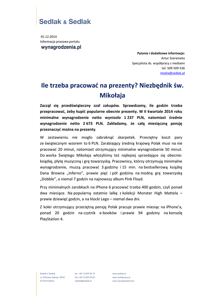 01.12.2014 Informacja prasowa portalu Pytania i dodatkowe informacje: Artur Szeremeta Specjalista ds. współpracy z mediami tel. 509 509 536 [email protected] Ile trzeba pracować na prezenty? Niezbędnik św. Mikołaja Zaczął się przedświąteczny szał zakupów. Sprawdzamy, ile godzin trzeba przepracować, żeby kupić popularne obecnie prezenty. W II kwartale 2014 roku minimalne wynagrodzenie netto wyniosło 1 237 PLN, natomiast średnie wynagrodzenie netto 2 673 PLN. Zakładamy, że całą miesięczną pensję przeznaczyć można na prezenty. W zestawieniu nie mogło zabraknąć skarpetek. Przeciętny koszt pary ze świątecznym wzorem to 6 PLN. Zarabiający średnią krajową Polak musi na nie pracować 20 minut, natomiast otrzymujący minimalne wynagrodzenie 50 minut. Do worka Świętego Mikołaja włożyliśmy też najlepiej sprzedające się obecnie: książkę, płytę muzyczną i grę towarzyską. Pracownicy, którzy otrzymują minimalne wynagrodzenie, muszą pracować 3 godziny i 15 min. na bestsellerową książkę Dana Browna „Inferno”, prawie pięć i pół godziny na modną grę towarzyską „Dobble”, a niemal 7 godzin na najnowszy album Pink Floyd. Przy minimalnych zarobkach na iPhone 6 pracować trzeba 400 godzin, czyli ponad dwa miesiące. Na popularną ostatnio lalkę z kolekcji Monster High Mattela – prawie dziewięć godzin, a na klocki Lego – niemal dwa dni. Z kolei otrzymujący przeciętną pensję Polak pracuje prawie miesiąc na iPhone’a, ponad 20 godzin na czytnik e-booków i prawie 94 godziny na konsolę PlayStation 4. Sedlak & Sedlak tel. +48 12 625 59 10 www.sedlak.pl ul. Królowej Jadwigi 189 B fax +48 12 625 59 20 www.rynekpracy.pl 30-220 Kraków [email protected] www.wynagrodzenia.pl Tabela 1. Jak długo pracujesz na wybrany prezent, zarabiając minimalną i średnią krajową netto prezent cena prezentu w PLN jak długo trzeba pracować na prezent, zarabiając minimalną pensję jak długo trzeba pracować, na prezent zarabiając średnią krajową skarpetki świąteczne 6 50 min. 20 min. książka – „Inferno" Dan Brown 24 3h 15 min. 1h 30 min gra towarzyska – „Dobble” 40 5h 25 min. 2h 30 min. 50 6h 50 min. 3h 10 min. kapcie – wzór „koza” 59 8h 3h 43 min. lalka – „Monster High Strach Kamera Akcja” 65 8h 50 min. 4h 5 min. klocki Lego – City Mobile 107 14h 30 min. 6h 45 min. czytnik e-booków – Kindle 7 Touch WiFi z reklamami model 2014 319 43h 20 min. 20h 4 min. konsola – Sony PlayStation 4 (500GB) 1 490 202h 24 min. 93h 41 min. płyta – Pink Floyd „The Endless River" Sedlak & Sedlak tel. +48 12 625 59 10 www.sedlak.pl ul. Królowej Jadwigi 189 B fax +48 12 625 59 20 www.rynekpracy.pl 30-220 Kraków [email protected] www.wynagrodzenia.pl iPhone 6 2 949 400h 35 min. 185h 25 min. Źródło: opracowanie własne Sedlak & Sedlak na podstawie GUS oraz ceneo.pl Ewelina Jurczak Wynagrodzenia.pl Sedlak & Sedlak wyraża zgodę na publikację niniejszego opracowania pod warunkiem powołania się na źródło: wynagrodzenia.pl oraz zamieszczenie pod artykułem aktywnego linku do strony Ogólnopolskiego Badania Wynagrodzeń 2014 (http://wynagrodzenia.pl/obw.php) czcionką nie mniejszą niż czcionka użyta w publikacji. Sedlak & Sedlak tel. +48 12 625 59 10 www.sedlak.pl ul. Królowej Jadwigi 189 B fax +48 12 625 59 20 www.rynekpracy.pl 30-220 Kraków [email protected] www.wynagrodzenia.pl
