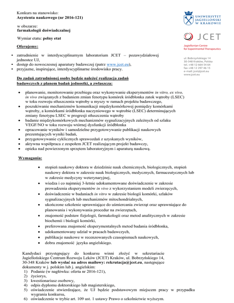 Konkurs na stanowisko: Asystenta naukowego (nr 2016-121) w obszarze: farmakologii doświadczalnej Wymiar etatu: pełny etat Oferujemy: • zatrudnienie w interdyscyplinarnym laboratorium JCET – pozawydziałowej jednostce UJ, • dostęp do nowoczesnej aparatury badawczej (patrz www.jcet.eu), • przyjazne, inspirujące, interdyscyplinarne środowisko pracy. Do zadań zatrudnionej osoby będzie należeć realizacja zadań badawczych z planem badań jednostki, a zwłaszcza: planowanie, monitorowanie przebiegu oraz wykonywanie eksperymentów in vitro, ex vivo, in vivo związanych z badaniem zmian fenotypu komórek śródbłonka zatok wątroby (LSEC) w toku rozwoju stłuszczenia wątroby u myszy w ramach projektu badawczego, poszukiwanie mechanizmów komunikacji międzykomórkowej pomiędzy komórkami wątroby, a komórkami śródbłonka naczyniowego w wątrobie (LSEC) determinujących zmiany fenotypu LSEC w progresji stłuszczenia wątroby badanie międzykomórkowych mechanizmów sygnalizacyjnych zależnych od szlaku VEGF/NO w toku rozwoju wtórnej dysfunkcji śródbłonka opracowanie wyników i samodzielne przygotowywanie publikacji naukowych prezentujących wyniki badań, przygotowywanie cyklicznych sprawozdań z uzyskanych wyników, aktywna współpraca z zespołem JCET realizującym projekt badawczy, opieka nad powierzonym sprzętem laboratoryjnym i aparaturą naukową. Wymagania: stopień naukowy doktora w dziedzinie nauk chemicznych, biologicznych, stopień naukowy doktora w zakresie nauk biologicznych, medycznych, farmaceutycznych lub w zakresie medycyny weterynaryjnej, wiedza i co najmniej 3-letnie udokumentowane doświadczenie w zakresie prowadzenia eksperymentów in vivo z wykorzystaniem modeli zwierzęcych, doświadczenie w badaniach in vitro w zakresie biologii komórki, szlaków sygnalizacyjnych lub mechanizmów mitochondrialnych, ukończone szkolenie uprawniające do uśmiercania zwierząt oraz uprawniające do planowania i wykonywania procedur na zwierzętach, znajomość podstaw fizjologii, farmakologii oraz metod analitycznych w zakresie biochemii i biologii komórki, preferowana znajomość eksperymentalnych metod badania śródbłonka, udokumentowany udział w pracach badawczych, publikacje naukowe w recenzowanych czasopismach naukowych, dobra znajomość języka angielskiego. Kandydaci przystępujący do konkursu winni złożyć w sekretariacie Jagiellońskiego Centrum Rozwoju Leków (JCET) Kraków, ul. Bobrzyńskiego 14, 30-348 Kraków lub wysłać na adres mailowy: [email protected], następujące dokumenty w j. polskim lub j. angielskim: 1) Podanie (w nagłówku: oferta nr 2016-121), 2) życiorys, 3) kwestionariusz osobowy, 4) odpis dyplomu doktorskiego lub magisterskiego, 5) oświadczenie stwierdzające, że UJ będzie podstawowym miejscem pracy w przypadku wygrania konkursu, 6) oświadczenie w trybie art. 109 ust. 1 ustawy Prawo o szkolnictwie wyższym. 7) oświadczenie o znajomości i akceptacji zasad dotyczących własności intelektualnej i ochrony prawnej dóbr intelektualnych. Formularze można znaleźć na stronie internetowej: http://www.dso.uj.edu.pl/druki-do-pobrania/dokumenty-dla-kandydatow-pracownikow Termin składania zgłoszeń upływa z 9 listopada 2016 r. Rozstrzygnięcie konkursu nastąpi do dnia: do 1 tygodnia od zakończenia rozmów kwalifikacyjnych na to stanowisko. Uniwersytet Jagielloński nie zapewnia mieszkań. Na podaniu należy dopisać: „Wyrażam zgodę na przetwarzanie moich danych osobowych zawartych w mojej ofercie pracy dla potrzeb niezbędnych do realizacji procesu rekrutacji” ( zgodnie z ustawą z dnia 29 sierpnia 1997 roku o ochronie danych osobowych, Dz. U. Nr 133, poz. 883 z późniejszymi zmianami). 2