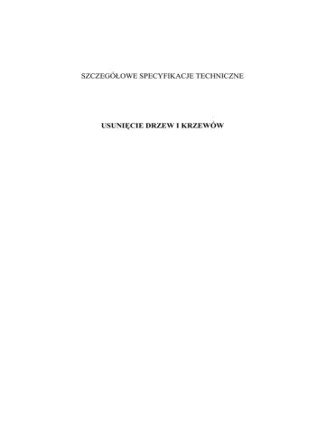 SZCZEGÓŁOWE SPECYFIKACJE TECHNICZNE USUNIĘCIE DRZEW I KRZEWÓW 1. WSTĘP 1.1.Przedmiot SST Przedmiotem niniejszej specyfikacji technicznej (SST) są wymagania dotyczące wykonania i odbioru robót związanych z usunięciem drzew i krzewów. 1.2. Zakres stosowania SST Specyfikacja techniczna (SST) stanowi obowiązującą podstawę opracowania jako dokument przetargowy i kontraktowy przy zlecaniu i realizacji robót wymienionych w punkcie 1.1. 1.3. Zakres robót objętych SST Ustalenia zawarte w niniejszej specyfikacji dotyczą zasad prowadzenia robót związanych z wycinką drzew i krzewów. 1.4. Określenia podstawowe Stosowane określenia podstawowe są zgodne z obowiązującymi, odpowiednimi polskimi normami oraz z definicjami podanymi w SST D-M-00.00.00 „Wymagania ogólne” pkt 1.4. 1.5. Wymagania dotyczące robót Wymagania dotyczące robót podano w SST D-M-00.00.00 pkt 1.5. 2. MATERIAŁY 2.1. Warunki ogólne stosowania materiałów Ogólne wymagania dotyczące materiałów, ich pozyskiwania i składowania podano w SST D-M 00.00.00. Materiały stosowane do robót to materiały zabezpieczające przed uszkodzeniami mechanicznymi systemu korzeniowego drzew, pnia i korony (deski, maty słomiane zuŜyte opony). 3. SPRZĘT 3.1. Wymagania dotyczące sprzętu Wymagania dotyczące sprzętu podano w SST D-M-00.00.00 pkt 3. 3.2. Sprzęt do usuwania drzew i krzewów Zastosowany sprzęt powinien być zgodny z projektem organizacji robót, zaakceptowanym przez InŜyniera. 4. TRANSPORT 4.1. Wymagania dotyczące transportu Wymagania dotyczące transportu podano w SST D-M-00.00.00 pkt 4. Pnie, karpinę, gałęzie naleŜy przewozić transportem samochodowym. Drzewa i krzewy zbędne naleŜy wywieźć w miejsce wskazane przez InŜyniera. 4.2. Transport pni i karpiny Pnie, karpinę oraz gałęzie naleŜy przewozić transportem samochodowym. Pnie przedstawiające wartość jako materiał uŜytkowy (np. budowlany, meblarski itp.) powinny być transportowane w sposób nie powodujący ich uszkodzeń. 5. WYKONANIE ROBÓT 5.1. Zasady wykonania robót Zasady wykonania robót podano w SST D-M-00.00.00 pkt 5. 5.2. Zabezpieczenie drzewostanu istniejącego Na placu budowy wszystkie drzewa przeznaczone do zachowania, naraŜone na uszkodzenie, naleŜy skutecznie zabezpieczyć, zgodnie z wymogami prawa budowlanego i ustawy o ochronie przyrody. Przepisy te dotyczą skutecznego zabezpieczenia roślin w części nadziemnej oraz podziemnej, co odnosi się zarówno do bezpośredniego zabezpieczenia drzew, jak i sposobu prowadzenia prac budowlanych. 5.2.1. Zabezpieczanie pni drzew Zabezpieczenia muszą chronić pnie drzew przed uszkodzeniami mechanicznymi, zasypaniem oraz uszkodzeniem składowanym materiałem. Teren wokół pnia drzewa powinien być zabezpieczony niską zaporą uniemoŜliwiającą do niego dostęp. Wygrodzenie o charakterze ogrodzenia naleŜy zlokalizować w odległości minimum 1m od pnia drzewa. JeŜeli takie rozwiązanie jest niemoŜliwe, naleŜy bezwzględnie, na cały okres budowy, pnie oszalować deskami, wypełniając przestrzeń pomiędzy pniem a deską matami słomianymi lub zrolowaną jutą, które będą amortyzowały ewentualne uderzenia z zewnątrz. Wysokość oszalowania powinna sięgać do wysokości dolnych gałęzi koron drzew. Dolny koniec deski powinien opierać się na podłoŜu, nie na nabiegach korzeniowych. Przy wykonywaniu zabezpieczeń pni niedopuszczalne jest wbijanie w nie gwoździ. 5.2.2. Zabezpieczanie korzeni i koron drzew Najlepszym sposobem ochrony jest wygrodzenie powierzchni w obrysie korony i wyznaczenie dróg poza obrysem korony drzewa. Wytyczając drogi komunikacyjne dla obsługi budowy naleŜy uwzględnić rosnące w terenie drzewa. Wszystkie drogi tymczasowe dla obsługi budowy naleŜy wytyczać poza zasięgiem koron i systemów korzeniowych drzew. Nie wolno dopuścić do poruszania się pojazdów powodujących zagęszczanie gruntu i obrywanie korzeni. JeŜeli jednak istnieje konieczność wytyczenia drogi w obrębie korony lub korzeni drzewa, naleŜy wykonać ją ze specjalnych elementów, izolując pod-łoŜe warstwą gruboziarnistego Ŝwiru lub innych podobnych materiałów. Przy drzewach nie wolno składować materiałów budowlanych oraz innych rzeczy mogących spowodować jakiekolwiek uszkodzenia drzew. W przypadku głębokich wykopów w zasięgu korzeni drzew naleŜy wykonywać specjalne ekrany zabezpieczające systemy korzeniowe, z zastosowaniem podłoŜa biologicznie czynnego, które umoŜliwi szybszą odbudowę korzeni. Wszystkie prace w obrębie brył korzeniowych powinny być prowadzone ręcznie. Wyznacznikiem zasięgu obszaru prac ręcznych jest zazwyczaj obrys korony drzewa. Cięcia Ŝywych części koron naleŜy wykonywać tylko w ostateczności, pod nadzorem osoby uprawnionej. 5.2.3. Ochrona drzew przy wymianie krawęŜników i chodników Usuwanie krawęŜników i płyt chodnikowych w pobliŜu drzew naleŜy wykonywać ręcznie, pod nadzorem osoby uprawnionej. Podstawy pni oraz nabiegi korzeniowe powinny być osłonięte przed ewentualnymi uszkodzeniami mechanicznymi. Miejsca, które są obrośnięte przez pień lub korzeń drzewa, powinny zostać nienaruszone. Nie wolno odcinać tych fragmentów drzewa dla potrzeb zdemontowania chodnika lub krawęŜnika. JeŜeli zachodzi konieczność oddzielenia pojedynczego korzenia od konstrukcji, naleŜy go odciąć ostrym narzędziem pod kątem prostym i zabezpieczyć preparatem grzybobójczym. W przypadku chodników z wylanego betonu naleŜy stosować nacięcia do głębokości 5 cm, beton łamać ręcznie i stopniowo rozbierać. Drobne korzenie drzewa, odpowiedzialne za jego odŜywianie, przenikają podłoŜe i są bardzo wraŜliwe na przesuszenie, dlatego po zdemontowaniu starych elementów naleŜy zostawić w stanie nienaruszonym starą podsypkę i jak najszybciej ułoŜyć nową podsypkę, przy czym nowa podsypka uzupełniająca powinna być wykonana z gruboziarnistego piasku lub jednolitego kruszywa. W