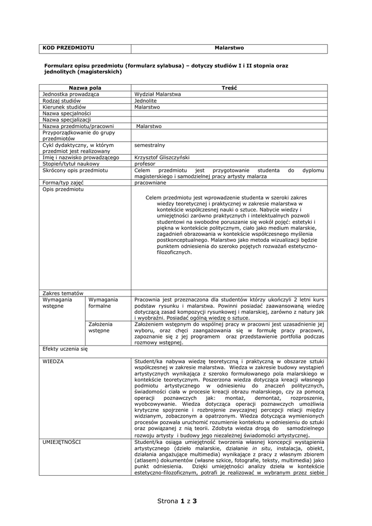 KOD PRZEDMIOTU Malarstwo Formularz opisu przedmiotu (formularz sylabusa) – dotyczy studiów I i II stopnia oraz jednolitych (magisterskich) Nazwa pola Jednostka prowadząca Rodzaj studiów Kierunek studiów Nazwa specjalności Nazwa specjalizacji Nazwa przedmiotu/pracowni Przyporządkowanie do grupy przedmiotów Cykl dydaktyczny, w którym przedmiot jest realizowany Imię i nazwisko prowadzącego Stopień/tytuł naukowy Skrócony opis przedmiotu Forma/typ zajęć Opis przedmiotu Treść Wydział Malarstwa Jednolite Malarstwo Malarstwo semestralny Krzysztof Gliszczyński profesor Celem przedmiotu jest przygotowanie studenta magisterskiego i samodzielnej pracy artysty malarza pracowniane do dyplomu Celem przedmiotu jest wprowadzenie studenta w szeroki zakres wiedzy teoretycznej i praktycznej w zakresie malarstwa w kontekście współczesnej nauki o sztuce. Nabycie wiedzy i umiejętności zarówno praktycznych i intelektualnych pozwoli studentowi na swobodne poruszanie się wokół pojęć: estetyki i piękna w kontekście politycznym, ciało jako medium malarskie, zagadnień obrazowania w kontekście współczesnego myślenia postkonceptualnego. Malarstwo jako metoda wizualizacji będzie punktem odniesienia do szeroko pojętych rozważań estetycznofilozoficznych. Zakres tematów Wymagania wstępne Wymagania formalne Założenia wstępne Pracownia jest przeznaczona dla studentów którzy ukończyli 2 letni kurs podstaw rysunku i malarstwa. Powinni posiadać zaawansowaną wiedzę dotyczącą zasad kompozycji rysunkowej i malarskiej, zarówno z natury jak i wyobraźni. Posiadać ogólną wiedzę o sztuce. Założeniem wstępnym do wspólnej pracy w pracowni jest uzasadnienie jej wyboru, oraz chęci zaangażowania się w formułę pracy pracowni, zapoznanie się z jej programem oraz przedstawienie portfolia podczas rozmowy wstępnej. Efekty uczenia się WIEDZA UMIEJĘTNOŚCI Student/ka nabywa wiedzę teoretyczną i praktyczną w obszarze sztuki współczesnej w zakresie malarstwa. Wiedza w zakresie budowy wystąpień artystycznych wynikająca z szeroko formułowanego pola malarskiego w kontekście teoretycznym. Poszerzona wiedza dotycząca kreacji własnego podmiotu artystycznego w odniesieniu do znaczeń politycznych, świadomości ciała w procesie kreacji obrazu malarskiego, czy za pomocą operacji poznawczych jak: montaż, demontaż, rozproszenie, wyobcowywanie. Wiedza dotycząca operacji poznawczych umożliwia krytyczne spojrzenie i rozbrojenie zwyczajnej percepcji relacji między widzianym, zobaczonym a opatrzonym. Wiedza dotycząca wymienionych procesów pozwala uruchomić rozumienie kontekstu w odniesieniu do sztuki oraz powiązanej z nią teorii. Zdobyta wiedza drogą do samodzielnego rozwoju artysty i budowy jego niezależnej świadomości artystycznej. Student/ka osiąga umiejętność tworzenia własnej koncepcji wystąpienia artystycznego (dzieło malarskie, działanie in situ, instalacja, obiekt, działania angażujące multimedia) wynikające z pracy z własnym zbiorem (atlasem) dokumentów (własne szkice, fotografie, teksty, multimedia) jako punkt odniesienia. Dzięki umiejętności analizy dzieła w kontekście estetyczno-filozoficznym, potrafi je realizować w wybranym przez siebie Strona 1 z 3 sposobie wypowiedzi adekwatnie do realizowanego tematu. Umiejętności warsztatowe są powiązane z kreacją artystyczną i nabywane są w trakcie kolejnych realizacji-zadań. Umiejętność rozumienia istoty materii malarskiej i znaczenia jej formy w kontekście najnowszych badań. Umiejętność widzenia powiązana z wiedzeniem pogłębia znaczenie warsztatu wypowiedzi twórczej. Umiejętność wypracowania własnej techniki w kontekście historycznym, warunkować będzie formę dzieła i wzmagać jego artystyczne działanie. Umiejętność wspólnej dyskusji wokół problemów stawianych w pracowni, pozwoli na zaangażowanie we wspólne projekty i nabywanie umiejętności pracy w zespole. Student zoobligowany jest do przedstawienia krótkiej formy wypowiedzi swojej pracy (pisemnej, ustnej), przedstawianej na forum pracowni oraz jej publicznej prezentacji. Nabywa umiejętności zawodowe: tworzenie projektów, dokumentowania własnej pracy, umiejętność nawiązywania współpracy w obszarze sztuki. KOMPETENCJE SPOŁECZNE (POSTAWY) Punkty ECTS Metody i kryteria oceniania Realizowany program w pracowni w kontekście szeroko postawionych problemów, będzie wskazówką do dalszych samodzielnych studiów dla jakości artystycznej swojej pracy. Podejmowane decyzje artystyczne w oparciu o wiedzę i umiejętność zastosowania jej w praktyce, zapewnią podstawę do konstruowania niezależnych decyzji artystycznych. Umiejętność uzasadnienia swoich wyborów w oparciu o argumenty, daje siłę przekonywania w dyskursie społecznym, zwłaszcza w przypadku realizacji projektów o charakterze partycypacyjnym. Tworzenie portfolia, wystaw, warsztatów, otwartych dyskusji, uczy studentkę/a narzędzi komunikacji społecznej. Ten rodzaj działalności, jest istotnym elementem i sprawdzianem realizowanego programu w praktyce. Spotkania z absolwentami, artystami, kuratorami, naukowcami, wizyty w galeriach i pracowniach, wprowadzają studenta w realny świat sztuki. Student/ka kończąca/y studia wkracza w samodzielne twórcze życie z pełną świadomością funkcjonowania artysty w społeczeństwie. Warunkiem uzyskania zaliczenia oraz przedmiotem oceny jest: Realizacja poszczególnych zadań. Uczestnictwo w wystawach, warsztatach, pokazach, dyskusjach Dokumentacja poszczególnych faz rozwoju realizowanego projektu. Dziennik – szkicownik. Prezentacja w pracowni własnej koncepcji wystąpienia artystycznego. Progres w pracy studenta. . Przedstawienie określonych prac na zakończenie semestru. Zaliczenie z oceną. Sposób zaliczenia Sposób realizacji przedmiotu Język wykładowy Literatura Przegląd końcowy semestralny na którym student prezentuje swoje prace wykonane w ciągu semestru. Ćwi