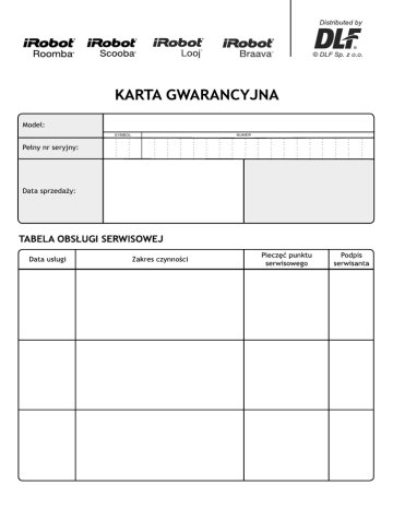 Model: SYMBOL Pełny nr seryjny: Data sprzedaży: NUMER Szanowni Państwo, Dziękujemy za dokonanie zakupu produktu iRobot. Mamy nadzieję, że użytkowanie urządzenia iRobot przyniesie Państwu wiele zadowolenia. Niniejszym udziela się gwarancji na Produkt iRobot określony w Karcie Gwarancyjnej na poniższych zasadach: 1. Niniejsza Karta Gwarancyjna określa warunki udzielenia gwarancji na produkty iRobot. 2. Karta Gwarancyjna uprawnia do skorzystania z serwisu gwarancyjnego świadczonego przez autoryzowany serwis Gwaranta (aktualna lista autoryzowanych serwisów znajduje się na www.irobot.pl) na terenie Rzeczpospolitej Polskiej polegającego na bezpłatnym usunięciu wad fabrycznych lub materiałowych. Warunkiem skorzystania z uprawnień gwarancyjnych jest przedstawienie przez nabywcę: a) Karty Gwarancyjnej. b) Dowodu Zakupu (faktura VAT, paragon fiskalny lub inny dokument poświadczający rzeczywistą datę zakupu), chyba że data zakupu Produktu wynika z Karty Gwarancyjnej. 3. Gwarancja udzielona przez Gwaranta obejmuje wyłącznie produkty iRobot dystrybuowane przez firmę DLF Sp. z o.o. oraz zakupione w Polsce w sklepach zaopatrywanych przez autoryzowane punkty sprzedaży (aktualna lista autoryzowanych punktów sprzedaży znajduje się na www.irobot.pl). 4. Produkt iRobot objęty jest 24 miesięczną gwarancją, której bieg rozpoczyna się od dnia zakupu oryginalnego Produktu objętego gwarancją przez pierwszego użytkownika końcowego tego Produktu. 5. Gwarancja nie obejmuje czynności konserwacyjnych i podobnych przewidzianych w Instrukcji obsługi, do wykonania których użytkownik zobowiązany jest we własnym zakresie. 6. Gwarancją nieobjęte są akcesoria eksploatacyjne, w szczególności takie jak: a) dla iRobot Roomba: szczotki, filtry, diody kontrolek, baterie typu C, baterie typu AA, b) dla iRobot Scooba: szczotka, filtr, ssawka, diody kontrolek, baterie typu C, c) dla iRobot Looj: świder, wyrzutniki, ściągacz gumowy, diody kontrolek, baterie typu AAA, d) dla iRobot Braava: ściereczki z mikrofibry, sączek, baterie typu C, głowice czyszczące, za wyjątkiem akumulatora iRobot będącego akcesorium eksploatacyjnym, który objęty jest 6 miesięczną gwarancją. Gwarancja udzielana na oryginalny akumulator iRobot rozpoczyna się od dnia zakupu oryginalnego Produktu bądź oryginalnego akumulatora, w przypadku zakupu wyłącznie akumulatora, przez pierwszego użytkownika końcowego tego Produktu lub akumulatora. Każde podlegające ochronie gwarancyjnej akcesorium eksploatacyjne, o którym mowa w niniejszym punkcie podlega bezpłatnej wymianie w przypadku wady fabrycznej lub materiałowej. 7. Koszty związane z dostarczeniem Produktu do autoryzowanego serwisu i odbiorem tego Produktu z autoryzowanego serwisu i dostarczeniem go do osoby uprawnionej z tytułu niniejszej gwarancji obciążają Gwaranta. 8. Zgłoszenie wady fizycznej objętej gwarancją zostanie rozpatrzone niezwłocznie, nie później niż w terminie 14 dni, licząc od dnia dostarczenia rzeczy przez uprawnionego z gwarancji. 9. Wady materiałowe i fabryczne zostaną usunięte w okresie gwarancji bezpłatnie. 10. Gwarancja nie obejmuje: a) uszkodzeń mechanicznych powstałych z winy użytkownika i wad Produktu spowodowanych tymi uszkodzeniami, b) uszkodzeń spowodowanych niezgodnym z Instrukcją obsługi sposobem użytkowania Produktu. 11. Uprawnienia z tytułu gwarancji wygasają w przypadku: a) usunięcia numeru seryjnego z Produktu, b) podjęcia czynności prowadzących do usunięcia wady fabrycznej lub materiałowej Produktu poza autoryzowanym serwisem, c) wykorzystywania nieoryginalnych części i akcesoriów eksploatacyjnych. 12. Gwarancja na sprzedany towar konsumpcyjny nie wyłącza, nie ogranicza ani nie zawiesza uprawnień kupującego wobec sprzedawcy, wynikających z niezgodności towaru z umową. 13. Zobowiązania Gwaranta wynikające z niniejszej gwarancji obowiązują w granicach Rzeczypospolitej Polskiej. GWARANT: Autoryzowany importer i dystrybutor urządzeń iRobot w Polsce: DLF Sp. z o.o. 81-529 Gdynia, ul. Inżynierska 87 tel. +48 58 781 43 63, fax +48 58 781 43 65 e-mail: [email protected] www.dlf.pl CENTRUM AUTORYZOWANEGO SERWISU: Infolinia: 801 88 99 99* z tel. kom. +48 58 781 66 62 e-mail: [email protected] Lista punktów autoryzowanego serwisu dostępna jest na stronie: www.irobot.pl www.irobot.pl *koszt połączenia jak za 1 impuls wg taryfy operatora 2014/09
