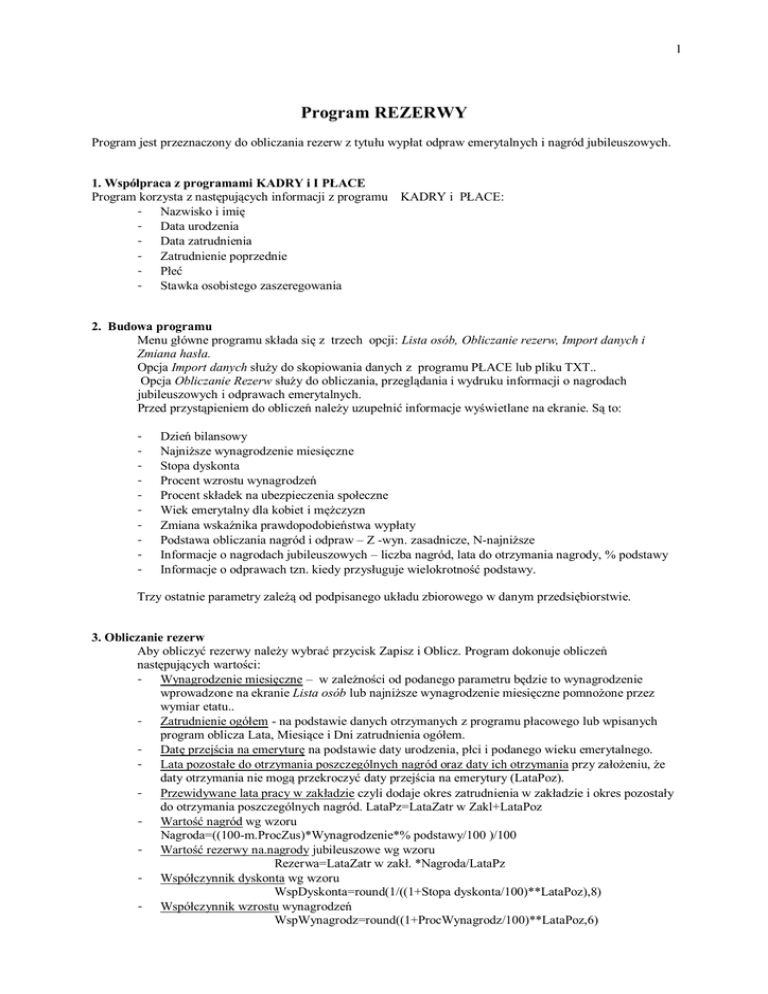 1 Program REZERWY Program jest przeznaczony do obliczania rezerw z tytułu wypłat odpraw emerytalnych i nagród jubileuszowych. 1. Współpraca z programami KADRY i I PŁACE Program korzysta z następujących informacji z programu KADRY i PŁACE: - Nazwisko i imię - Data urodzenia - Data zatrudnienia - Zatrudnienie poprzednie - Płeć - Stawka osobistego zaszeregowania 2. Budowa programu Menu główne programu składa się z trzech opcji: Lista osób, Obliczanie rezerw, Import danych i Zmiana hasła. Opcja Import danych służy do skopiowania danych z programu PŁACE lub pliku TXT.. Opcja Obliczanie Rezerw służy do obliczania, przeglądania i wydruku informacji o nagrodach jubileuszowych i odprawach emerytalnych. Przed przystąpieniem do obliczeń należy uzupełnić informacje wyświetlane na ekranie. Są to: - Dzień bilansowy Najniższe wynagrodzenie miesięczne Stopa dyskonta Procent wzrostu wynagrodzeń Procent składek na ubezpieczenia społeczne Wiek emerytalny dla kobiet i mężczyzn Zmiana wskaźnika prawdopodobieństwa wypłaty Podstawa obliczania nagród i odpraw – Z -wyn. zasadnicze, N-najniższe Informacje o nagrodach jubileuszowych – liczba nagród, lata do otrzymania nagrody, % podstawy Informacje o odprawach tzn. kiedy przysługuje wielokrotność podstawy. Trzy ostatnie parametry zależą od podpisanego układu zbiorowego w danym przedsiębiorstwie. 3. Obliczanie rezerw Aby obliczyć rezerwy należy wybrać przycisk Zapisz i Oblicz. Program dokonuje obliczeń następujących wartości: - Wynagrodzenie miesięczne – w zależności od podanego parametru będzie to wynagrodzenie wprowadzone na ekranie Lista osób lub najniższe wynagrodzenie miesięczne pomnożone przez wymiar etatu.. - Zatrudnienie ogółem - na podstawie danych otrzymanych z programu płacowego lub wpisanych program oblicza Lata, Miesiące i Dni zatrudnienia ogółem. - Datę przejścia na emeryturę na podstawie daty urodzenia, płci i podanego wieku emerytalnego. - Lata pozostałe do otrzymania poszczególnych nagród oraz daty ich otrzymania przy założeniu, że daty otrzymania nie mogą przekroczyć daty przejścia na emerytury (LataPoz). - Przewidywane lata pracy w zakładzie czyli dodaje okres zatrudnienia w zakładzie i okres pozostały do otrzymania poszczególnych nagród. LataPz=LataZatr w Zakl+LataPoz - Wartość nagród wg wzoru Nagroda=((100-m.ProcZus)*Wynagrodzenie*% podstawy/100 )/100 - Wartość rezerwy na.nagrody jubileuszowe wg wzoru Rezerwa=LataZatr w zakł. *Nagroda/LataPz - Współczynnik dyskonta wg wzoru WspDyskonta=round(1/((1+Stopa dyskonta/100)**LataPoz),8) - Współczynnik wzrostu wynagrodzeń WspWynagrodz=round((1+ProcWynagrodz/100)**LataPoz,6) 2 - Prawdopodobieństwo zatrudnienia WskPrawdopodZatr= wg tabeli - Ostateczną rezerwę wg wzoru Rezerwa=Rezerwa*WspółczynnikDyskonta*Współczynnik wzrostu wynagr*Wkaźnik prawd./100 - Lata pozostałe do przejścia na emeryturę (LataPoze) - Przewidywane lata pracy w zakładzie czyli okres zatrudnienia plus lata pozostałe do przejścia na emeryturę (LataPze) - Odprawę emerytalną uwzględniając wynagrodzenie, staż pracy i podany współczynnik dla stażu pracy wg wzoru Odprawa=(100-ProcZus)*Wynagrodzenie*Krotnośc/100 - Rezerwę wg wzoru Rezerwa=Odprawa*LataZatr w zakł./LataPze - Współczynniki dyskonta, wzrostu i prawdopodobieństwo zatrudnienia analogicznie jak w nagrodach jubileuszowych - Ostateczną rezerwę wg wzoru Rezerwa=Rezerwa*WspółczynnikDyskonta*Współczynnik wzrostu wynagr*Wkaźnik prawd./100 Obliczenia są powtórzone dla wszystkich nagród i wszystkich pracowników. Kwota ogólna rezerw jest wyświetlana na ekranie. 4. Przeglądanie i wydruki Program umożliwia utworzenie następujących zestawień: - Terminy nagród jubileuszowych - Rezerwy z tytułu wypłat nagród jubileuszowych - Rezerwy z tytułu odpraw emerytalnych - Lista nagród jubileuszowych w wybranym roku - Lista odpraw emerytalnych w wybranym roku Wymienione zestawienia można wydrukować lub przeglądać na ekranie UWAGA! Wyliczenia rezerwy należy dokonać wg stanu na początek i koniec okresu bilansowego. Różnica pomiędzy wyliczonymi stanami rezerw podlega zaliczeniu w ciężar kosztów (wyniku) danego roku.
