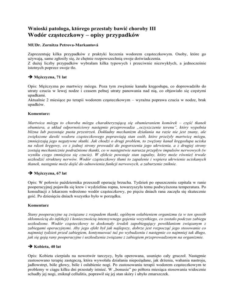 Wnioski patologa, którego przestały bawić choroby III Wodór cząsteczkowy – opisy przypadków MUDr. Zornitza Petrova-Markantová Zaprezentuję kilka przypadków z praktyki leczenia wodorem cząsteczkowym. Osoby, które go używają, same zgłosiły się, że chętnie rozpowszechnią swoje doświadczenia. Z dużej liczby przypadków wybrałam kilka typowych i przeciwnie niezwykłych, a jednocześnie istotnych poprzez swoje tło. Mężczyzna, 71 lat Opis: Mężczyzna po martwicy mózgu. Poza tym zwężenie kanału kręgosłupa, co doprowadziło do utraty czucia w lewej nodze i czasem pełnej utraty panowania nad nią, co objawiało się częstymi upadkami. Aktualnie 2 miesiące po terapii wodorem cząsteczkowym – wyraźna poprawa czucia w nodze, brak upadków. Komentarz: Martwica mózgu to choroba mózgu charakteryzującą się obumieraniem komórek – część tkanek obumiera, a układ odpornościowy następnie przeprowadza „oczyszczenie terenu”, który wypełnia blizna lub pozostaje pusta przestrzeń. Dokładny mechanizm działania na razie nie jest znany, ale zwiększone dawki wodoru cząsteczkowego poprawiają stan osób, które przeżyły martwicę mózgu, zmniejszają jego negatywne skutki. Jak chodzi o drugi problem, to zwężony kanał kręgosłupa uciska na rdzeń kręgowy, co z jednej strony prowadzi do pogorszenia jego ukrwienia, a z drugiej strony zostają mechanicznie podrażnione tkanki, co w następstwie narusza przepływ impulsów nerwowych (w wyniku czego zmniejsza się czucie). W efekcie powstaje stan zapalny, który może również trwale uszkodzić strukturę nerwów. Wodór cząsteczkowy tłumi to zapalenie i wspiera ukrwienie uciskanych tkanek, następnie może dojść do odnowienia funkcji nerwowych, a zaburzenie zniknie. Mężczyzna, 67 lat Opis: W połowie października przeszedł operację brzucha. Tydzień po opuszczeniu szpitala w ranie pooperacyjnej pojawiła się krew i wydzielina ropna, towarzyszyła temu podwyższona temperatura. Po konsultacji z lekarzem wdrożono wodór cząsteczkowy, po pięciu dniach rana zaczęła się skutecznie goić. Po dziesięciu dniach wszystko było w porządku. Komentarz Stany pooperacyjne są związane z rozpadem tkanki, ogólnym osłabieniem organizmu (a w ten sposób skłonnością do infekcji) i koniecznością intensywnego gojenia wszystkiego, co zostało podczas zabiegu uszkodzone. Wodór cząsteczkowy to doskonały środek zapobiegający powikłaniom związanym z zabiegami operacyjnymi. Aby jego efekt był jak najlepszy, dobrze jest rozpocząć jego stosowanie co najmniej tydzień przed zabiegiem, kontynuować tuż po wybudzeniu i następnie co najmniej tak długo, jak się goją rany pooperacyjne i uszkodzenia związane z zabiegiem przeprowadzonym na organizmie. Kobieta, 40 lat Opis: Kobieta cierpiała na nowotwór tarczycy, była operowana, usunięto cały gruczoł. Następnie zastosowano terapię zastępczą, która wywołała działania niepożądane, jak drżenia, wahania nastroju, jadłowstręt, bóle głowy, bóle i osłabienie nogi. Po zastosowaniu terapii wodorem cząsteczkowym te problemy w ciągu kilku dni przestały istnieć. W „bonusie” po półtora miesiąca stosowania widocznie schudły jej nogi, zniknął cellulitis, poprawił się jej stan skóry i ubyło zmarszczek. Kobieta, 30 lat Opis: W styczniu 2013 roku włączono leczenie w związku z niedoczynnością tarczycy (Euthyrox 75). Po tym leku wzrost wagi o ok. 5 kg. Ciągłe zmęczenie, bezsenność, bóle głowy i stawów. W sierpniu 2013 roku początek stosowania wodoru cząsteczkowego, potem istotna poprawa stanu zdrowia, znaczne zwiększenie energii fizycznej i duchowej oraz spadek wagi o 4 kg. Teraz kontynuuje stosowanie dawki podtrzymującej. Komentarz: Hormonalna terapia zastępcza gruczołu tarczycowego może być bardzo trudna. W normalnych okolicznościach organizm produkuje dokładnie tyle hormonów, ile potrzebuje, podczas gdy w tabletkach regularnie dostarczamy określoną ich ilość. To nienaturalny rytm obciążenia hormonami. Ponadto jeśli organizm musiał radzić sobie z następstwami zgubnej choroby i operacji, następstwa mogą się pojawić z jeszcze większą siłą. Wodór cząsteczkowy pomaga pozbyć się substancji wydalanych w procesach metabolicznych nowotworu i w następstwie operacji. Ponadto zwiększa zdolność organizmu do pokonania obciążenia, które pojawia się w następstwie stosowania leków. U pacjentki efekt okazał się bardzo dobry, ponieważ, jak sama opisuje, bardzo szybko pojawiły się i efekty kosmetyczne: poprawa jędrności skóry, zmniejszenie liczby zmarszczek i objawów cellulitisu. Mężczyzna, 35 lat Od maja 2013 roku stosował wodór cząsteczkowy najpierw przez miesiąc w zwiększonych dawkach, potem w podtrzymujących. Zniknął katar sienny (reakcja alergiczna na pyłki) i przestał stosować środki przeciwhistaminowe. Jako człowiek, który z przyjemnością uprawia sport (bieganie, turystyka), w ciągu 9 miesięcy stracił niemal 23 kg. Mężczyzna, wieku nie podano, przysłano z Wielkiej Brytanii „Wodór cząsteczkowy zacząłem stosować we wrześniu 2013 roku, kiedy przygotowywałem się do sezonu triatlonowego. Jako człowiek, który trenuje i rywalizuje w sporcie już od dekad, nie oczekiwałem żadnych dużych wyników. Jednak byłem zszokowany. W ciągu dziewięciomiesięcznego treningu rzadko zdarzało się, aby mnie bolały stawy lub gromadził się kwas mlekowy zarówno na treningu, jak i w trakcie rywalizacji. Również po godzinnym treningu, kiedy człowiek w normalnych warunkach, zaczyna sięgać po „głębokie rezerwy”, ja łapałem drugi oddech i byłem w stanie pracować jeszcze na zwiększonych obrotach. Moje postępy w tym sezonie są niewiarygodne. Niczego podobnego nie widziałem przez ostatnie 18 lat”. Komentarz Wodór cząsteczkowy jest bardzo przydatny dla sportowców, ponieważ pomaga w szybkim usuwaniu głównie kwasu mlekowego z mięśni, a 