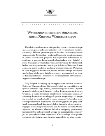 B i b l i o t e k a K o m p a n i i W o l t y ż e r ó w Wyposażenie osobiste żołnierza Armii Xięstwa Warszawskiego Zasadniczym elementem ekwipunku, często traktowanym po macoszemu przez rekonstruktorów, jest wyposażenie osobiste żołnierzy. Wbrew pozorom jest to bardzo interesująca część wyposażenia. Jej analiza i znajomość pozwala lepiej zrozumieć w jakich warunkach przyszło funkcjonować żołnierzom na co dzień, w rutynie koszarowych obowiązków jak i działań w polu. Niniejszy artykuł stanowi zaledwie wstęp do właściwych badań nad wyposażeniem osobistym żołnierzy Księstwa, które z czasem mam nadzieję zostaną przeprowadzone. Pomocna w tym względzie będzie na pewno rekonstrukcja historyczna, będąca ciekawym źródłem uwag i spostrzeżeń na temat funkcjonalności i możliwości wykorzystania ekwipunku i wyposażenia osobistego. Cały dobytek składający się na wyposażenie osobiste żołnierza Księstwa Warszawskiego dźwigany był, jak we wszystkich praktycznie armiach tego okresu, przez samego żołnierza. Sposób prowadzenia kampanii i często trudny do oszacowania ich czas trwania, a także ówczesne możliwości techniczne zmuszały żołnierzy do noszenia ze sobą praktycznie wszystkiego, co mogło się przydać na biwaku bądź w czasie marszu. To banalne z pozoru spostrzeżenie zbyt często jest nieuwzględniane przy analizach poszczególnych kampanii. Jakże inaczej z tej perspektywy wygląda marsz korpusu Davouta pod Austerlitz czy całej Wielkiej Armii na Moskwę. Marian Kukiel w swej pracy poświęconej kampanii 1812 roku zwracał uwagę na przeciążenie żołnierzy już na początku działań wojennych. Ciężar całego ekwipunku żołnierza piechoty, wraz z bronią, wynosił ok. 25 kilogramów . B i b l i o t e k a K o m p a n i i W o l t y ż e r ó w Jak widać więc poza analizą ruchów wojsk i rodzaju broni, jaką się one posługiwały, warto czasami przeanalizować, na jakie wycieńczenie narażeni byli żołnierze. Żołnierz Księstwa Warszawskiego transportował swój dobytek w plecaku. Mogły być to plecaki francuskie, pruskie (formą przypominające raczej chlebaki), bądź polskie szyte na wzór francuski (?). Wiadomo, że w armii Księstwa po kampanii 1809 roku wykorzystywana była broń i mundury austriackie - może dotyczyło to także plecaków? Plecak wykonany z cielęcej (rzadziej końskiej) skóry, z włosiem wywiniętym na zewnątrz skierowanym ku dołowi co w dodatkowy sposób zabezpiecza wnętrze plecaka przed zamoknięciem (niestety często przy okazji rekonstrukcji zapomina się o tej zasadzie). Posiadał troki i dwa paski na ramiona. Istniały trzy rodzaje plecaków francuskich różniących się nieznacznie rozmiarami. Określano je mianem 39, 36 i 33 calowych z czego liczba w calach oznacza minimalną długość płata skóry cielęcej, z jakiego dany plecak był wykonany. Średnia pojemność plecaka jest oceniana na co najmniej 13 litrów . Biorąc pod uwagę pojemność współczesnych plecaków wydaje się to być niewiele, przy pakowaniu należy więc skupić się na niezbędnych rzeczach.. Plecaki wzoru francuskiego posiadały wewnątrz podszewkę dzielącą wnętrze na trzy przegrody. Możliwe, że korzystano także z plecaków bez podziału wewnątrz na przegrody. Trudno powiedzieć, jakie były plecaki używane przez armię Księstwa. W rekonstrukcji jak na razie (nie wiadomo czy słusznie) przyjęło się, że korzystamy z plecaków „jednokomorowych”. Co do funkcjonalności tych plecaków wśród rekonstruktorów panują rozbieżne opinie. Konstrukcja plecaka sprawia, że choć trzyma on swój fason, to nieumiejętne zapakowanie potrafi jednak spowodować zdefasonowanie a - co za tym idzie - poważnie wpłynąć na „komfort” użytkowania. Sposób mocowania pasków nośnych do samego plecaka sprawia, że ma on tendencję do odstawania od pleców. Dolna partia plecaka przylega do krzyża, podczas gdy jego gór- B i b l i o t e k a K o m p a n i i W o l t y ż e r ó w na część odchyla się od powierzchni pleców, tak że patrząc z boku przestrzeń pomiędzy plecakiem a plecami żołnierza ma kształt zbliżony do litery „V”. Wartość kąta pomiędzy plecami a plecakiem zależy od ciężaru plecaka i budowy fizycznej żołnierza. Doświadczenia rekonstrukcyjne doprowadziły do opracowania polowej metody eliminującej tę właściwość. Polega ona na przewleczeniu pasków nośnych przez troki plecaka i dopiero w takim układzie założenia go na plecy. Plecak wtedy niezależnie od wagi i budowy fizycznej żołnierza, przylega dokładnie do pleców. Biorąc pod uwagę ryciny z epoki, można z dużą dozą prawdopodobieństwa założyć, że tą samą metodę musieli opracować ówcześni żołnierze. Możliwe także, że odstawanie plecaka wynika z faktu, że górna cześć szelek jest niewłaściwie przymocowywana we współczesnych rekonstrukcjach. Należałoby fakt ten dokładniej zbadać. Plecak jest dość pojemny i z zabraniem niezbędnego minimum nie powinno być najmniejszego problemu. Należy jednak zauważyć, że podany poniżej przykładowy zestaw wyposażenia plecaka wypełnia go praktycznie w zupełności. Nic dziwnego zatem, że nie raz w pamiętnikach natrafia się na opisy wyrzucania przez żołnierzy części swego ekwipunku, aby móc spakować jakieś zrabowane drogocenne przedmioty. Ciekawe, że w książeczce wojskowej nie wyszczególniono żadnych przedmiotów stanowiących wyposażenie plecaka. Wydaje się więc, że żołnierze wyposażali się we własnym zakresie. Z drugiej strony znane są przeglądy dokonywane przez dowódców sprawdzających właśnie zawartość plecaka, czy żołnierz posiada wszystko to, czego mu potrzeba. Zasadniczo rzeczy składające się na zawartość plecaka można podzielić na trzy kategorie: rzeczy, które żołnierz posiadać musiał (wg regulaminu), posiadać powinien i posiadać mógł. Oczywiście taki podział jest do