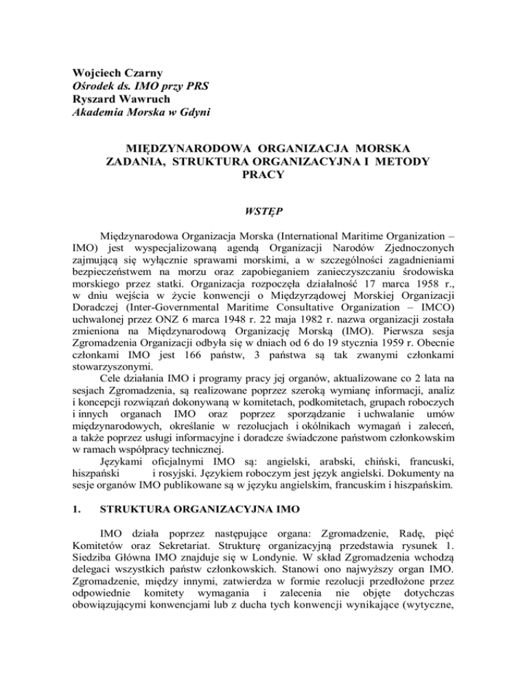 Wojciech Czarny Ośrodek ds. IMO przy PRS Ryszard Wawruch Akademia Morska w Gdyni MIĘDZYNARODOWA ORGANIZACJA MORSKA ZADANIA, STRUKTURA ORGANIZACYJNA I METODY PRACY WSTĘP Międzynarodowa Organizacja Morska (International Maritime Organization – IMO) jest wyspecjalizowaną agendą Organizacji Narodów Zjednoczonych zajmującą się wyłącznie sprawami morskimi, a w szczególności zagadnieniami bezpieczeństwem na morzu oraz zapobieganiem zanieczyszczaniu środowiska morskiego przez statki. Organizacja rozpoczęła działalność 17 marca 1958 r., w dniu wejścia w życie konwencji o Międzyrządowej Morskiej Organizacji Doradczej (Inter-Governmental Maritime Consultative Organization – IMCO) uchwalonej przez ONZ 6 marca 1948 r. 22 maja 1982 r. nazwa organizacji została zmieniona na Międzynarodową Organizację Morską (IMO). Pierwsza sesja Zgromadzenia Organizacji odbyła się w dniach od 6 do 19 stycznia 1959 r. Obecnie członkami IMO jest 166 państw, 3 państwa są tak zwanymi członkami stowarzyszonymi. Cele działania IMO i programy pracy jej organów, aktualizowane co 2 lata na sesjach Zgromadzenia, są realizowane poprzez szeroką wymianę informacji, analiz i koncepcji rozwiązań dokonywaną w komitetach, podkomitetach, grupach roboczych i innych organach IMO oraz poprzez sporządzanie i uchwalanie umów międzynarodowych, określanie w rezolucjach i okólnikach wymagań i zaleceń, a także poprzez usługi informacyjne i doradcze świadczone państwom członkowskim w ramach współpracy technicznej. Językami oficjalnymi IMO są: angielski, arabski, chiński, francuski, hiszpański i rosyjski. Językiem roboczym jest język angielski. Dokumenty na sesje organów IMO publikowane są w języku angielskim, francuskim i hiszpańskim. 1. STRUKTURA ORGANIZACYJNA IMO IMO działa poprzez następujące organa: Zgromadzenie, Radę, pięć Komitetów oraz Sekretariat. Strukturę organizacyjną przedstawia rysunek 1. Siedziba Główna IMO znajduje się w Londynie. W skład Zgromadzenia wchodzą delegaci wszystkich państw członkowskich. Stanowi ono najwyższy organ IMO. Zgromadzenie, między innymi, zatwierdza w formie rezolucji przedłożone przez odpowiednie komitety wymagania i zalecenia nie objęte dotychczas obowiązującymi konwencjami lub z ducha tych konwencji wynikające (wytyczne, instrukcje, interpretacje rozszerzające i inne), a dotyczące przede wszystkim bezpieczeństwa na morzu, zapobiegania zanieczyszczaniu środowiska morskiego oraz związanych z tym zagadnień organizacyjnych, finansowych i prawnych. Ważne w tym kontekście okazują się sprawy ogólnoświatowej standaryzacji rozwiązań technicznych celem zapewnienia takiego samego poziomu bezpieczeństwa i niezawodności wyposażenia statkowego oraz ujednolicenia technologii obsługi statków w portach świata. Rada jest organem zarządzającym w okresie dwuletnim między sesjami Zgromadzenia. W jej skład wchodzi 40 państw członkowskich wybieranych przez Zgromadzenie na okres dwóch lat. W ramach IMO działają następujące komitety: 1. Komitet Bezpieczeństwa na Morzu (MSC) zajmujący się sprawami technicznymi związanymi z bezpieczeństwem na morzu. 2. Komitet Ochrony Środowiska Morskiego (MEPC) prowadzący działalność w zakresie spraw związanych z zapobieganiem i kontrolą zanieczyszczeń środowiska morskiego ze statków. 3. Komitet Prawny (LEG) rozpatrujący wszelkie sprawy prawne wynikające z zakresu działalności IMO. 4. Komitet Ułatwień (FAL) działający w dziedzinach związanych z ułatwieniami międzynarodowego handlu morskiego i przewozu pasażerów. Działalność ta ma na celu ograniczenie formalności, uproszczenie wymaganej dokumentacji i usprawnienie obsługi statków w portach. 5. Komitet Współpracy Technicznej (TC) koordynujący prace IMO w zakresie zapewnienia pomocy technicznej w dziedzinie gospodarki morskiej, zwłaszcza krajom rozwijającym się. Komitety MSC i MEPC realizuje swoje zadania przy pomocy Podkomitetów, które zostały powołane w celu wykonania prac w określonych dziedzinach. Obecnie działają Podkomitety do spraw: Bezpieczeństwa Żeglugi (NAV), Cieczy i Gazów Przewożonych Luzem (BLG), Konstrukcji i Wyposażenia Statku (DE), Ochrony Przeciwpożarowej (FP), Przewozu Towarów Niebezpiecznych, Ładunków Stałych i Kontenerów (DSC), Radiokomunikacji oraz Poszukiwań i Ratownictwa (COMSAR), Stateczności i Linii Ładunkowych oraz Bezpieczeństwa Statków Rybackich (SLF), Szkolenia Zawodowego i Obowiązków Wachtowych (STW), Wdrażania Konwencji (FSI). MSC i MEPC są komitetami prawotwórczymi tzn. uprawnionymi do wprowadzania poprawek do konwencji, dla których z polecenia Sekretarza Generalnego IMO spełniają rolę depozytariusza. Oprócz formalnych poprawek („Adoption of Amendments to...”), komitety te uchwalają rezolucje uzupełniające konwencje o szczegółowe wytyczne ułatwiające ich wdrożenie (np. warunki techniczne wykonania i odbioru urządzeń), publikują okólniki informacyjno- instruktywne, zapewniają ciągłą nowelizację prawideł zapisanych w konwencjach i ich poprawną tj. zgodną z intencjami prawodawcy, interpretację. Komitety LEG, TC i FAL są organami konsultacyjnymi dla Rady IMO. Komitet FAL stanie się być może w najbliższym czasie również organem prawotwórczym. Decyzja w tym zakresie jest uzależniona od wejścia w życie poprawek do Konwencji FAL zawartych w rezolucji A.724(17), które wymagają formalnej ich ratyfikacji przez państwa członkowskie IMO. Sekretariat jest kierowany przez Sekretarza Generalnego, a prace Sekretariatu są wykonywane w sześciu specjalistycznych działach. Stanowisko Sekretarza Generalnego zajmuje od 2004 roku Efthimios Mitropoulos z Grecji. 2. FORMY DZIAŁANIA IMO Podstawowym zadaniem IMO jest opracowywanie i uchwalanie postanowień w sprawach wyznaczonych organizacji we wspomnianej już konwencji ONZ o IMCO z 6 marca 1948 r. Działania legislacyjne w dziedzinach bezpieczeństwa żeg