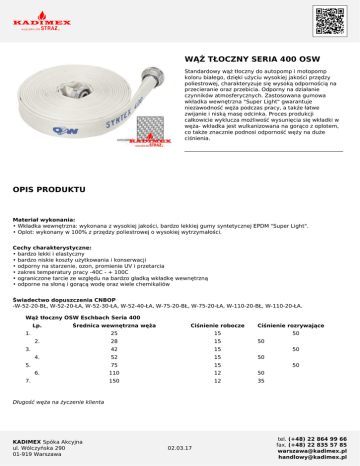 WĄŻ TŁOCZNY SERIA 400 OSW Standardowy wąż tłoczny do autopomp i motopomp koloru białego, dzięki użyciu wysokiej jakości przędzy poliestrowej, charakteryzuje się wysoką odpornością na przecieranie oraz przebicia. Odporny na działanie czynników atmosferycznych. Zastosowana gumowa wkładka wewnętrzna "Super Light" gwarantuje niezawodność węża podczas pracy, a także łatwe zwijanie i niską masę odcinka. Proces produkcji całkowicie wyklucza możliwość wysunięcia się wkładki w węża- wkładka jest wulkanizowana na gorąco z oplotem, co także znacznie podnosi odporność węży na duże ciśnienia. OPIS PRODUKTU Materiał wykonania: • Wkładka wewnętrzna: wykonana z wysokiej jakości, bardzo lekkiej gumy syntetycznej EPDM "Super Light". • Oplot: wykonany w 100% z przędzy poliestrowej o wysokiej wytrzymałości. Cechy charakterystyczne: • bardzo lekki i elastyczny • bardzo niskie koszty użytkowania i konserwacji • odporny na starzenie, ozon, promienie UV i przetarcia • zakres temperatury pracy -40C - + 100C • ograniczone tarcie ze względu na bardzo gładką wkładkę wewnętrzną • odporne na słoną i gorącą wodę oraz wiele chemikaliów Świadectwo dopuszczenia CNBOP -W-52-20-BŁ, W-52-20-ŁA, W-52-30-ŁA, W-52-40-ŁA, W-75-20-BŁ, W-75-20-ŁA, W-110-20-BŁ, W-110-20-ŁA. Wąż tłoczny OSW Eschbach Seria 400 Lp. Średnica wewnętrzna węża Ciśnienie robocze 25 15 28 15 42 15 52 15 75 15 110 12 50 150 12 35 1. 2. 3. 4. 5. 6. 7. Ciśnienie rozrywające 50 50 50 50 50 Długość węża na życzenie klienta KADIMEX Spóka Akcyjna ul. Wólczyńska 290 01-919 Warszawa 02.03.17 tel. (+48) 22 864 99 66 fax. (+48) 22 835 57 85 [email protected] [email protected] DODATKOWE INFORMACJE Średnica wewnętrzna węża [mm] KADIMEX Spóka Akcyjna ul. Wólczyńska 290 01-919 Warszawa 25 mm, 38 mm, 42 mm, 52 mm, 75 mm, 110 mm, 150 mm 02.03.17 tel. (+48) 22 864 99 66 fax. (+48) 22 835 57 85 [email protected] [email protected]