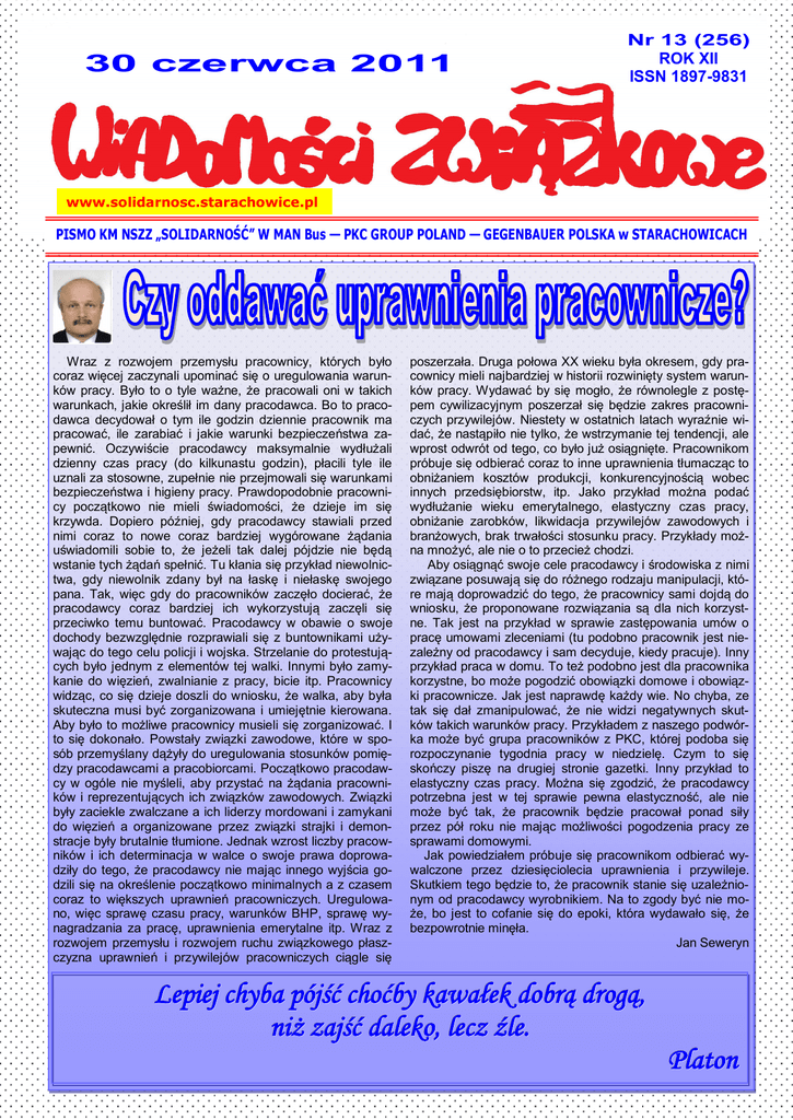 30 czerwca 2011 Nr 13 (256) ROK XII ISSN 1897-9831 www.solidarnosc.starachowice.pl PISMO KM NSZZ „SOLIDARNOŚĆ” W MAN Bus — PKC GROUP POLAND — GEGENBAUER POLSKA w STARACHOWICACH Wraz z rozwojem przemysłu pracownicy, których było coraz więcej zaczynali upominać się o uregulowania warunków pracy. Było to o tyle ważne, że pracowali oni w takich warunkach, jakie określił im dany pracodawca. Bo to pracodawca decydował o tym ile godzin dziennie pracownik ma pracować, ile zarabiać i jakie warunki bezpieczeństwa zapewnić. Oczywiście pracodawcy maksymalnie wydłużali dzienny czas pracy (do kilkunastu godzin), płacili tyle ile uznali za stosowne, zupełnie nie przejmowali się warunkami bezpieczeństwa i higieny pracy. Prawdopodobnie pracownicy początkowo nie mieli świadomości, że dzieje im się krzywda. Dopiero później, gdy pracodawcy stawiali przed nimi coraz to nowe coraz bardziej wygórowane żądania uświadomili sobie to, że jeżeli tak dalej pójdzie nie będą wstanie tych żądań spełnić. Tu kłania się przykład niewolnictwa, gdy niewolnik zdany był na łaskę i niełaskę swojego pana. Tak, więc gdy do pracowników zaczęło docierać, że pracodawcy coraz bardziej ich wykorzystują zaczęli się przeciwko temu buntować. Pracodawcy w obawie o swoje dochody bezwzględnie rozprawiali się z buntownikami używając do tego celu policji i wojska. Strzelanie do protestujących było jednym z elementów tej walki. Innymi było zamykanie do więzień, zwalnianie z pracy, bicie itp. Pracownicy widząc, co się dzieje doszli do wniosku, że walka, aby była skuteczna musi być zorganizowana i umiejętnie kierowana. Aby było to możliwe pracownicy musieli się zorganizować. I to się dokonało. Powstały związki zawodowe, które w sposób przemyślany dążyły do uregulowania stosunków pomiędzy pracodawcami a pracobiorcami. Początkowo pracodawcy w ogóle nie myśleli, aby przystać na żądania pracowników i reprezentujących ich związków zawodowych. Związki były zaciekle zwalczane a ich liderzy mordowani i zamykani do więzień a organizowane przez związki strajki i demonstracje były brutalnie tłumione. Jednak wzrost liczby pracowników i ich determinacja w walce o swoje prawa doprowadziły do tego, że pracodawcy nie mając innego wyjścia godzili się na określenie początkowo minimalnych a z czasem coraz to większych uprawnień pracowniczych. Uregulowano, więc sprawę czasu pracy, warunków BHP, sprawę wynagradzania za pracę, uprawnienia emerytalne itp. Wraz z rozwojem przemysłu i rozwojem ruchu związkowego płaszczyzna uprawnień i przywilejów pracowniczych ciągle się poszerzała. Druga połowa XX wieku była okresem, gdy pracownicy mieli najbardziej w historii rozwinięty system warunków pracy. Wydawać by się mogło, że równolegle z postępem cywilizacyjnym poszerzał się będzie zakres pracowniczych przywilejów. Niestety w ostatnich latach wyraźnie widać, że nastąpiło nie tylko, że wstrzymanie tej tendencji, ale wprost odwrót od tego, co było już osiągnięte. Pracownikom próbuje się odbierać coraz to inne uprawnienia tłumacząc to obniżaniem kosztów produkcji, konkurencyjnością wobec innych przedsiębiorstw, itp. Jako przykład można podać wydłużanie wieku emerytalnego, elastyczny czas pracy, obniżanie zarobków, likwidacja przywilejów zawodowych i branżowych, brak trwałości stosunku pracy. Przykłady można mnożyć, ale nie o to przecież chodzi. Aby osiągnąć swoje cele pracodawcy i środowiska z nimi związane posuwają się do różnego rodzaju manipulacji, które mają doprowadzić do tego, że pracownicy sami dojdą do wniosku, że proponowane rozwiązania są dla nich korzystne. Tak jest na przykład w sprawie zastępowania umów o pracę umowami zleceniami (tu podobno pracownik jest niezależny od pracodawcy i sam decyduje, kiedy pracuje). Inny przykład praca w domu. To też podobno jest dla pracownika korzystne, bo może pogodzić obowiązki domowe i obowiązki pracownicze. Jak jest naprawdę każdy wie. No chyba, ze tak się dał zmanipulować, że nie widzi negatywnych skutków takich warunków pracy. Przykładem z naszego podwórka może być grupa pracowników z PKC, której podoba się rozpoczynanie tygodnia pracy w niedzielę. Czym to się skończy piszę na drugiej stronie gazetki. Inny przykład to elastyczny czas pracy. Można się zgodzić, że pracodawcy potrzebna jest w tej sprawie pewna elastyczność, ale nie może być tak, że pracownik będzie pracował ponad siły przez pół roku nie mając możliwości pogodzenia pracy ze sprawami domowymi. Jak powiedziałem próbuje się pracownikom odbierać wywalczone przez dziesięciolecia uprawnienia i przywileje. Skutkiem tego będzie to, że pracownik stanie się uzależnionym od pracodawcy wyrobnikiem. Na to zgody być nie może, bo jest to cofanie się do epoki, która wydawało się, że bezpowrotnie minęła. Jan Seweryn Lepiej chyba pójść choćby kawałek dobrą drogą, niż zajść daleko, lecz źle. Platon NR 13 (256) Informacje Komisji Międzyzakładowej 30.06.2011 2 Będą rozpoczynać pracę…w niedzielę Spór zbiorowy w MAN Bus trwa Przez długi czas udawało nam się blokować pomysł Zarządu PKC co do rozpoczynania tygodnia pracy w niedzielę na trzeciej zmianie. Wprawdzie wbrew Regulaminowi Pracy kierownicy nakazywali pracownikom przychodzenie na trzecią zmianę, ale robili to bezprawnie a pracownicy często odmawiali przychodzenia na tę zmianę i nie ponieśli z tego powodu żadnych konsekwencji. Widząc, co się dzieje zgłosiliśmy sprawę łamania prawa pracy do Państwowej Inspekcji Pracy, która przeprowadziła kontrolę i potwierdziła to, że prawo pracy jest w PKC łamane. Inspektor nakazał przestrzeganie prawa, ale pracodawca ani myślał się do tego zastosować i w dalszym ciągu nakazywał przychodzenie do pracy w niedzielę na III zmianę. Pracownicy sprzeciwiali się postępowani