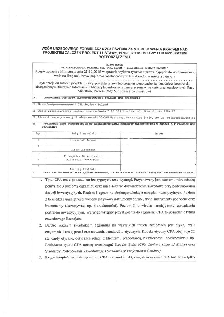 WZÓR URZĘDOWEGO FORMULARZA ZGŁOSZENIA ZAINTERESOWANIA PRACAMI NAD PROJEKTEM ZAŁOŻEŃ PROJEKTU USTAWY, PROJEKTEM USTAWY LUB PROJEKTEM ROZPORZĄDZENIA ZGŁOSZENIE ZAINTERESOWANIA PEACAMI NIW PROJEKTEM - Rozporządzenie Ministra z dnia 28.1 0.2015 w sprawie wykazu tytułów uprawnijących do ubiegania się o wpis na listę maklerów papierów wartościowych lub doradców inwestycyjnych (t\tuł projtktu załozen projektu ust IW) prcjtktu u<>ta\w lub projtktu iozpoiządzuua zaodnie 7 jtJ ttY4 udostępnioną w Biuletynie Informacji Publicznej lub informacją zamieszczoną w wykazie prac legislacyjnych Rady Y1inj.strów, Prezesa Rady Mnistr6w albo ministrów) A OZNACZENIE PODMIOTU ZAINTERESOWANEGO PRACAMI ZAD PROJEKTEM . 1. Ct\ Socioty ?ctiac1 2. Adres 53-348 Wrocław, ul. Komandorska 118/120 3. Actresdo korespon encj1 I i1res e—malt 20—363 Warszawa, Nowy Świat 54/56, lok.24, [email protected] 7 h WSKAZANIE OSÓB ZJPRAWNIONYCE DO REPREZENTOWANIA PODMIOTU WYMIENIONEGO W CZĘŚCI A W PRAZACH NAD . PROJEKTEM Lp. mięt mazwisko 1 Adies Krzysztor Jajuga Piotr Oleradzan -— Przemysław Berankiewicz -- 4 Aleksaoder Motrzyoki 5 C Aodrzei Pasławki OPIS POSTULOWANEGO ROZWIĄZANIA PRAZNEGO „ ZE WSKAZANIEM iNTERESU BĘDĄCEGO PRZEDMIOTEM OCHRONY . I ]„yttił CFA ma u podstaw bardzo rygorystyczne wymogi. Przyznawany jest osohom które zdadzą t podejmowaniu pomyślnie 3 poziomy egzaminu oraz mają 4-letnie doświadczenie zawodowe pr deczji lfl%\ estycj n di Poziom I egzam mu obej moje wąLdą z n wzędn I\\ i st\ cymy th Poziom 2 to %yieda i umiejętności wyceny aktywów (instrumenty diużne akije, instrumenty pochodne oraz instrumenty alternatywne, np. nieruchomości). Poziom 3 to wiedza i urn icjętności zarządzania .. portfelem inwestycyjnym. Warunek wstępny przystąpienia do egzaminu C”FA to posiadanie tytułu zawodowego licencjata. 2. Bardzo ważnym. składnikiem egzaminu na wszystkich trzech poziomach jest etyka czyli znąjoniość i umiejętność zastosowania standardów etycznych. Kodeks etyczny CFA obejmuje 22 standardy etyczne. dotyczące relacji z klientarni, pracodawcą, niezależności, obiektywizmu, itp. Posiadaczc tytułu CFA muszą przestrzegać Kodeks Etyki (LWA Insi/tule Codz of Elli/es) oraz Standardy Postępowania Zawodowego (Sxandards qf”I”roJóssionał Conductj 3. Rygor i stopień trudności egznminu CFA potwierdza fakt iż —jak oszacował CFA lnstitute — tylko jedna osoba na pięć przystępuąea do egzami rui .. na poziomie I kończy ten program. czyli zdąje egzamin na poziomie 3. 4 Warunki do\% tadLienia za%ocIo\%L4o nit zotah okrtslonc dla oti r\mama licemji maklLra i doradcy. co powoduje. że w tym zakresie tytuł CFA posiada wyższe standardy niż zakładane dla tytułów: doradca inwestycyjny, makler papierów wartościowych. 5. CFA Institute wskazuje. że liczba godzin niezbędna do przestudiowania materiału do każdego z trzech poziomów egzaminu wynosi około 300 godzin. 6. Od połowy lat dziewięćdziesiątych ubiegłego stulecia tytuł CFA stał się niekwestionowanym światowym standardem yą zakresie inwestycj i. W ślad za tym poszła ewolucja wymogów egzaminacyjnych. Jako przykład należy podać materiał w zakresie raportowania finansowego (sirawozdawczości hnansowej ). który obecnie w dtiżyrn stopni i oparty jest na Międzynarodowych Standardach Sprawozdawczości Finansowej. a w mniejszym na liS GAAP (jak było dawniej). 7. Zakres materiału wymaganego na egzaminie CFA podlega ciajej analizie (zwanej Practice Analysis). Analiza ta prowadzi do ciatej modyfikacji programu i jest przeprowadzana przez praktyków. którzy postulują potrzebne zmiany w programie, wynikąjące ze zmian na rynku. $ Tytuł C hA jest globalnym standardem wiedzy z zakresy rynków tinansowych i inwestycji .. kapitałowych. Jego posiadaczami jest ponad J 30 tysięcy osób na całym świecie. Organizacja pełni centralną rolę w globalnej społeczności profesjonalistów na rynkach kapitałowych. Jeżeli mielibyśmy się trzymać ducha zapisów Ustawy, tojedynie tytuł CFA spełriia wymogi wpisu na listę doradców inwestycyjnych. 9 Porównanie wymogów egzaminacyjnych w standardzie CFA (zawartych w CBOK — Candidate Body ofKnowledge) oraz zakresu tematycznego w egzaminie na doradcę prowadzi do wniosku, iż pOza zagadnieniami prawrn ymi tematyka obowiązująca na egzaminie na doradcę jest zawarta w .. materiale obowiązującym na egzaminach CFA. Przedstawiająto załączniki I i 2. I O. Kwalifikacja CFA wymaga od swoich członków bezwarunkowej znąjoiności regulacji prawnych .. na rynku lokalnym, jak również na wszystkich rynkach na których działa finna zatrudniąjąca Członka. Wiedza z zakresu prawa nie jest sprawdzana bezpośrednio ze względu na międzyn arodowy charakter kwalifikacji. ale wiedza ta jest sprawdzana pośrednio, poprzez wymóg . 4 lat pracy w branży aby otrzymać kwalifikację, jak również. rekomendację innego członka oraz przełożonego osoby ubiegającej się o kwalifikacje, która to rekomendacja powinna również. uwzględniać ocenę, czy dana osoba jest odpowiednio przygotowana pod względem znąjomości regulacji. Można przyjąć, iż wszyscy posiadacze tytułu CFA działający na rynku polskim i ubiegąjący się o licencję Doradcy Inwestycyjnego, ze względu na wymagania kwabtikacJi oraz ponad 4-letnie doświadczenie w branży będą mieć niezbędne przygotowanie prawne i regulacyjne do pracy w zawodzie. I I Na zdecydowanej większości rynków kapitałowych na świecie egzamin z prawa niejest wymagany do pełnienia funkcji realizowanych n tomiast XV Polsce przez Doradców Inwestycyjnych, prjmuje się je Instytucja R)nko\% Kapitalow%uh zatrudniajaca speLlalistę g\kalantujc jego znajomość regulacji. I 2. Tytuł CFA wymaga od swoich czionków znajomości regulacji prawnych we wszystkich jurysdykcjach, w których działa pracodawca posiadacza tytułu CFA. Biorąc pod uwagę, iż \\ iększosc mstytucj i w Polsce dzia