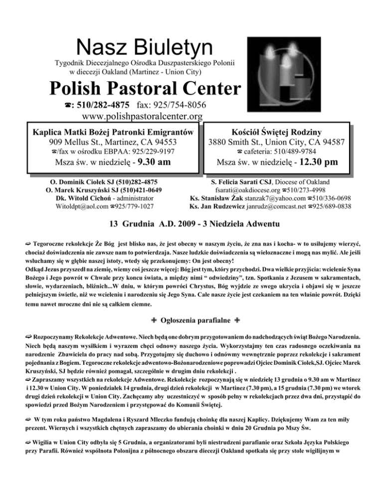 Nasz Biuletyn Tygodnik Diecezjalnego Ośrodka Duszpasterskiego Polonii w diecezji Oakland (Martinez - Union City) Polish Pastoral Center ?: 510/282-4875 fax: 925/754-8056 www.polishpastoralcenter.org Kaplica Matki Bożej Patronki Emigrantów 909 Mellus St., Martinez, CA 94553 Kościół Świętej Rodziny 3880 Smith St., Union City, CA 94587 ?/fax w ośrodku EBPAA: 925/229-9197 ? cafeteria: 510/489-9784 Msza św. w niedzielę - 9.30 am Msza św. w niedzielę - 12.30 pm O. Dominik Ciołek SJ (510)282-4875 O. Marek Kruszyński SJ (510)421-0649 Dk. Witold Cichoń - administrator [email protected] ?925/779-1027 S. Felicia Sarati CSJ, Diocese of Oakland [email protected] ?510/273-4998 Ks. Stanisław Żak [email protected] ?510/336-0698 Ks. Jan Rudzewicz [email protected] ?925/689-0838 13 Grudnia A.D. 2009 - 3 Niedziela Adwentu . Tegoroczne rekolekcje Że Bóg jest blisko nas, że jest obecny w naszym życiu, że zna nas i kocha- w to usiłujemy wierzyć, chociaż doświadczenia nie zawsze nam to potwierdzaja. Nasze ludzkie doświadczenia są wieloznaczne i mogą nas mylić. Ale jeśli wsłuchamy się w głębie naszej istoty, wtedy się przekonujemy: On jest obecny! Odkąd Jezus przyszedł na ziemię, wiemy coś jeszcze więcej: Bóg jest tym, który przychodzi. Dwa wielkie przyjścia: wcielenie Syna Bożego i Jego powrót w Chwale przy koncu świata, a między nimi “ odwiedziny”, tzn. Spotkania z Jezusem w sakramentach, słowie, wydarzeniach, bliźnich...W dniu, w którym powróci Chrystus, Bóg wyjdzie ze swego ukrycia i objawi się w jeszcze pełniejszym świetle, niż we wcieleniu i narodzeniu się Jego Syna. Całe nasze życie jest czekaniem na ten właśnie powrót. Dzięki temu nawet mroczne dni nie są całkiem ciemne. Z Ogłoszenia parafialne Z . Rozpoczynamy Rekolekcje Adwentowe. Niech będą one dobrym przygotowaniem do nadchodzących świąt Bożego Narodzenia. Niech będą naszym wysiłkiem i wyrazem chęci odnowy naszego życia. Wykorzystajmy ten czas radosnego oczekiwania na narodzenie Zbawiciela do pracy nad sobą. Przygotujmy się duchowo i odnówmy wewnętrznie poprzez rekolekcje i sakrament pojednania z Bogiem. Tegoroczne rekolekcje adwentowo-Bożonarodzeniowe poprowadzi Ojciec Dominik Ciolek,SJ. Ojciec Marek Kruszyński, SJ będzie również pomagał, szczególnie w drugim dniu rekolekcji . . Zapraszamy wszystkich na rekolekcje Adwentowe. Rekolekcje rozpoczynają się w niedzielę 13 grudnia o 9.30 am w Martinez i 12.30 w Union City. W poniedziałek 14 grudnia, drugi dzień rekolekcji w Martinez (7.30 pm), a 15 grudnia (7.30 pm) we wtorek drugi dzień rekolekcji w Union City. Zachęcamy aby uczestniczyć w sposób pełny w rekolekcjach przez dwa dni, przystąpić do spowiedzi przed Bożym Narodzeniem i przystępować do Komunii Świętej. . W tym roku państwo Magdalena i Ryszard Mleczko fundują choinkę dla naszej Kaplicy. Dziękujemy Wam za ten miły prezent. Wiernych i wszystkich chętnych zapraszamy do ubierania choinki w dniu 20 Grudnia po Mszy Św. . Wigilia w Union City odbyła się 5 Grudnia, a organizatorami byli niestrudzeni parafianie oraz Szkoła Języka Polskiego przy Parafii. Również wspólnota Polonijna z północnego obszaru diecezji Oakland spotkała się przy stole wigilijnym w Rossmore / Walnut Creek, 12 Grudnia, a organizatorami były wszystkie organizacje Polonijne działające na tutejszym terenie. Jasełka, tańce i Święty Mikołaj to główna atrakcja każdego z tych wieczorów. Wszyscy delektowaliśmy się polskimi potrawami wigilijnymi, a dzieci były oczarowane Św. Mikołajem. Wypada nam szczególnie serdecznie podziękować panu Zdzisławowi Jarkiewiczowi, Prezesowi Koła AK oraz Fundacji “AK” za zorganizowanie i udostępnienie tejże sali, w której mogliśmy wspólnie już po raz trzeci spędzić naszą Wigilię, bez ponoszenia olbrzymich obciążen finansowych. Dziękujemy Panie Zdzisławie. . Zebrane składki kościelne. Za złożone ofiary składamy serdeczne Bóg zapłać: Martniez 10/18/09 10/25/09 11/01/09 11/08/09 11/15/09 11/22/09 11/29/09 12/06/09 $494 $362 $237 $369 $201 + nagł. $224 $373 Union City $412 $280 $645 $195 $187 $283 $274 + lunch $93 $269 + Wigilia $302 Z Ogłoszenia parafialne Z . Sylwester 31-go Grudnia w godzinach od 19-tej do 2-giej rano - Polska Parafia w Union City 3880 Smith St. zaprasza na szaloną noc. Bilety : $30 - od osoby (+ lampka szampana ), $ 25 - bilety wcześniej zamówione. Rezerwacja: pp. Małgorzata Bzowska – 510-881-0499, Beata Wrona 510-886-1290 albo po każdej Mszy św. . Sylwester w Ośrodku EBPAA w Martinez przy 909 Mellus Street od godz 19:00 do 2:00 nad ranem. Bilety prosimy nabywać u p. Ryszarda Mleczko (925) 427-2119 . Domek do wynajęcia w Oakland na pograniczu San Leandro, spokojna okolica, w przystępnej cenie. 1 bedroom, living room, kitchen i bathroom. Cena $700, deposit $350. Proszę o kontakt z panem Jackiem (408) 761-7507. . Druh Ryszard Urbaniak wydał następny tom wierszy zatytułowany “Zatoka Poezji”. Jak pamiętamy, druh wraz ze swoim Kołem Harcerskim corocznie organizuje pomoc dla polskiego harcerstwa w Kazachstanie. Dochód ze sprzedaży tomiku ponownie w całości przeznacza na ten piękny i zbożny cel. Prosimy o wsparcie. . Parafie nasze otrzymały list od Sióstr i dzieci z Ośrodka w Wierzbicach, w których zapewniają nas o wdzięczności za wszelką dotychczasową pomoc, której doświadczyły na przestrzeni wielu lat od naszych dwóch wspólnot. Zapewniają nas o swej modlitwie i proszą o pamięć i pomoc. Dzielą się z nami swoimi sukcesami i osiągnięciami, jak również potrzebami. Siostry są niezmiernie zadowolone, że udało im się utworzyć również klasy licealne dla dzieci pozostających pod ich opieką. Z http://PolishPastoralCenter.org/sacraments Z Oferujemy posługę sakramentalną i duszpasterską w języku polskim i angielskim. Nauka religii i przygotowanie do I Komunii św. - w ramach zajęć Szkoły Polskiej. Przygotowanie do b