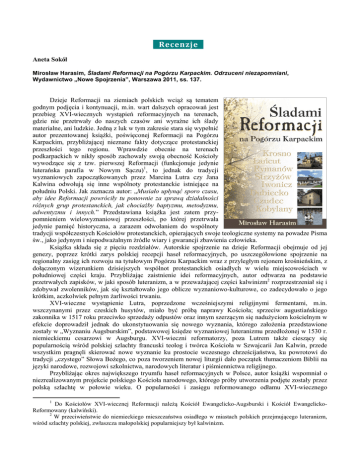 Recenzje _ Aneta Sokół Mirosław Harasim, Śladami Reformacji na Pogórzu Karpackim. Odrzuceni niezapomniani, Wydawnictwo „Nowe Spojrzenia”, Warszawa 2011, ss. 137. Dzieje Reformacji na ziemiach polskich wciąż są tematem godnym podjęcia i kontynuacji, m.in. wart dalszych opracowań jest przebieg XVI-wiecznych wystąpień reformacyjnych na terenach, gdzie nie przetrwały do naszych czasów ani wyraźne ich ślady materialne, ani ludzkie. Jedną z luk w tym zakresie stara się wypełnić autor prezentowanej książki, poświęconej Reformacji na Pogórzu Karpackim, przybliżającej nieznane fakty dotyczące protestanckiej przeszłości tego regionu. Wprawdzie obecnie na terenach podkarpackich w nikły sposób zachowały swoją obecność Kościoły wywodzące się z tzw. pierwszej Reformacji (funkcjonuje jedynie luterańska parafia w Nowym Sączu)1, to jednak do tradycji wyznaniowych zapoczątkowanych przez Marcina Lutra czy Jana Kalwina odwołują się inne wspólnoty protestanckie istniejące na południu Polski. Jak zaznacza autor: „Musiało upłynąć sporo czasu, aby idee Reformacji powróciły tu ponownie za sprawą działalności różnych grup protestanckich, jak chociażby baptyzmu, metodyzmu, adwentyzmu i innych.” Przedstawiana książka jest zatem przypomnieniem wielowyznaniowej przeszłości, po której przetrwała jedynie pamięć historyczna, a zarazem odwołaniem do wspólnoty tradycji współczesnych Kościołów protestanckich, opierających swoje teologiczne systemy na powadze Pisma św., jako jedynym i niepodważalnym źródle wiary i gwarancji zbawienia człowieka. Książka składa się z pięciu rozdziałów. Autorskie spojrzenie na dzieje Reformacji obejmuje od jej genezy, poprzez krótki zarys polskiej recepcji haseł reformacyjnych, po uszczegółowione spojrzenie na regionalny zasięg ich rozwoju na tytułowym Pogórzu Karpackim wraz z przyległym rejonem krośnieńskim, z dołączonym wizerunkiem dzisiejszych wspólnot protestanckich osiadłych w wielu miejscowościach w południowej części kraju. Przybliżając zaistnienie idei reformacyjnych, autor odtwarza na podstawie przetrwałych zapisków, w jaki sposób luteranizm, a w przeważającej części kalwinizm2 rozprzestrzeniał się i zdobywał zwolenników, jak się kształtowało jego oblicze wyznaniowo-kulturowe, co zadecydowało o jego krótkim, aczkolwiek pełnym żarliwości trwaniu. XVI-wieczne wystąpienie Lutra, poprzedzone wcześniejszymi religijnymi fermentami, m.in. wszczynanymi przez czeskich husytów, miało być próbą naprawy Kościoła; sprzeciw augustiańskiego zakonnika w 1517 roku przeciwko sprzedaży odpustów oraz innym szerzącym się nadużyciom kościelnym w efekcie doprowadził jednak do ukonstytuowania się nowego wyznania, którego założenia przedstawione zostały w „Wyznaniu Augsburskim”, podstawowej księdze wyznaniowej luteranizmu przedłożonej w 1530 r. niemieckiemu cesarzowi w Augsburgu. XVI-wieczni reformatorzy, poza Lutrem także cieszący się popularnością wśród polskiej szlachty francuski teolog i twórca Kościoła w Szwajcarii Jan Kalwin, przede wszystkim pragnęli skierować nowe wyznanie ku prostocie wczesnego chrześcijaństwa, ku powrotowi do tradycji „czystego” Słowa Bożego, co poza tworzeniem nowej liturgii dało początek tłumaczeniom Biblii na języki narodowe, rozwojowi szkolnictwa, narodowych literatur i piśmiennictwa religijnego. Przybliżając okres największego tryumfu haseł reformacyjnych w Polsce, autor książki wspomniał o niezrealizowanym projekcie polskiego Kościoła narodowego, którego próby utworzenia podjęte zostały przez polską szlachtę w połowie wieku. O popularności i zasięgu reformowanego odłamu XVI-wiecznego 1 Do Kościołów XVI-wiecznej Reformacji należą Kościół Ewangelicko-Augsburski i Kościół EwangelickoReformowany (kalwiński). 2 W przeciwieństwie do niemieckiego mieszczaństwa osiadłego w miastach polskich przejmującego luteranizm, wśród szlachty polskiej, zwłaszcza małopolskiej popularniejszy był kalwinizm. protestantyzmu, zwłaszcza na ziemiach Małopolski, świadczyły także liczne zbory, prężnie rozwijające się ośrodki myśli protestanckiej (m.in. Pińczów) czy zapisani w literaturze działacze reformacyjni (m.in. Erazm Otwinowski, Jan Firlej, Andrzej Trzecieski młodszy). Przybliżając znaczenie małopolskiego protestantyzmu, który ewoluował od luteranizmu do kalwinizmu, a także ku arianizmowi, autor zwraca uwagę na postępowość wszelkich poczynań podejmowanych z inspiracji obozu reformacyjnego. Wszak nawet program naprawy państwa sformułowany przez Andrzeja Frycza Modrzewskiego zawdzięczać możemy wpływom protestanckim, chociaż autor dzieła O naprawie Rzeczypospolitej nie zerwał z Kościołem rzymskokatolickim to pozostawał w zasięgu myśli reformacyjnej, wraz z jej krytyką instytucji kościelnych i próbami unowocześnienia państwa, edukacji i innych dziedzin życia obywatelskiego (s. 33). Czytelnik wprowadzony już w znaczenie idei reformacyjnych, w tym ich niewykorzystany na ziemiach polskich potencjał ideowy, w kolejnych rozdziałach poznaje wydarzenia lokalne, które poświadczają o szybkim rozprzestrzenianiu się luteranizmu, głównie jednak kalwinizmu, na Pogórzu Karpackim. W wybranych do prezentacji tego zjawiska miejscowościach (Strzyżów, Czudec, Łańcut, Dubiecko), jak się dowiadujemy, już w pierwszej połowie XVI w. odbierano katolikom kościoły i zakładano zbory protestanckie. Szlacheccy właściciele podkarpackich miasteczek, jak dowodzą zachowane zapiski, siłą zaprowadzali nowe wyznanie, wypędzając księży, sprowadzając protestanckich kaznodziejów, zakładając szkoły i patronując zachowaniu nowych zasad życia religijnego wśród poddanych. Można dodać, że dzięki przytaczanym faktom i epizodom autor umiejętnie wprowadza czytelnika w klimat tych odległych czasów – czasów sporów, religijnego wrzen
