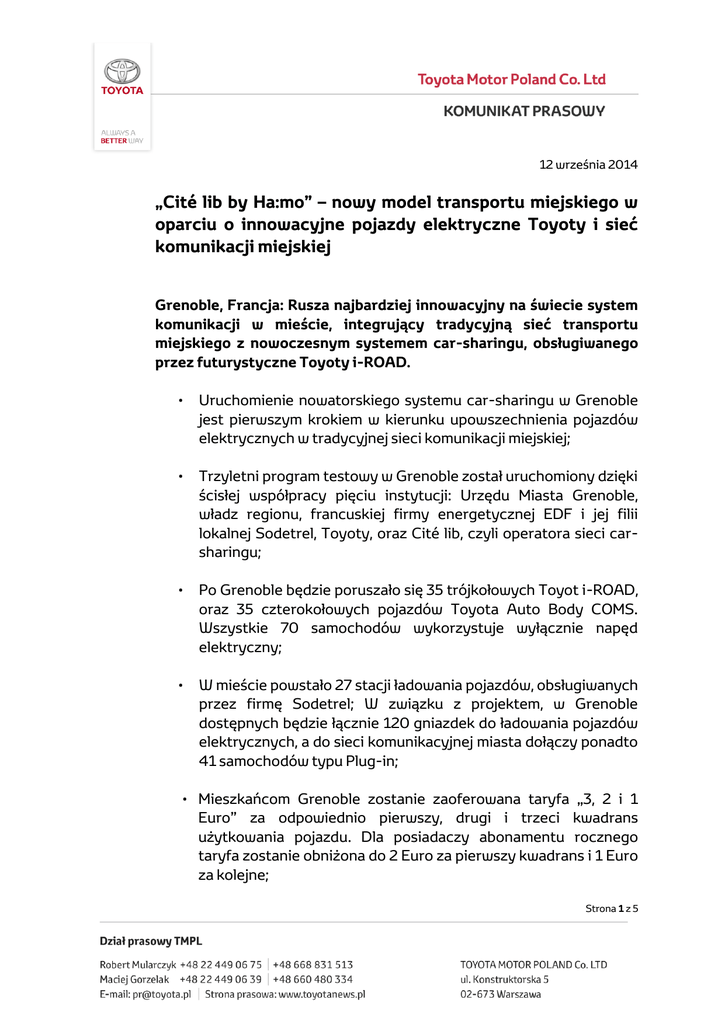 12 września 2014 „Cité lib by Ha:mo” – nowy model transportu miejskiego w oparciu o innowacyjne pojazdy elektryczne Toyoty i sieć komunikacji miejskiej Grenoble, Francja: Rusza najbardziej innowacyjny na świecie system komunikacji w mieście, integrujący tradycyjną sieć transportu miejskiego z nowoczesnym systemem car-sharingu, obsługiwanego przez futurystyczne Toyoty i-ROAD. • Uruchomienie nowatorskiego systemu car-sharingu w Grenoble jest pierwszym krokiem w kierunku upowszechnienia pojazdów elektrycznych w tradycyjnej sieci komunikacji miejskiej; • Trzyletni program testowy w Grenoble został uruchomiony dzięki ścisłej współpracy pięciu instytucji: Urzędu Miasta Grenoble, władz regionu, francuskiej firmy energetycznej EDF i jej filii lokalnej Sodetrel, Toyoty, oraz Cité lib, czyli operatora sieci carsharingu; • Po Grenoble będzie poruszało się 35 trójkołowych Toyot i-ROAD, oraz 35 czterokołowych pojazdów Toyota Auto Body COMS. Wszystkie 70 samochodów wykorzystuje wyłącznie napęd elektryczny; • W mieście powstało 27 stacji ładowania pojazdów, obsługiwanych przez firmę Sodetrel; W związku z projektem, w Grenoble dostępnych będzie łącznie 120 gniazdek do ładowania pojazdów elektrycznych, a do sieci komunikacyjnej miasta dołączy ponadto 41 samochodów typu Plug-in; • Mieszkańcom Grenoble zostanie zaoferowana taryfa „3, 2 i 1 Euro” za odpowiednio pierwszy, drugi i trzeci kwadrans użytkowania pojazdu. Dla posiadaczy abonamentu rocznego taryfa zostanie obniżona do 2 Euro za pierwszy kwadrans i 1 Euro za kolejne; Strona 1 z 5 • Program Cité lib by Ha:mo zostanie uruchomiony 1 października 2014 roku. Grenoble, 12 września 2014 r.: Rodzi się czyste miasto przyszłości z elektrycznymi pojazdami Toyoty doskonale w ramach systemu carsharingu z siecią tradycyjnej komunikacji miejskiej. O innowacyjności programu Cité lib by Ha:mo świadczy szereg jego unikatowych cech: • Nie jest to kolejny zwykły system car-sharingu. Ultra kompaktowe, elektryczne pojazdy Toyota i-ROAD uzupełniają sieć komunikacji miejskiej, pozwalając mieszkańcom swobodnie przemieszczać się po Grenoble nawet na bardzo krótkich odcinkach, w tym wyłącznie w jedną stronę. • Pojazdy i stacje ich ładowania są zintegrowane z systemem informatycznym całej sieci komunikacyjnej miasta, pozwalając użytkownikom dokładnie planować podróż za pomocą aplikacji mobilnej. • Mieszkańcy mają pełną dowolność w wyborze stacji ładowania, w której zwracają wypożyczony pojazd. Opłata jest naliczana wyłącznie za czas przejazdu. • W Grenoble dostępnych jest 35 Toyot i-ROAD, najwięcej spośród wszystkich miast na świecie. i-ROAD jest nowatorskim, trójkołowym pojazdem zapewniającym niespotykane wrażenia z prowadzenia. Dzięki technologii Active Lean poruszanie się iROAD’em przypomina jazdę na nartach. Pojazd jest zwrotny i zwinny jak skuter, oferując jednocześnie komfort zamkniętego samochodu. Car-sharing Grenoble bazuje dodatkowo na 35 egzemplarzach elektrycznego modelu Toyota Auto Body COMS. • Usługa eliminuje konieczność szukania przez użytkownika wolnego miejsca parkingowego. Dodatkowo, kompaktowe rozmiary wykorzystywanych pojazdów ułatwiają budowę sieci stacji ich ładowania. Strona 2 z 5 Władze obszaru Grenoble-Alpes Metropole uważają, że promowanie nowoczesnych środków transportu miejskiego, wykorzystywanych przez mieszkańców w codziennym życiu – np. w dojazdach do pracy czy na zakupy – jest niezbędnym elementem poprawy jakości życia w mieście. Populacja Grenoble dzięki programowi Cité lib by Ha:mo nie tylko obniży emisję CO2, ale także poziom hałasu w mieście. W ramach programu, Toyota nie tylko dostarcza 70 samochodów elektrycznych, ale jest także odpowiedzialna za system zarządzania carsharingiem, noszącym nazwę Ha:mo (od Harmonious Mobility). Firma ma już doświadczenia w tej dziedzinie – podobne rozwiązanie funkcjonuje już w Toyota City w Japonii. Według strategii koncernu, samochody elektryczne są kluczowym ogniwem modelu niskoemisyjnego transportu przyszłości, w którym okazują się bezkonkurencyjne na krótkich dystansach miejskich. Samochody hybrydowe, hybrydowe plug-in, oraz napędzane ogniwami paliwowymi, według tej wizji sprawdzają się na dłuższych odcinkach. „Projekt Cité lib by Ha:mo okazał się sukcesem, ponieważ wszyscy partnerzy biorący w nim udział, od początku mieli ten sam wspólny cel – wszyscy chcieliśmy stworzyć nowoczesny model transportu miejskiego. Dla Toyoty będzie to jeden z najważniejszych obszarów rozwoju w nadchodzących latach” – powiedział Takeshi Uchiyamada, Chairman Toyota Motor Corporation. Kto może korzystać z programu Cité lib by Ha:mo? - Każda osoba powyżej 18 roku życia posiadająca ważne prawo jazdy; Użytkownicy muszą wcześniej zarejestrować się w programie Cité lib online (www.citelib.com), lub w jednym z trzech punktów stacjonarnych w Grenoble; Gdzie są zlokalizowane stacje ładowania pojazdów? - - Stacje są rozmieszczone w Grenoble, Fontaine, Gières, St Martin D’Hères, Seyssinet-Pariset, et La Tronche, w bliskim sąsiedztwie przystanków autobusowych i tramwajowych; Każda ze stacji ma co najmniej cztery miejsca dla pojazdów i-ROAD i COMS; Strona 3 z 5 - W niektórych stacjach przewidziano także dodatkowe miejsca do ładowania pozostałych samochodów elektrycznych lub hybrydowych plug-in, poruszających się po mieście. Jak rezerwuje się samochód? - Po zarejestrowaniu w programie należy pobrać aplikację mobilną na smartfon, tablet, lub komputer (nazwa aplikacji: „Cité lib by Ha:mo”); Aplikacja informuje, w której ze stacji ładowania znajdują się wolne pojazdy z odpowiednim poziomem naładowania akumulatorów; Po zwrocie pojazdu na stację rozpoczyna się ładowanie akumulatorów. Jakie są koszty wypożyczenia pojazdu? - Program jest skonstruowany tak, by preferow