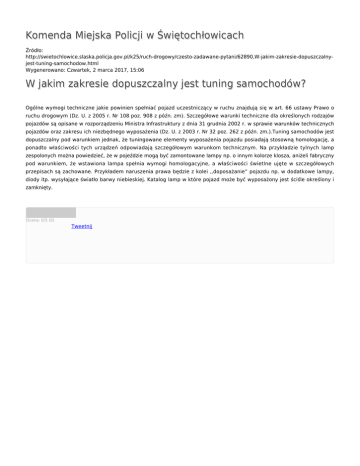Komenda Miejska Policji w Świętochłowicach Źródło: http://swietochlowice.slaska.policja.gov.pl/k25/ruch-drogowy/czesto-zadawane-pytani/62890,W-jakim-zakresie-dopuszczalnyjest-tuning-samochodow.html Wygenerowano: Czwartek, 2 marca 2017, 15:06 W jakim zakresie dopuszczalny jest tuning samochodów? Ogólne wymogi techniczne jakie powinien spełniać pojazd uczestniczący w ruchu znajdują się w art. 66 ustawy Prawo o ruchu drogowym (Dz. U. z 2005 r. Nr 108 poz. 908 z późn. zm). Szczegółowe warunki techniczne dla określonych rodzajów pojazdów są opisane w rozporządzeniu Ministra Infrastruktury z dnia 31 grudnia 2002 r. w sprawie warunków technicznych pojazdów oraz zakresu ich niezbędnego wyposażenia (Dz. U. z 2003 r. Nr 32 poz. 262 z późn. zm.).Tuning samochodów jest dopuszczalny pod warunkiem jednak, że tuningowane elementy wyposażenia pojazdu posiadają stosowną homologację, a ponadto właściwości tych urządzeń odpowiadają szczegółowym warunkom technicznym. Na przykładzie tylnych lamp zespolonych można powiedzieć, że w pojeździe mogą być zamontowane lampy np. o innym kolorze klosza, aniżeli fabryczny pod warunkiem, że wstawiona lampa spełnia wymogi homologacyjne, a właściwości świetlne ujęte w szczegółowych przepisach są zachowane. Przykładem naruszenia prawa będzie z kolei ,,doposażanie” pojazdu np. w dodatkowe lampy, diody itp. wysyłające światło barwy niebieskiej. Katalog lamp w które pojazd może być wyposażony jest ściśle określony i zamknięty. Ocena: 0/5 (0) Tweetnij
