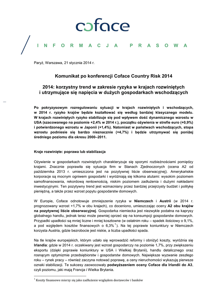 I N F O R M A C J A P R A S O W A Paryż, Warszawa, 21 stycznia 2014 r. Komunikat po konferencji Coface Country Risk 2014 2014: korzystny trend w zakresie ryzyka w krajach rozwiniętych i utrzymujące się napięcia w dużych gospodarkach wschodzących Po pokryzysowym rozregulowaniu sytuacji w krajach rozwiniętych i wschodzących, w 2014 r. ryzyko krajów będzie kształtować się według bardziej klasycznego modelu. W krajach rozwiniętych ryzyko stabilizuje się pod wpływem dość dynamicznego wzrostu w USA (szacowanego na poziomie +2,4% w 2014 r.), początku ożywienia w strefie euro (+0,9%) i potwierdzonego wzrostu w Japonii (+1,4%). Natomiast w państwach wschodzących, stopa wzrostu podniesie się bardzo nieznacznie (+4,7%) i będzie utrzymywać się poniżej średniego poziomu dla okresu 2000–2011. Kraje rozwinięte: poprawa lub stabilizacja Ożywienie w gospodarkach rozwiniętych charakteryzuje się sporymi rozbieżnościami pomiędzy krajami. Znacznie poprawiła się sytuacja firm w Stanach Zjednoczonych (ocena A2 od października 2013 r. umieszczona jest na pozytywnej liście obserwacyjnej). Amerykańskie korporacje są mocnym ogniwem gospodarki i wyróżniają się kilkoma atutami: wysokim poziomem samofinansowania, rekordową rentownością, niskim poziomem zadłużenia i dużymi nakładami inwestycyjnymi. Ten pozytywny trend jest wzmacniany przez bardziej przejrzysty budżet i politykę pieniężną, a także przez wzrost popytu gospodarstw domowych. W Europie, Coface odnotowuje zmniejszenie ryzyka w Niemczech i Austrii (w 2014 r. prognozowany wzrost +1,7% w obu krajach), co doceniono, umieszczając oceny A2 obu krajów na pozytywnej liście obserwacyjnej. Gospodarka niemiecka jest niezwykle podatna na kaprysy globalnego handlu, jednak teraz może pewniej oprzeć się na konsumpcji gospodarstw domowych. Przypadki upadłości są mniej liczne i mniej kosztowne (w ostatnim roku – spadek ilościowy o 9,1%, 1 a pod względem kosztów finansowych o 6,3% ). Na tej poprawie koniunktury w Niemczech korzysta Austria, gdzie bezrobocie jest niskie, a liczba upadłości spada. Na tle krajów europejskich, którym udało się wprowadzić reformy i obniżyć koszty, wyróżnia się Irlandia: gdzie w 2014 r. oczekiwany jest wzrost gospodarczy na poziomie 1,7%, przy zwiększeniu eksportu (dzięki poprawie koniunktury w USA i Wielkiej Brytanii), handlu detalicznego oraz rosnącym optymizmie przedsiębiorstw i gospodarstw domowych. Największe wyzwanie zeszłego roku – rynek pracy – również zaczyna notować poprawę, a ceny nieruchomości wykazują pierwsze oznaki stabilizacji. Te sukcesy zaowocowały podwyższeniem oceny Coface dla Irlandii do A3, czyli poziomu, jaki mają Francja i Wielka Brytania. 1 Koszty finansowe mierzy się jako zadłużenie względem dostawców i banków I N F O R M A C J A P R A S O W A Diagnoza dla pozostałej części strefy euro jest mniej jednoznaczna. Można przynajmniej stwierdzić, że ryzyko przestało rosnąć. We Francji, gdzie przedsiębiorcom nie udało się znacząco obniżyć kosztów, firmy nadal są niezwykle wrażliwe na wahania popytu krajowego, a ten w dalszym ciągu jest bardzo mizerny w porównaniu z historyczną średnią (prognozowany wzrost gospodarczy +0,6% w 2014 r.) Konsekwencją tej wrażliwości jest wciąż wysoka liczba przypadków niewypłacalności: około 62.000 w 2014 r. W Europie Południowej słaby popyt wewnętrzny, zdominowanie działalności gospodarczej przez bardzo małe i wrażliwe firmy, a dodatkowo brak innowacji, uniemożliwiły poprawę w zakresie ryzyka kredytowego. Ponadto, na przykład w Hiszpanii, wysoki poziom osiąga zadłużenie przedsiębiorstw. Gospodarki wschodzące: trudna sytuacja firm na głównych rynkach wschodzących, jednak wiele gospodarek Afryki Subsaharyjskiej utrzymuje dobre wyniki W 2014 r. wzrost w państwach BRICS wyhamuje o 2,4 punktu w porównaniu ze średnią za lata 2000–2011. Zdaniem Coface nie jest to wynikiem zwykłego cyklicznego spadku koniunktury, lecz wynika z ograniczeń podaży (popyt gospodarstw domowych przewyższa możliwości lokalnej produkcji, która nie jest w stanie dłużej utrzymać się na takim samym poziomie). Inwestycje natrafiają na przeszkody natury strukturalnej: niedostateczna infrastruktura, niesprzyjający klimat dla biznesu i niedobory wykwalifikowanej siły roboczej. Dodatkowo, słabnąca podaż lokalna napędza import, przez co w 2014 r. utrzyma się wysoki deficyt obrotów bieżących. Kursy walutowe będą zatem niestabilne tym bardziej, że Brazylię, Indie, Turcję i RPA czekają w 2014 r. ważne wybory. Cztery państwa Afryki Subsaharyjskiej oparły się temu nowemu wzrostowi ryzyka. Pomimo niepewnej sytuacji pod względem bezpieczeństwa Coface umieszcza na pozytywnej liście obserwacyjnej ocenę D Rwandy i Nigerii, oraz C - Kenii. Ocena Wybrzeża Kości Słoniowej zostaje podwyższona do poziomu C. W 2014 r. powinien się tam utrzymać solidny wzrost gospodarczy, który kraj zawdzięcza korzystnej dla konsumentów dywersyfikacji branż. „Obniżenie poziomu ryzyka w krajach rozwiniętych potwierdzają pozytywne tendencje obserwowane w dwóch dużych gospodarkach – USA i Niemiec. Oba państwa zyskują na solidnych podstawach finansowych swojego sektora przedsiębiorstw oraz na ożywieniu gospodarczym, które obecnie opiera się na mocniejszych fundamentach. Jeśli chodzi o innych ważnych graczy europejskich, koniec recesji oznacza dla nich na razie stabilizację ryzyka. Oczekiwany wzrost będzie jednak powolny. Właściwie dopiero przy stopie wzrostu wynoszącej przynajmniej +0,8% we Włoszech, +1,6% we Francji i +2,5% w Wielkiej Brytanii, zaobserwowalibyśmy znaczący spadek liczby upadłości. Jednakże w żadnej z tych trzech gospodarek przewidywany wzrost w 2014 r. nie osiągnie takiego poziomu. W krajach wschodzących, deficyty na rachunkach bieżących i długotrwale spowolnienie wzrostu podcinają skrzydła firmom. Na szczęście
