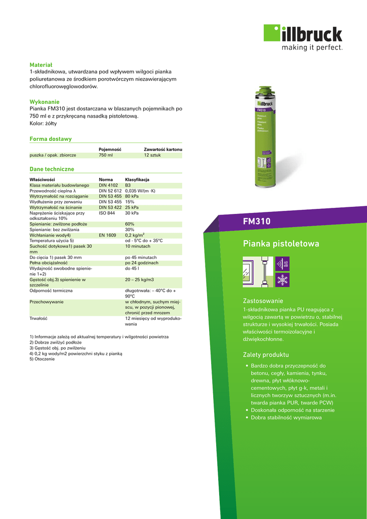 Materiał 1-składnikowa, utwardzana pod wpływem wilgoci pianka poliuretanowa ze środkiem porotwórczym niezawierającym chlorofluorowęglowodorów. Wykonanie Pianka FM310 jest dostarczana w blaszanych pojemnikach po 750 ml e z przykręcaną nasadką pistoletową. Kolor: żółty Forma dostawy puszka / opak. zbiorcze Pojemność 750 ml Zawartość kartonu 12 sztuk Dane techniczne Właściwości Klasa materiału budowlanego Przewodność cieplna λ Wytrzymałość na rozciąganie Wydłużenie przy zerwaniu Wytrzymałość na ścinanie Naprężenie ściskające przy odkształceniu 10% Spienianie: zwilżone podłoże Spienianie: bez zwilżania Wchłanianie wody4) Temperatura użycia 5) Suchość dotykowa1) pasek 30 mm Do cięcia 1) pasek 30 mm Pełna obciążalność Wydajność swobodne spienienie 1+2) Gęstość obj.3) spienienie w szczelinie Odporność termiczna Przechowywanie Trwałość Norma DIN 4102 DIN 52 612 DIN 53 455 DIN 53 455 DIN 53 422 ISO 844 Klasyfikacja B3 0,035 W/(m ·K) 80 kPa 15% 25 kPa 30 kPa EN 1609 60% 30% 0,2 kg/m² od - 5°C do + 35°C 10 minutach FM310 Pianka pistoletowa po 45 minutach po 24 godzinach do 45 l 20 – 25 kg/m3 długotrwała: – 40°C do + 90°C w chłodnym, suchym miejscu, w pozycji pionowej, chronić przed mrozem 12 miesięcy od wyprodukowania 1) Informacje zależą od aktualnej temperatury i wilgotności powietrza 2) Dobrze zwilżyć podłoże 3) Gęstość obj. po zwilżeniu 4) 0,2 kg wody/m2 powierzchni styku z pianką 5) Otoczenie Zastosowanie 1-składnikowa pianka PU reagująca z wilgocią zawartą w powietrzu o, stabilnej strukturze i wysokiej trwałości. Posiada właściwości termoizolacyjne i dźwiękochłonne. Zalety produktu • Bardzo dobra przyczepność do betonu, cegły, kamienia, tynku, drewna, płyt włóknowocementowych, płyt g-k, metali i licznych tworzyw sztucznych (m.in. twarda pianka PUR, twarde PCW) • Doskonała odporność na starzenie • Dobra stabilność wymiarowa FM310 Pianka pistoletowa Przygotowanie • Podłoże musi być czyste i wytrzymałe. Nieprzyczepione fragmenty, pył i tłuszcz należy usunąć; • Przed nałożeniem pianki powierzchnie podłoża zwilżyć; • Przylegające powierzchnie oraz okładziny ścienne i podłogowe w miejscu pracy należy zakryć. Użycie • Przed każdym użyciem pojemnik należy mocno wstrząsnąć co najmniej 20 razy; • Pojemnik trzymać zawsze zaworem do dołu. Ilość pianki montażowej jest dozowana poprzez wciskanie dźwigni zaworu; • Piankę należy dozować oszczędnie. Piankę należy nakładać w formie pasm. Szczeliny i pustki o głębokości powyżej 30 mm wypełniać warstwami, zwilżając poprzednią warstwę przed nałożeniem kolejnej. • Należy jednak pamiętać, że w podłożu nie może być zamarzniętej wody. Optymalna temperatura pojemnika wynosi 20°C; w niższej temperaturze należy liczyć się z mniejszą wydajnością pianki. • W przypadku wprowadzania pianki przy elementach ulegających odkształceniu, np. parapetach lub ościeżnicach okiennych, należy zapewnić odpowiednio mocne osadzenie tych elementów. Ilustracja 1: Powierzchnie zwilżająć Ilustracja 2: Pojemnik należy mocno wstrząsnąć Ilustracja 3: Piankę należy nakładać w formie pasm Utwardzanie Pianka przestaje się lepić po około 10 minutach, można ją wykańczać (przycinać) po upływie 45-60 minut, a pełną wytrzymałość uzyskuje po 24 godzinach, w zależności od grubości, temperatury i wilgotności. Czyszczenie Ewentualny nadmiar pianki należy odciąć po utwardzeniu się pianki. Odpryski pianki należy od razu usuwać za pomocą pistoletowego środka czyszczącego AA290 lub acetonu. Utwardzoną piankę można usunąć tylko sposobem mechanicznym. Po użyciu pistolet do pianki dokładnie zakonserwować środkiem w sprayu AA291. stawiać pianki na działanie czynników atmosferycznych przez dłuższy czas, ponieważ nie jest ona odporna na promieniowanie UV. Zawory pianek illbruck są dokładnie dopasowane do pistoletów oferowanych przez firmę illbruck. Używanie tych pistoletów zapewnia uzyskanie optymalnego otwarcia zaworu. W ten sposób zapewniona jest żądana prędkość wylotowa i całkowite opróżnienie pojemnika. Przechowywać w temperaturze od +5°C do 25°C, w suchym miejscu, w pozycji pionowej, w oryginalnym opakowaniu. Dopuszczalny okres magazynowania: około 12 miesięcy. Wskazówki Serwis techniczny Na życzenie klienta firma tremco illbruck udostępnia w każdej chwili fachową pomoc techniczną Dodatkowe informacje Powyższe informacje mogą być tylko ogólnymi wskazówkami. Ze względu na to, że nie mamy Wskazówki bezpieczeństwa Najnowszą wersję karty charakterystyki znajdą Państwo na stronie www.tremco-illbruck.com wpływu na warunki obróbki i zastosowania, jak również z powodu różnorodności stosowanych materiałów, należy przeprowadzić odpowiednie próby we własnym zakresie, aby sprawdzić materiał pod kątem dopasowania produktu do konkretnego zastosowania. Zastrzega się możiwość zmian technicznych. Najnowszą wersję znajdziecie Państwo na stronie www.tremcoillbruck.com tremco illbruck Sp. z o.o. Kuźnicy Kołłątajowskiej 13 31-234 Kraków Polska T:+48 12 665 33 08 F:+48 12 665 33 09 [email protected] www.tremco-illbruck.com 122953 | 2014-05 Używać tylko w pomieszczeniach o powierzchni podłogi powyżej 5 m² (wysokość kondygnacji 2,5 m) i dobrej wentylacji. Nie palić! Chronić oczy, nosić rękawice i odzież roboczą. Nie wy-