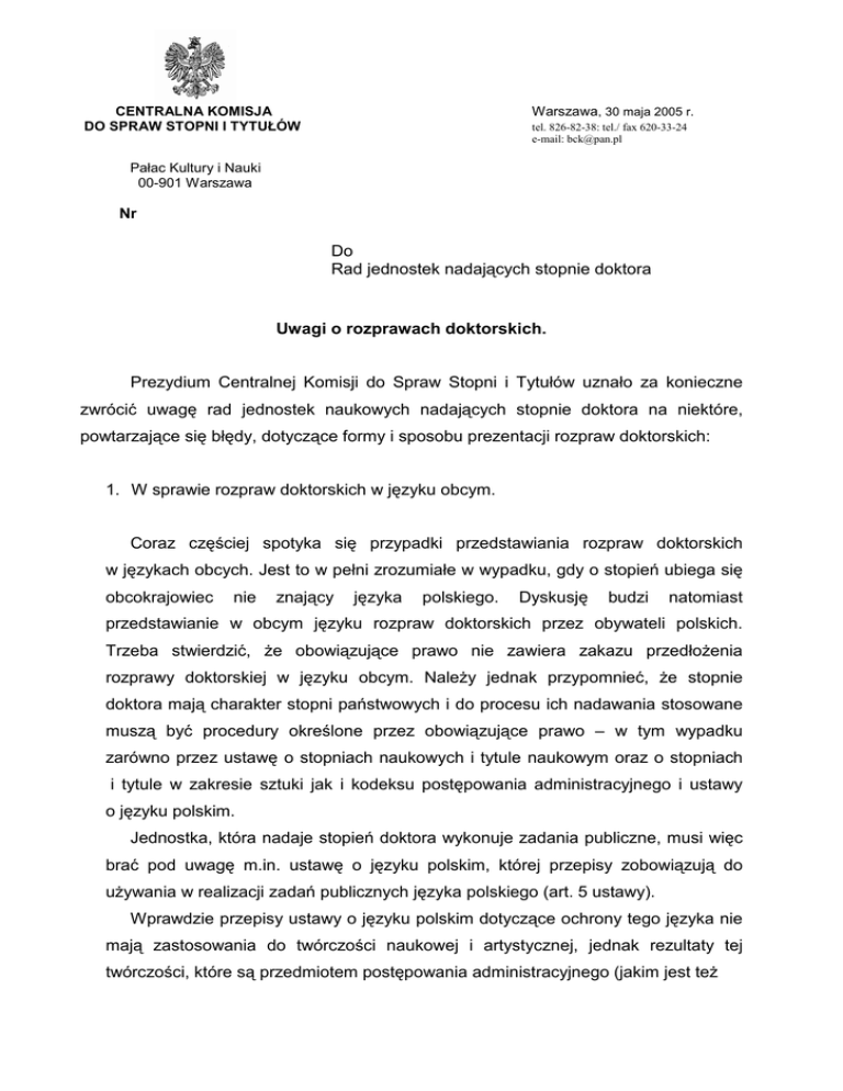 CENTRALNA KOMISJA DO SPRAW STOPNI I TYTUŁÓW Warszawa, 30 maja 2005 r. tel. 826-82-38: tel./ fax 620-33-24 e-mail: [email protected] Pałac Kultury i Nauki 00-901 Warszawa Nr Do Rad jednostek nadających stopnie doktora Uwagi o rozprawach doktorskich. Prezydium Centralnej Komisji do Spraw Stopni i Tytułów uznało za konieczne zwrócić uwagę rad jednostek naukowych nadających stopnie doktora na niektóre, powtarzające się błędy, dotyczące formy i sposobu prezentacji rozpraw doktorskich: 1. W sprawie rozpraw doktorskich w języku obcym. Coraz częściej spotyka się przypadki przedstawiania rozpraw doktorskich w językach obcych. Jest to w pełni zrozumiałe w wypadku, gdy o stopień ubiega się obcokrajowiec nie znający języka polskiego. Dyskusję budzi natomiast przedstawianie w obcym języku rozpraw doktorskich przez obywateli polskich. Trzeba stwierdzić, Ŝe obowiązujące prawo nie zawiera zakazu przedłoŜenia rozprawy doktorskiej w języku obcym. NaleŜy jednak przypomnieć, Ŝe stopnie doktora mają charakter stopni państwowych i do procesu ich nadawania stosowane muszą być procedury określone przez obowiązujące prawo – w tym wypadku zarówno przez ustawę o stopniach naukowych i tytule naukowym oraz o stopniach i tytule w zakresie sztuki jak i kodeksu postępowania administracyjnego i ustawy o języku polskim. Jednostka, która nadaje stopień doktora wykonuje zadania publiczne, musi więc brać pod uwagę m.in. ustawę o języku polskim, której przepisy zobowiązują do uŜywania w realizacji zadań publicznych języka polskiego (art. 5 ustawy). Wprawdzie przepisy ustawy o języku polskim dotyczące ochrony tego języka nie mają zastosowania do twórczości naukowej i artystycznej, jednak rezultaty tej twórczości, które są przedmiotem postępowania administracyjnego (jakim jest teŜ 2 przewód doktorski), stanowiącego wykonanie zadania publicznego, muszą spełniać wymagania ustawy o języku polskim, co odnosi się takŜe do rozprawy doktorskiej, jako podstawy czynności dopuszczenia do obrony i samej obrony. Zgodnie z kodeksem postępowania administracyjnego, czynności administracyjne w postępowaniu (takŜe więc w przewodzie doktorskim) powinny być utrwalone w aktach sprawy w języku polskim. Dotyczy to więc takŜe rozprawy doktorskiej, która ma być albo przedstawiona w języku polskim, albo gdy jest w języku obcym (co jest dopuszczalne), powinno jej towarzyszyć w aktach tłumaczenie na język polski. Trzeba tu takŜe przypomnieć, Ŝe zgodnie z przepisami ustawy o stopniach naukowych i tytule naukowym oraz o stopniach i tytule w zakresie sztuki oraz przepisami towarzyszącymi tej ustawie, rozprawa doktorska ma być wyłoŜona do powszechnego wglądu „w celu zapoznania się z jej treścią” zaś obrona tej rozprawy ma charakter publiczny, co obliguje do zapewnienia dostępu do pełnego tekstu rozprawy i przebiegu czynności jej obrony w języku urzędowym obowiązującym w naszym kraju. Zdaniem Centralnej Komisji ponadto poŜądane jest, by obywatel polski, aspirujący do kariery naukowca, przynajmniej na starcie tej kariery wykazał się umiejętnością napisania kompletnej rozprawy w języku ojczystym, co wcale nie przeszkadza, by tę rozprawę następnie opublikować w języku obcym. 2. W sprawie przedstawiania cyklu publikacji zamiast rozprawy doktorskiej. Pojawiła się sprzeczna z prawem praktyka odstępowania od obowiązku przygotowania i przedłoŜenia w przewodzie doktorskim rozprawy doktorskiej i zastępowania tej rozprawy przez cykl prac opublikowanych w róŜnym czasie, niekiedy z innymi autorami. Taka praktyka narusza art. 13 ustawy o stopniach naukowych i tytule naukowym oraz o stopniach i tytule w zakresie sztuki. Ten przepis ustawy rozstrzyga, Ŝe rozprawa doktorska ma być przygotowana pod opieką promotora (jest to funkcja obsadzana w chwili wszczęcia przewodu), ma stanowić samodzielne rozwiązanie problemu naukowego lub artystycznego i być dowodem umiejętności samodzielnego prowadzenia pracy naukowej lub artystycznej. 3 Pojęcie rozprawy jest dość ściśle pojmowane w języku polskim i w omawianej ustawie nie rozciąga się na zbiór róŜnych prac przygotowanych w róŜnym czasie, w róŜnych okolicznościach, nie związanych zwykle z przewodem doktorskim. Nie ma tu analogii z rozprawą habilitacyjną, na co zwrócił uwagę teŜ ustawodawca uznając za konieczne rozszerzenie pojęcia rozprawy o nową jej formę, tj. o cykl publikacji naukowych, czego nie ma w przepisach dotyczących rozprawy doktorskiej. Uwidoczniona w ustawie róŜnica w formach obu rozpraw nie jest przypadkowa. Przewód doktorski i przewód habilitacyjny pełnią róŜne funkcje w procesie awansowym. Przewód doktorski jest m.in. obserwowanym procesem wykonywania pracy naukowej lub artystycznej, opracowywania jej wyników i prezentacji wyniku pracy w postaci rozprawy doktorskiej. Tylko w tych warunkach moŜna ocenić samodzielność pracy doktoranta, jego umiejętność prowadzenia pracy naukowej lub artystycznej, w tym zdolności napisania kompletnej rozprawy doktorskiej, jako jednej z waŜnych cech kwalifikacji, zwłaszcza do zawodu naukowca. Rezygnacja z wymagania takiej rozprawy nie jest więc zgodna z celami przewodu i sprzeczna jest zarówno z duchem, jak i literą przepisów ustawy. Z tych samych względów niedopuszczalne jest uznanie za rozprawę doktorską merytorycznego udziału doktoranta w pracy zbiorowej, jeśli tą rozprawą nie jest jednoznacznie „wyodrębniona” i „samodzielna” część tej pracy zbiorowej (art. 13 ust. 4 ustawy o stopniach naukowych i tytule naukowym oraz o stopniach i tytule w zakresie sztuki).