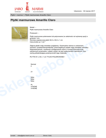 Utworzono : 02 marzec 2017 Płytki > marmur > Płytki marmurowe Amarillo Claro Płytki marmurowe Amarillo Claro Model : Płytki marmurowe Amarillo Claro Producent : Płytki marmurowe polerowane lub patynowane (w zależności od wybranej opcji) o grubości 1cm. Wymiary pojedynczej płytki 30,5 x 30,5 x 1 cm Cena brutto za 1 m2 * r a Zdjęcia płytek mają charakter poglądowy. Ewentualne różnice w odcieniach, wzorach i przebarwieniach poszczególnych płytek mają charakter naturalny. Niepowtarzalność, możliwość występowania różnic w tonacji kolorystycznej, odmiennych przerostów i układu użyleń nie jest wadą kamieni naturalnych, lecz cechą potwierdzającą autentyczność tego materiału. M o PŁYTKI 61 x 30 x 1 cm TYLKO POLEROWANE ! Normal 0 21 p e l k S false false false b a J PL X-NONE X-NONE kontakt : - [email protected] Strona 1/{nb} i m Utworzono : 02 marzec 2017 Płytki > marmur > Płytki marmurowe Amarillo Claro Płytki marmurowe Amarillo Claro /* Style Definitions */ table.MsoNormalTable { mso-style-parent:""; font-size:11.0pt;"Calibri","sans-serif"; mso-fareast-"Times New Roman";} M o r a * Jedna płytka o wymiarach 30,5 x 30,5 cm ma powierzchnię 0,093 m2. Przy realizacji zamówiona całkowita ilość metrów zamówionych płytek zostanie podzielona przez powierzchnię pojedynczej płytki i zaokrąglona w „dół” do pełnej płytki. Np. Przy zamówieniu 5 m2 otrzymają Państwo 53 płytki o łącznej powierzchni 4,929 m2. Zgodnie ze wzorem: 5/0,093 = 53,76 sztuki po zaokrągleniu w „dół” = 53 sztuki. Analogiczna sytuacja ma miejsce z innymi rozmiarami płytek. Przy składaniu zamówienia proszę uwzględnić nie tylko samą powierzchnie posadzki, ale także sposób układania, cokoły, uskoki oraz ewentualne uszkodzenia. p e l k S b a J Cena : 280,00 zł Brutto ( 227,64 zł Netto) Dostępne opcje Płytki marmurowe Amarillo Claro : powierzchnia patynowana (+ 10,00 zł), polerowana. wymiar 30,5x30,5x1 cm, 61x30,5x1 cm (+ 72,00 zł). Dostępność: Produkt dostępny w naszym sklepie od 13 maj 2009 kontakt : - [email protected] Strona 2/{nb} i m