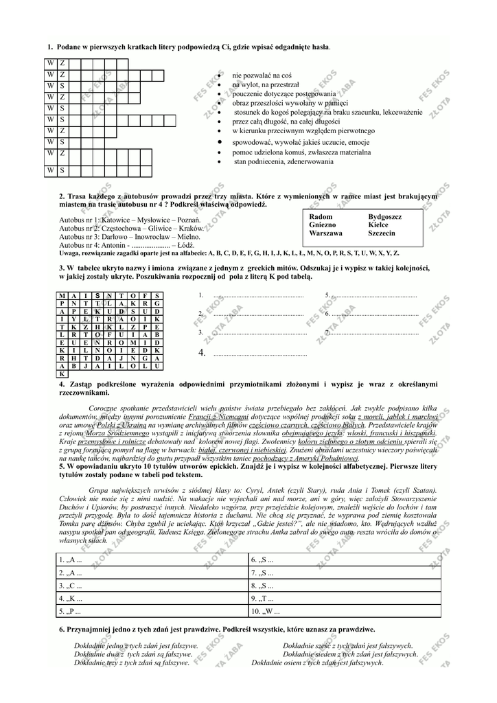 1. Podane w pierwszych kratkach litery podpowiedzą Ci, gdzie wpisać odgadnięte hasła. W W W W W W W W W Z Z S Z S S Z S Z nie pozwalać na coś na wylot, na przestrzał pouczenie dotyczące postępowania obraz przeszłości wywołany w pamięci stosunek do kogoś polegający na braku szacunku, lekceważenie przez całą długość, na całej długości w kierunku przeciwnym względem pierwotnego spowodować, wywołać jakieś uczucie, emocje pomoc udzielona komuś, zwłaszcza materialna stan podniecenia, zdenerwowania W S 2. Trasa każdego z autobusów prowadzi przez trzy miasta. Które z wymienionych w ramce miast jest brakującym miastem na trasie autobusu nr 4 ? Podkreśl właściwą odpowiedź. Radom Gniezno Warszawa Autobus nr 1: Katowice – Mysłowice – Poznań. Autobus nr 2: Częstochowa – Gliwice – Kraków. Autobus nr 3: Darłowo – Inowrocław – Mielno. Autobus nr 4: Antonin - ..................... – Łódź. Bydgoszcz Kielce Szczecin Uwaga, rozwiązanie zagadki oparte jest na alfabecie: A, B, C, D, E, F, G, H, I, J, K, L, Ł, M, N, O, P, R, S, T, U, W, X, Y, Z. 3. W tabelce ukryto nazwy i imiona związane z jednym z greckich mitów. Odszukaj je i wypisz w takiej kolejności, w jakiej zostały ukryte. Poszukiwania rozpocznij od pola z literą K pod tabelą. M P A I T L E K R A K A N P Y K R U I H B I T E L Z T E L T J S N T O T L A K K U D S T R A O H K L Z O F U I N R O M N O I E D A J N A I L O F R U I P A I D G L S G D K E B D K A U 1. ....................................................... 5. .................................................... 2. ....................................................... 6. ..................................................... 3. ......................................................... 7....................................................... 4. ......................................................... 4. Zastąp podkreślone wyrażenia odpowiednimi przymiotnikami złożonymi i wypisz je wraz z określanymi rzeczownikami. Coroczne spotkanie przedstawicieli wielu państw świata przebiegało bez zakłóceń. Jak zwykle podpisano kilka dokumentów, między innymi porozumienie Francji z Niemcami dotyczące wspólnej produkcji soku z moreli, jabłek i marchwi oraz umowę Polski z Ukrainą na wymianę archiwalnych filmów częściowo czarnych, częściowo białych. Przedstawiciele krajów z rejonu Morza Śródziemnego wystąpili z inicjatywą stworzenia słownika obejmującego języki: włoski, francuski i hiszpański. Kraje przemysłowe i rolnicze debatowały nad kolorem nowej flagi. Zwolennicy koloru zielonego o złotym odcieniu spierali się z grupą forsującą pomysł na flagę w barwach: białej, czerwonej i niebieskiej. Znużeni obradami uczestnicy wieczory poświęcali na naukę tańców, najbardziej do gustu przypadł wszystkim taniec pochodzący z Ameryki Południowej. 5. W opowiadaniu ukryto 10 tytułów utworów epickich. Znajdź je i wypisz w kolejności alfabetycznej. Pierwsze litery tytułów zostały podane w tabeli pod tekstem. Grupa największych urwisów z siódmej klasy to: Cyryl, Antek (czyli Stary), ruda Ania i Tomek (czyli Szatan). Człowiek nie może się z nimi nudzić. Na wakacje nie wyjechali ani nad morze, ani w góry, więc założyli Stowarzyszenie Duchów i Upiorów, by postraszyć innych. Niedaleko wzgórza, przy przejeździe kolejowym, znaleźli wejście do lochów i tam przeżyli przygodę. Była to dość tajemnicza historia z duchami. Nie chcą się przyznać, że wyprawa pod ziemię kosztowała Tomka parę dżinsów. Chyba zgubił je uciekając. Ktoś krzyczał „Gdzie jesteś?”, ale nie wiadomo, kto. Wędrujących wzdłuż nasypu spotkał pan od geografii, Tadeusz Księga. Zielonego ze strachu Antka zabrał do swego auta, reszta wróciła do domów o własnych siłach. 1. „A ... 6. „S ... 2. „A ... 7. „S ... 3. „C ... 8. „S ... 4. „K ... 9. „T ... 5. „P ... 10. „W ... 6. Przynajmniej jedno z tych zdań jest prawdziwe. Podkreśl wszystkie, które uznasz za prawdziwe. Dokładnie jedno z tych zdań jest fałszywe. Dokładnie dwa z tych zdań są fałszywe. Dokładnie trzy z tych zdań są fałszywe. Dokładnie sześć z tych zdań jest fałszywych. Dokładnie siedem z tych zdań jest fałszywych. Dokładnie osiem z tych zdań jest fałszywych. Dokładnie cztery z tych zdań są fałszywe. Dokładnie pięć z tych zdań jest fałszywych. Dokładnie dziewięć z tych zdań jest fałszywych. Dokładnie dziesięć z tych zdań jest fałszywych. 7. Zgadnij, która pani siedzi obok której i jakie lubią czytać książki. Tabelę przerysuj na osobną kartkę i uzupełnij. Pani Bibliofilska urządziła przyjęcie - przy okrągłym stole usiadły cztery członkinie Klubu Dobrej Książki – pani Bibliofilska i jej trzy przyjaciółki: Pagińska, Książkowska i Literacka. Pani Pagińska, która czyta tylko kryminały, usiadła po prawej stronie miłośniczki powieści podróżniczych. Pani Literacka lubi czytać poezję, dlatego nie siedzi obok zagorzałej czytelniczki powieści science-fiction, ale po prawej stronie miłośniczki romansów. Gospodyni przyjęcia, która nie czyta powieści podróżniczych, siedzi obok czytelniczki kryminałów. Zwolenniczce romansów nie przeszkadza bliska obecność pani Bibliofilskiej. Pani Książkowska nie siedzi obok pani Pagińskiej. Czytelniczka powieści podróżniczych nie jest gospodynią przyjęcia ani miłośniczką romansów. Osoba: Miejsce: Pani Bibliofilska Po prawej stronie pani ... i po lewej stronie pani ... . Pani Pagińska Po prawej stronie pani ... i po lewej stronie pani ... . Pani Literacka Po prawej stronie pani ... i po lewej stronie pani ... . Pani Książkowska Po prawej stronie pani ... i po lewej stronie pani ... . Lektury: 8. Fragmenty zdań z artykułu o Wielkim Wybuchu zostały dowolnie umieszczone w tabeli. Przepisz artykuł, łącząc fragmenty w całość. Interpunkcja i wielkie litery zostały zachowane, fragment