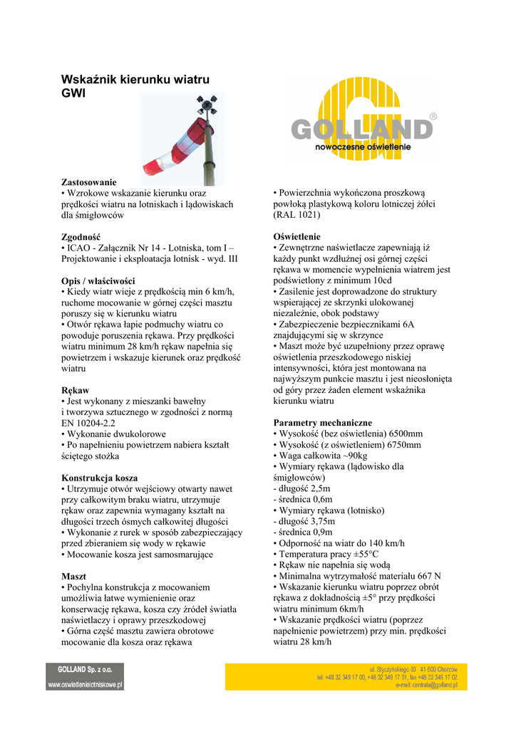 Wskaźnik kierunku wiatru GWI Zastosowanie • Wzrokowe wskazanie kierunku oraz prędkości wiatru na lotniskach i lądowiskach dla śmigłowców Zgodność • ICAO - Załącznik Nr 14 - Lotniska, tom I – Projektowanie i eksploatacja lotnisk - wyd. III Opis / właściwości • Kiedy wiatr wieje z prędkością min 6 km/h, ruchome mocowanie w górnej części masztu poruszy się w kierunku wiatru • Otwór rękawa łapie podmuchy wiatru co powoduje poruszenia rękawa. Przy prędkości wiatru minimum 28 km/h rękaw napełnia się powietrzem i wskazuje kierunek oraz prędkość wiatru Rękaw • Jest wykonany z mieszanki bawełny i tworzywa sztucznego w zgodności z normą EN 10204-2.2 • Wykonanie dwukolorowe • Po napełnieniu powietrzem nabiera kształt ściętego stożka Konstrukcja kosza • Utrzymuje otwór wejściowy otwarty nawet przy całkowitym braku wiatru, utrzymuje rękaw oraz zapewnia wymagany kształt na długości trzech ósmych całkowitej długości • Wykonanie z rurek w sposób zabezpieczający przed zbieraniem się wody w rękawie • Mocowanie kosza jest samosmarujące Maszt • Pochylna konstrukcja z mocowaniem umożliwia łatwe wymienienie oraz konserwację rękawa, kosza czy źródeł światła naświetlaczy i oprawy przeszkodowej • Górna część masztu zawiera obrotowe mocowanie dla kosza oraz rękawa • Powierzchnia wykończona proszkową powłoką plastykową koloru lotniczej żółci (RAL 1021) Oświetlenie • Zewnętrzne naświetlacze zapewniają iż każdy punkt wzdłużnej osi górnej części rękawa w momencie wypełnienia wiatrem jest podświetlony z minimum 10cd • Zasilenie jest doprowadzone do struktury wspierającej ze skrzynki ulokowanej niezależnie, obok podstawy • Zabezpieczenie bezpiecznikami 6A znajdującymi się w skrzynce • Maszt może być uzupełniony przez oprawę oświetlenia przeszkodowego niskiej intensywności, która jest montowana na najwyższym punkcie masztu i jest nieosłonięta od góry przez żaden element wskaźnika kierunku wiatru Parametry mechaniczne • Wysokość (bez oświetlenia) 6500mm • Wysokość (z oświetleniem) 6750mm • Waga całkowita ~90kg • Wymiary rękawa (lądowisko dla śmigłowców) - długość 2,5m - średnica 0,6m • Wymiary rękawa (lotnisko) - długość 3,75m - średnica 0,9m • Odporność na wiatr do 140 km/h • Temperatura pracy ±55°C • Rękaw nie napełnia się wodą • Minimalna wytrzymałość materiału 667 N • Wskazanie kierunku wiatru poprzez obrót rękawa z dokładnością ±5° przy prędkości wiatru minimum 6km/h • Wskazanie prędkości wiatru (poprzez napełnienie powietrzem) przy min. prędkości wiatru 28 km/h Parametry elektryczne • stopień ochrony IP 54 • rezystancja izolacji min 2 MΩ • moc całkowita ± 10% 484VA • napięcie 230 V / 50Hz Mocowanie do betonowego fundamentu • dwie płyty stalowe połączone poprzez stalowy szpikulec umożliwiający przechylenie masztu • wymiary podstawy 300 x 300mm • mocowanie do fundamentu poprzez cztery śruby M 16mm Zamawianie wyrobów W zamówieniu należy podać : - nazwę, typ wskaźnika, liczbę sztuk Kod zamówienia 1 2 3 4 GWI 10. x. x. x. x 1. Wykonanie A= Wersja lotniskowa (Airport) H= Wersja dla lądowiska dla śmigłowców (Heliport) 2. Oświetlenie 0= bez oświetlenia rękawa 1= bez oświetlenia rękawa z lampą przeszkodową 2= podświetlenie rękawa z lampą przeszkodową 3. Kolor rękawa R= pomarańczowy (orange) / biały (white) (5 pasów z pomarańczowym na końcu) O= pomarańczowy (orange) 4. Podłączenie 0= bezpośrednio przez kabel 1= przez skrzynkę przyłączeniową Wymiary: GWI10.A.2.R.1 GWI10.H.2.R.1