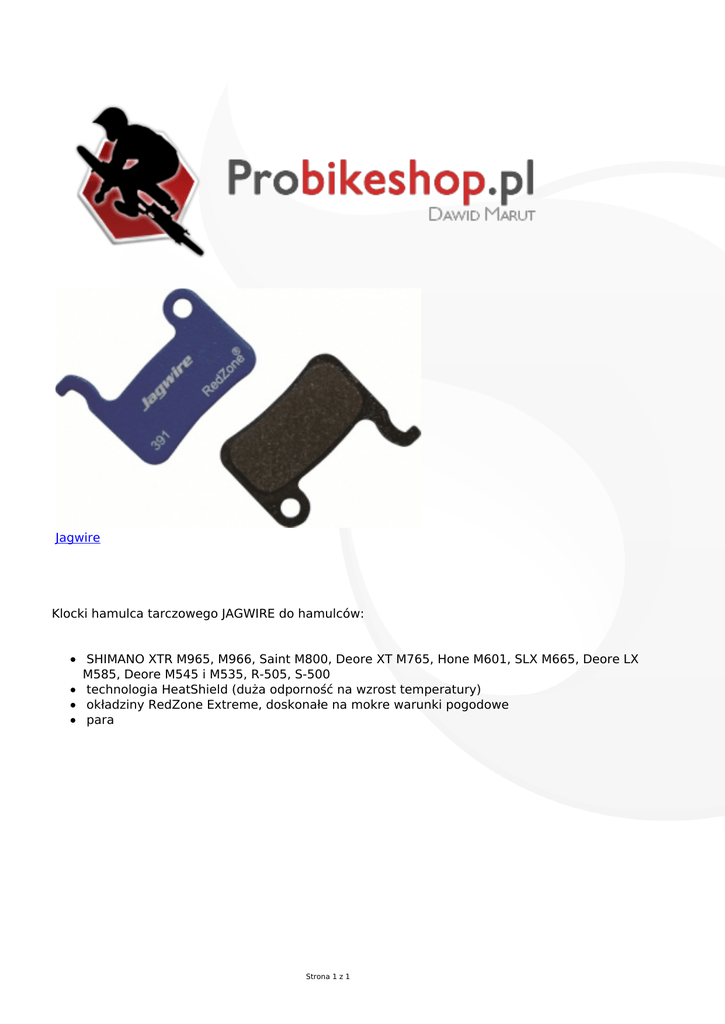 Jagwire Klocki hamulca tarczowego JAGWIRE do hamulców: SHIMANO XTR M965, M966, Saint M800, Deore XT M765, Hone M601, SLX M665, Deore LX M585, Deore M545 i M535, R-505, S-500 technologia HeatShield (duża odporność na wzrost temperatury) okładziny RedZone Extreme, doskonałe na mokre warunki pogodowe para Strona 1 z 1