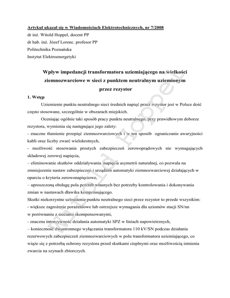 Artykuł ukazał się w Wiadomościach Elektrotechnicznych, nr 7/2008 dr inż. Witold Hoppel, docent PP dr hab. inż. Józef Lorenc. profesor PP Politechnika Poznańska Instytut Elektroenergetyki Wpływ impedancji transformatora uziemiającego na wielkości ziemnozwarciowe w sieci z punktem neutralnym uziemionym przez rezystor 1. Wstęp Uziemienie punktu neutralnego sieci średnich napięć przez rezystor jest w Polsce dość często stosowane, szczególnie w obszarach miejskich. Oceniając ogólnie taki sposób pracy punktu neutralnego, przy prawidłowym doborze rezystora, wymienia się następujące jego zalety: - znaczne tłumienie przepięć ziemnozwarciowych i w ten sposób ograniczanie awaryjności kabli oraz liczby zwarć wielokrotnych, - możliwość stosowania prostych zabezpieczeń zerowoprądowych nie wymagających składowej zerowej napięcia, – eliminowanie skutków oddziaływania napięcia asymetrii naturalnej, co pozwala na zmniejszenie nastaw zabezpieczeń i urządzeń automatyki ziemnozwarciowej działających w oparciu o kryteria zerowonapięciowe, – uproszczoną obsługę pola potrzeb własnych bez potrzeby kontrolowania i dokonywania zmian w nastawach dławika kompensującego. Skutki niekorzystne uziemienia punktu neutralnego sieci przez rezystor to przede wszystkim: - większe zagrożenie porażeniowe lub ostrzejsze wymagania dla uziomów stacji SN/nn w porównaniu z sieciami skompensowanymi, - znaczna intensywność działania automatyki SPZ w liniach napowietrznych, – konieczność dwustronnego wyłączania transformatora 110 kV/SN podczas działania rezerwowych zabezpieczeń ziemnozwarciowych w polu transformatora uziemiającego, co wiąże się z potrzebą ochrony rezystora przed skutkami cieplnymi oraz możliwością istnienia zwarcia na szynach zbiorczych. 2. Dobór rezystora uziemiającego punkt neutralny sieci SN 2.1. Sposób uproszczony Dla typowych sieci o napięciu nominalnym 15 kV wartości znamionowych prądów ziemnozwarciowych rezystorów z reguły przyjmuje się w granicach od 100 do 500 A. W ostatnich latach utrwaliła się zasada doboru rezystora wg zależności: I RN ≥ 1,2 I CS (1a) oraz dodatkowo, że I RN ≥ 100 A lub I RN ≥ 150 A (1b) w których: IRN – znamionowy prąd ziemnozwarciowy rezystora, ICS – pojemnościowy prąd zwarcia doziemnego sieci. Spełnienie zależności (1) pozwala na ograniczenie nieustalonych ziemnozwarciowych do wartości niezagrażających bezpośrednio przepięć izolacji sieci. Pojęcie „znamionowy prąd ziemnozwarciowy” określa tutaj wartość prądu płynącego przez rezystor podczas metalicznego zwarcia doziemnego, a nie wiąże się z właściwościami konstrukcyjnymi – np. wytrzymałością cieplną. Wartość rezystancji uziemiającej RPN dobiera się przeważnie wg uproszczonego wzoru: RPN = Un 3I NR (2) gdzie: Un – nominalne napięcie przewodowe sieci (15 kV - a nie 15,75 kV, 20 kV - a nie 21 kV). Przy takim uproszczonym doborze pomija się impedancję transformatora uziemiającego dla składowej zerowej oraz fakt, że napięcie robocze sieci jest często o kilka procent większe od nominalnego. Obydwa uproszczenia częściowo kompensują się, ponieważ pierwsze z nich powoduje zmniejszenie dobieranej rezystancji, drugie – zwiększenie. Kontynuując obliczenia z przyjętymi uproszczeniami, wartość ustalonego prądu ziemnozwarciowego, m. in. dla potrzeb doboru rezystancji uziemienia stacji SN/nN, oblicza się wg zależności: 2 2 I K1 = I RN + I CS co jest wystarczająco dokładne dla większości przypadków. (3), 2.2. Sposób dokładny Impulsem do napisania niniejszego artykułu były badania przeprowadzone w jednej z sieci z punktem neutralnym uziemionym przez rezystor (IRN=500 A), gdzie po analizie okazało się, że wartość prądu ziemnozwarciowego jest praktycznie równa prądowi płynącemu przez rezystor i jest w fazie ze składową zerową napięcia na szynach zbiorczych. Nie stwierdzono wyraźnego udziału składowej pojemnościowej, którą szacowano wstępnie na kilkadziesiąt amperów. Stąd próba obliczenia pojemnościowego prądu sieci na podstawie pomiarów prądu rezystora i prądu zwarcia dawała wynik absurdalny. Szczegółowa analiza rozpływów prądów w tej sieci wykazała, że pojemnościowy prąd części sieci został skompensowany prądem indukcyjnym pochodzącym od reaktancji transformatora uziemiającego dla składowej zerowej. Rezystor uziemiający jest włączany do sieci wg schematu na rys. 1a. Zaniedbując impedancję transformatora uziemiającego schemat zastępczy tego fragmentu sieci jest taki, jak pokazano na rys. 1b, punkt neutralny N jest zlokalizowany na szynach zbiorczych, a przez rezystor teoretycznie płynie wyłącznie prąd czynny oznaczony jako IRN. Natomiast w rzeczywistości, jak to pokazano na rys.1c, pomiędzy szynami zbiorczymi a punktem neutralnym sieci występuje impedancja zerowa transformatora uziemiającego, a przez rezystor płynie prąd oznaczony jako IN posiadający tak składową czynną, jak i bierną. Przy uwzględnieniu impedancji zerowej transformatora powstaje szeregowy jej układ z rezystancją rezystora pierwotnego, który można zastąpić równoważnym układem równoległym (rys. 1.d) o następujących parametrach: GN = ( RPN RPN + RT0 + RT0 ) 2 + (ωL0T ) 2 ( R + RT0 ) 2 + (ωL0T ) LN = PN ω 2 L0T ( 4) 2 (5) gdzie: ω - pulsacja sieci, RPN –rzeczywista rezystancja rezystora uziemiającego, R0T – rezystancja transformatora dla składowej zerowej, GN – zastępcza konduktancja układu rezystor-transformator, LN – zastępcza indukcyjność układu rezystor-transformator, L0T – indukcyjność transformatora uziemiającego dla składowej zerowej. Szczegółowe uzasadnienie tych wzorów jest zawarte w [1]. W związku z tym można przyjąć, że rzeczywista rezystancja uziemiająca RN wynosi: Pomimo, że w układzie nie ma dławika kompensującego, to występuje kompensacja 1 (ωL0T ) = RPN + R0T + ( 6) GN (RP