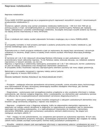 ..:: HARD SYSTEM ::.. Naprawa notebooków Naprawa notebooków Firma HARD SYSTEM specjalizuje się w pogwarancyjnych naprawach wszystkich znanych i renomowanych producentów notebooków. Wystarczy zgłosić usterkę oraz zamiar przesłania notebooka telefonicznie: +48 513-322-708 lub za pomocą poczty e-mail: [email protected], a bezzwłocznie poinformujemy Państwa jak najlepiej opisać, zabezpieczyć i przesłać uszkodzonego notebooka. Szczegóły dotyczące wysyłki podane są również na naszej stronie internetowej w menu WYSYŁKA. Wraz z notebook-iem należy wysłać odpowiedni formularz znajdujący się w menu FORMULARZE. W przypadku kontaktu e-mail prosimy pamiętać o podaniu producenta oraz modelu notebook-a, jak również dokładnego opisu usterki. Automatycznie w chwili przyjęcia notebook-a jest on wpisywany do naszej bazy serwisowej i otrzymuje unikatowy nr zlecenia, dzięki czemu w każdej chwili można uzyskać informacje dotyczącą przebiegu naprawy. W terminie od 1 do 3 dni roboczych otrzymają Państwo informacje co jest uszkodzone i jaki jest przewidywany koszt całkowitej naprawy. To do Państwa należy wówczas decyzja, czy notebook zostanie naprawiony w naszym serwisie, czy też nie. Naprawy z ingerencją w elektronikę realizujemy przeważnie od 1 do 7 dni roboczych, termin uzależniony on jest od rodzaju uszkodzenia oraz dostępności elementów zamiennych. W przypadku braku możliwości naprawy zaproponujemy element używany lub nowy objęty gwarancją. Natomiast w przypadku rezygnacji z naprawy należy pokryć jedynie koszt diagnozy w kwocie 40zł brutto. PROCES NAPRAWY MOŻNA PODZIELIĆ NA POSZCZEGÓLNE ETAPY: - Przyjęcie - następuje wówczas sprawdzenie otrzymanej przesyłki, ocena wizualna stanu technicznego oraz wprowadzenie do bazy serwisowej zawierającej wszelkie niezbędne informacje, jak również otrzymuje unikatowy nr zlecenia. - Diagnostyka - wykonywana jest szczegółowa analiza urządzenia w celu uzyskania informacji o rodzaju uszkodzenia, jak również wstępna diagnoza, który z podzespołów czy elementów jest uszkodzony (proces ten odbywa się na wyspecjalizowanych stanowiskach serwisowo-diagnostycznych). - Wycena - dokonujemy wstępnej wyceny kosztów związanych z zakupem uszkodzonych elementów oraz kosztów usługi serwisowej związanej z napraw oraz testami. - Naprawa - urządzenie wraz z diagnozą wstępną, trafia na odpowiednie stanowisko naprawcze, w zależności od rodzaju usterki określonej w diagnozie (w najprostszych przypadkach jest to stanowisko zajmujące się wymianą podzespołów, a w najtrudniejszych stanowisko do montażu i demontażu elementów SMD/BGA, gdzie jest wymieniany uszkodzony element elektroniczny). Na etapie tym następuje usunięcie usterki. - Test - mający na celu potwierdzenie, czy urządzenie jest sprawne po wykonanej naprawie. W tym celu używane są odpowiednie programy testujące, sprawdzające poprawność działania. Bez względu na rodzaj usterki która została usunięta wykonujemy również testy pozostałych podzespołów. - Wysyłka - ostatnim etapem jest sporządzenie informacji o naprawianej usterce i przekazanie jej wraz z http://www.hardsystem.pl Kreator PDF Utworzono 2 March, 2017, 14:15 ..:: HARD SYSTEM ::.. urządzeniem do zleceniodawcy naprawy. W przypadku wysyłki kurierskiej urządzenie jest starannie pakowane w odpowiednie opakowanie wraz z wypełniaczami. Forma przekazania zależy od deklaracji użytkownika, którą złożył w pierwszym etapie.Posiadasz uszkodzonego notebooka? Zadzwoń: +48 513-322-708 lub wyślij e-mail: [email protected] {mospagebreak title=Rodzaje napraw} Rodzaje napraw Usuniemy każdą usterkę sprzętową oraz programową. WYKONUJEMY NAPRAWY ORAZ WYMIANY: - - naprawa płyt głównych (np. gniazd RAM, LAN, USB, PCMCIA, chipsetów SMD i BGA, układów zasilania CPU), - - naprawa układów elektroniki matryc LCD, - - naprawa zasilaczy np. po przepięciu z sieci elektrycznej, - - naprawa lub wymiana gniazd zasilania, - - naprawa układu ładowania baterii, - - naprawa kontrolera klawiatury, - - naprawa pęknięć mechanicznych obudowy, - - naprawa układów wizji, - - wymiana układów podświetlania matryc (świetlówek), - - wymiana inwerterów matryc, - - wymiana taśm sygnałowych, - - wymiana uszkodzonych mechanicznie zawiasów matrycy, - - wymiana uszkodzonych podzespołów np. dysku twardego, napędy optyczne czy pamięci, - - czyszczenie klawiatur i płyt głównych np. po zalaniu, - - czyszczenie i konserwacja kanałów wentylacyjnych radiatora CPU. WYKONUJEMY RÓWNIEŻ USŁUGI TAKIE JAK: - - montaż podzespołów takich jak. pamięć, dysk twardy, napęd optyczny itp., - - konfiguracja połączeń internetowych - karty sieciowej LAN lub Wi-Fi, - - regeneracja baterii związana ze zwiększeniem pojemności, - - instalacja systemów operacyjnych Windows, http://www.hardsystem.pl Kreator PDF Utworzono 2 March, 2017, 14:15 ..:: HARD SYSTEM ::.. - - instalacja aplikacji biurowych i ich konfiguracja, - - formatowanie oraz podziału dysku twardego na partycje, - - usuwanie wirusów i złośliwego oprogramowania, - - odzyskiwanie danych z dysków i kart pamięci, - - archiwizowanie danych, - - oklejanie pokrywy matrycy, - - lakierowanie obudowy. Przedstawiony powyżej zakres usług jest bardzo ogólny - bowiem naszym wyzwaniem jest wyeliminować każdą powstałą usterkę - tak aby Państwo w pełni mogli korzystać z walorów użytkowych własnego notebook-a. Dążymy także z każdym dniem do skrócenia czasu potrzebnego na dokonanie naprawy. Posiadamy dostęp do podzespołów i elementów do notebook-ów, zarówno nowych, jak i używanych, w zależności od parametrów, przeznaczenia oraz dostępności ! To Państwo decydują czy np. w przypadku uszkodzenia najdroższych podzespołów takich jak: matrycy lub płyty głównej, do naprawy będzie użyta część nowa czy używana. W przypadku starszych modeli notebook-ów może okazać się bowiem, iż nowa