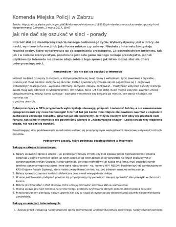 Komenda Miejska Policji w Zabrzu Źródło: http://zabrze.slaska.policja.gov.pl/k29/informacje/wiadomosci/192535,Jak-nie-dac-sie-oszukac-w-sieci-porady.html Wygenerowano: Czwartek, 2 marca 2017, 15:07 Jak nie dać się oszukać w sieci - porady Internet stał się nieodłączną częścią naszego codziennego życia. Wykorzystywany jest w pracy, do nauki, wymiany informacji lub jako forma relaksu czy zabawy. Niestety z Internetu korzystają również osoby, które wykorzystują go do popełniania przestępstw. Za pośrednictwem Internetu, tak jak i w świecie rzeczywistym, popełniana jest cała gama różnego rodzaju przestępstw, jednak użytkownicy Internetu nie zawsze zdają sobie z tego sprawę jak łatwo można stać się ofiarą cyberprzestępczości. Kompendium - jak nie dać się oszukać w Internecie Internet na dzień dzisiejszy to medium, w którym przeplata się świat realny z wirtualnym, życie zawodowe i prywatne... Granica jest coraz cieńsza i zaczyna się zacierać. Postęp cywilizacyjny zmusza nas do pogodzenia się z „częściową wirtualizacją” naszego życia – wymiana informacji, rozrywka, zakupy, bankowość… Praktycznie wszystkie aspekty realnego świata mają swój oddźwięk w cyberprzestrzeni. Jest szybko, tanio i 24 h na dobę. Kupić można wszystko, zawrzeć umowę ubezpieczeniową, założyć konto bankowe - wszystko w Internecie bez biegania po mieście, bez stania w kolejce, nie martwiąc się o godziny otwarcia. Cyberprzestępcy w 99% przypadkach wykorzystują nieuwagę, pośpiech i naiwność ludzką, a nie zawansowane oprogramowanie czy nowe technologie! Internet tak jak każde inne miejsce nie powinien zwalniać z czujności i zachowania zdrowego rozsądku, gdyż tak jak nie uwierzymy, że w życiu realnym nikt obcy nie przekaże nam fortuny, tak samo w Internecie nie powinniśmy wierzyć w „nadzwyczajne okazje”! Lepiej stracić trzy niepewne okazje, niż raz dać się oszukać. Przestrzegając kilku podstawowych zasad można ustrzec się przed przykrymi następstwami nieuczciwej aktywności różnych oszustów. Podstawowe zasady, które podnoszą bezpieczeństwo w Internecie Zakupy w sklepie internetowym: 1. Należy sprawdzić opinie o sklepie - jak przebiegały zakupy innych, czy ktoś zgłaszał jakieś nieprawidłowości (można korzystać z opinii w serwisie takich jak www.ceneo.pl lub www.opineo.pl czy sprawdzić na forach znalezionych z wykorzystaniem choćby Google). Należy pamiętać, że sklep internetowy jak każda inna firma, musi posiadać numer telefonu stacjonarnego oraz adres i inne dane rejestracyjne – np. numery NIP i REGON. Powinien być też zamieszczony nr KRS (Krajowy Rejestr Sądowy), który można zweryfikować on-line, np. pod adresem www.krs-online.com.pl. 2. Należy sprawdzić poprzez kontakt telefoniczny oraz e-mail wiarygodność sklepu. 3. W razie jakichkolwiek podejrzeń powinno się przynajmniej przy pierwszym zakupie sprawdzić stan przesyłki w obecności kuriera. 4. Dobrze jest korzystać z ofert sklepów, które oferują możliwość śledzenia statusu zamówienia. 5. Ważną sprawą jest fakt istnienia na stronie sklepu protokołu szyfrowania danych podczas dokonywania zakupów. 6. Przed przesłaniem pieniędzy należy upewnić się, czy w naszej skrzynce poczty elektronicznej pojawiło się potwierdzenie zamówienia. Zakupy na aukcjach internetowych: 1. Zawsze przed transakcją należy przejrzeć opinię (komentarze) użytkownika portalu aukcyjnego, należy również pamiętać, że nie liczy się tylko duża ilość pozytywnych komentarzy, które mogą być celowo „wypracowane” poprzez zakupy przedmiotów o znikomej wartości, ale też ich statystyka – na przykład kilka ostatnio dodanych negatywnych komentarzy może świadczyć o przejęciu konta uczciwie handlującego użytkownika przez dokonującego oszustwa przestępcę. 2. Należy pamiętać, że nie ma „super okazji” – zbyt niska cena też może sugerować ryzyko oszustwa. 3. O fakcie czy bierzemy udział w nieuczciwej aukcji, może powiedzieć opis aukcji lub załączone do niej zdjęcia. Pamiętać należy, że jeżeli zdjęcia nie są wykonane przez sprzedającego, tylko pochodzą np. ze strony producenta lub innej aukcji, może to świadczyć, iż sprzedający nie jest w posiadaniu wystawianego na sprzedaż towaru. 4. Jakiekolwiek podejrzenia, powinny skutkować odstąpieniem od transakcji. 5. Przed dokonaniem zapłaty powinno się skontaktować ze sprzedawcą – im więcej informacji o sobie udostępnia (np. adres i telefon) tym lepiej. 6. W wypadku przedpłaty na konto należy wybierać tylko doświadczonych i pozytywnie opiniowanych sprzedawców. 7. Unikajmy bezwzględnie dokonywania zapłaty za zakupiony towar poprzez różne systemy płatności, które nie pozwalają w żaden sposób zidentyfikować odbiorcę naszej płatności, takich jak Western Union lub ostatnio wprowadzany system zdalnego przekazywania pieniędzy poprzez sieć bankomatów, umożliwiający dokonywanie wypłat bez konieczności posiadania karty bankomatowej, a jedynie posiadając telefon komórkowy – Hal-Cash. W celu skorzystania z usługi Hal-Cash i pobrania gotówki z bankomatu, potrzebne są wyłącznie kody, które można otrzymać np. SMS’em, bezpośrednio po zleceniu dokonanym przez nadawcę. W przypadku zaistnienia oszustwa, przestępca wybiera nasze pieniądze w każdym miejscu naszego kraju, a pozostaje po nim jedynie numer telefonu komórkowego, który najczęściej jest numerem pre-paid, użytym raz do popełnienia przestępstwa. 8. Nie należy dokonywać transakcji przez tzw. „kupowanie poza aukcją”. (Oszuści najczęściej traktują serwis aukcyjny jako sposób pozyskania ofiary. Przestępca proponuje nieświadomej zagrożenia osobie zakup po niższej cenie, ale bez pośrednictwa serwisu – choćby po to, by uniknąć opłat pobieranych przez serwis aukcyjny. Należy wziąć pod uwagę, że późniejsze dochodzenie swoich rosz