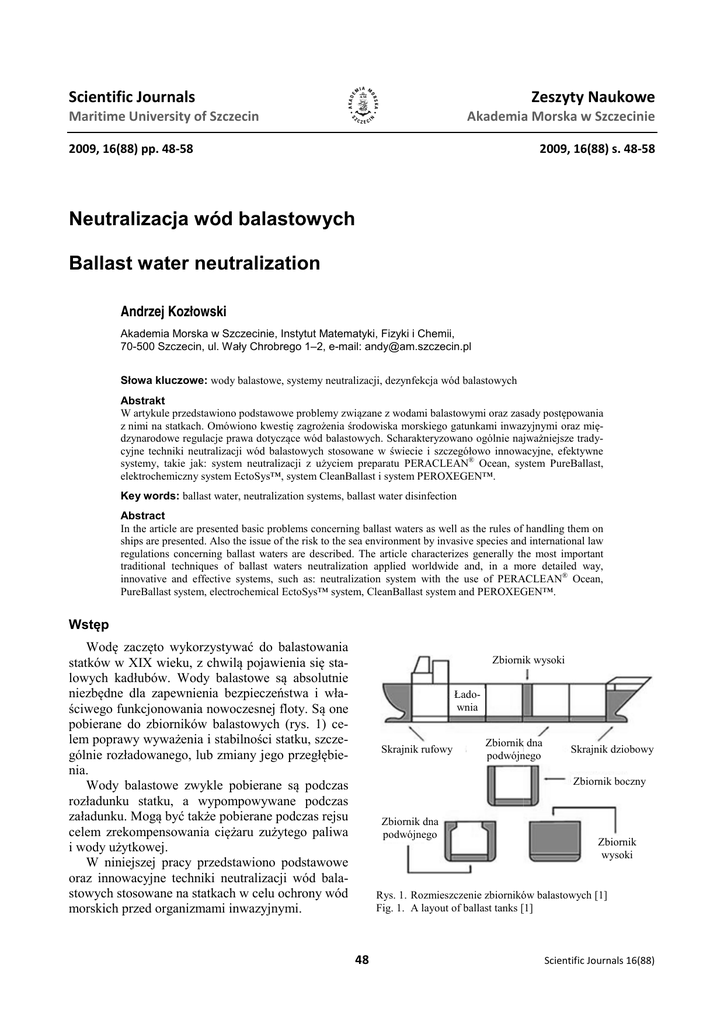 Scientific Journals Zeszyty Naukowe Maritime University of Szczecin Akademia Morska w Szczecinie 2009, 16(88) pp. 48-58 2009, 16(88) s. 48-58 Neutralizacja wód balastowych Ballast water neutralization Andrzej Kozłowski Akademia Morska w Szczecinie, Szczecinie Instytut Matematyki, Fizyki i Chemii, 70-500 500 Szczecin, ul. Wały Chrobrego 1–2, e-mail: [email protected] Słowa kluczowe: wody balastowe, systemy neutralizacji, dezynfekcja wód balastowych Abstrakt W artykule przedstawiono wiono podstawowe problemy związane zwi z wodami balastowymi oraz zasady postępowania z nimi na statkach. Omówiono kwestię kwesti zagrożenia środowiska rodowiska morskiego gatunkami inwazyjnymi oraz mięmi dzynarodowe regulacje prawa dotyczące dotycz wód balastowych. Scharakteryzowano ogólnie najważniejsze najwa tradycyjne techniki neutralizacji wód balastowych stosowane w świecie i szczegółowo innowacyjne, efektywne systemy, takie jak: system neutralizacji z użyciem u preparatu PERACLEAN® Ocean, system PureBallast, elektrochemiczny system EctoSys™, EctoSys system CleanBallast i system PEROXEGEN™. Key words: ballast water, neutralization systems, ballast water disinfection Abstract In the article are presented basic asic problems concerning ballast waters as well as the rules of handling them on ships aree presented. Also the issue of the risk to the sea environment by invasive species and international law regulations concerning ballast waters water are described. The article characterizes generally the most important traditional techniques of ballast waters water neutralization ralization applied worldwide and, in a more detailed way, innovative and effective systems, such as: neutralization system with the use of PERACLEAN® Ocean, PureBallast system, electrochemical EctoSys™ system, CleanBallast system and PEROXEGEN™. Wstęp Wodę zaczęto wykorzystywaćć do balastowania statków w XIX wieku, z chwiląą pojawienia się si stalowych kadłubów. Wody balastowe są s absolutnie niezbędne dne dla zapewnienia bezpieczeństwa bezpiecze i właściwego ciwego funkcjonowania nowoczesnej floty. S Są one pobierane do zbiorników balastowych (rys. 1) cec lem poprawy wyważenia enia i stabilności statku, stat szczególnie rozładowanego, lub zmiany jego przegłębieprzegł nia. Wody balastowe zwykle pobierane są s podczas rozładunku statku, a wypompowywane podczas załadunku. Mogą być takżee pobierane podczas rejsu celem zrekompensowania ciężaru aru zu zużytego paliwa i wody użytkowej. W niniejszej pracy przedstawiono ono podstawowe oraz innowacyjne techniki neutralizacji wód balabal stowych stosowane na statkach w celu ochrony wód morskich przed organizmami inwazyjnymi. Zbiornik wysoki Ładownia Skrajnik rufowy Zbiornik dna podwójnego Skrajnik dziobowy Zbiornik boczny Zbiornik dna podwójnego Zbiornik wysoki Rys. 1. Rozmieszczenie zbiorników balastowych [1] Fig. 1. A layout of ballast tanks [1] 48 Scientific Journals 16(88) Neutralizacja wód balastowych Zagrożenie środowiska rodowiska morskiego wodami balastowymi modernizowanych, a najpóźniej najpó od 2016 roku wszystkich statków. Statki podczas realizacji swoich zadań zada pobierają wody balastowe do pustych zbiorników w pobliżu pobli portu, gdzie zostały rozładowane i wypompowują je przy docelowym porcie, celem przygotowania przygoto zbiorników do przyjęcia cia nowego ładunku (rys. 2). Zagrożenie inwazyjnymi gatunkami atunkami morskimi jest jednym z czterech największych kszych zagrożeń zagro oceanów świata. Chociaż to zagrożenie żenie nie jest tak widoczne, jak w przypadku oleju, to wpływ inwainw zyjnych gatunków morskich często ęsto bywa znacznie groźniejszy dla środowiskaa morskiego, gdyż gdy ma nieodwracalne skutki.. W wielu pracach na przykłaprzykł dzie setek przypadków udokumentowano, że wody balastowe mogą być przyczynąą wprowadzenia do środowiska rodowiska nowych organizmów. Jeż Jeżeli organizmy te mają warunki, aby stać się inwazyjnymi, inwazyj może to poważnie zakłócić rodzimą równowagę równowag ekologiczną. W Morzu Bałtyckim, według prof. Leppäkoski [2], stwierdzono już obecność co najmniej 110 gatunków inwazyjnych, z których 60–70 60 utworzyło reprodukcyjne populacje. Pierwsze uregulowania dotyczące zasad postępost powania z wodami balastowymi zostały podjęte przez Międzynarodową Organizację Morską (IMO) w 1991 roku i od roku 1994 trwały prace nad wprowadzeniem ich w życie. ycie. Proces regulacji zoz stał przerwany w późnych nych latach dziewi dziewięćdziesiątych, kiedy uznano, że konieczna czna jest aktualizacja przyjętych rozwiązań. W 2002 roku na konferencji w Ontario, poświęconej conej temu zagadnieniu, rozpatrywano 14 możliwych liwych technologii neutralizacji wód balastowych [3]. Mimo dużego żego post postępu, jaki się dokonał, pojawiało się jednak nadal wiele problemów i wątpliwości ci ze strony armatorów, stoczni oraz sprawujących kontrolę władz portowych, które wymagają uregulowania. W celu ich rozwi rozwiązania Międzynarodowa dzynarodowa Organizacja Morska połączyła poł siły z Global Environment Facility (GEF) i United Nations Development elopment Programme (UNDP), aby pomóc państwom rozwijającym cym się w ochronie przed gatunkami inwazyjnymi. Przyjęta Przyję przez IMO w 2004 roku w Londynie konwencja Ballast Water Convention wytyczyła kierunki działań działa na statku dotyczące ce wód balastowych, aby zminimal zminimalizować zagrożenie dla środowiska rodowiska morskiego. Zobowiązuje Zobowi ona m.in. wszystkie statki do wprowadzenia planu BWSMP (Balast Balast Water and Sediments Plan) Plan i posiadania książki BWRB (Ballast Ballast Water Record Book). Zgodnie z ustaleniami IMO, małe i średnie statki o pojemności zbiorników biorników balastowych poniżej poni 5000 m3, których stępka będzie dzie poło położona od 1.01.2009 r., będą musiały być wyposa wypo