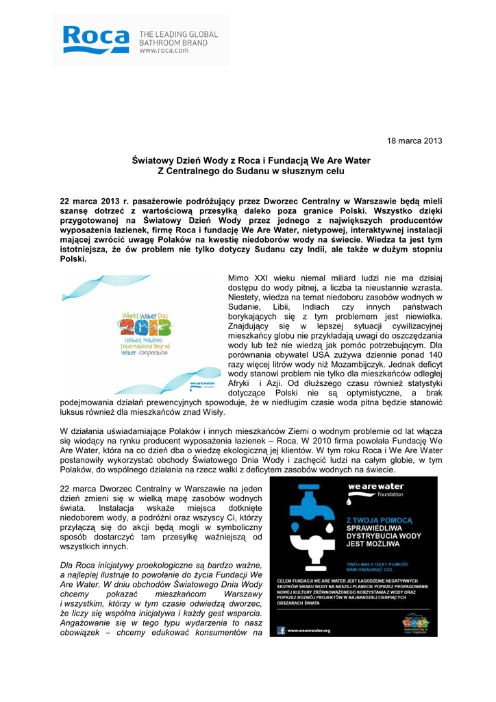 18 marca 2013 Światowy Dzień Wody z Roca i Fundacją We Are Water Z Centralnego do Sudanu w słusznym celu 22 marca 2013 r. pasaŜerowie podróŜujący przez Dworzec Centralny w Warszawie będą mieli szansę dotrzeć z wartościową przesyłką daleko poza granice Polski. Wszystko dzięki przygotowanej na Światowy Dzień Wody przez jednego z największych producentów wyposaŜenia łazienek, firmę Roca i fundację We Are Water, nietypowej, interaktywnej instalacji mającej zwrócić uwagę Polaków na kwestię niedoborów wody na świecie. Wiedza ta jest tym istotniejsza, Ŝe ów problem nie tylko dotyczy Sudanu czy Indii, ale takŜe w duŜym stopniu Polski. Mimo XXI wieku niemal miliard ludzi nie ma dzisiaj dostępu do wody pitnej, a liczba ta nieustannie wzrasta. Niestety, wiedza na temat niedoboru zasobów wodnych w Sudanie, Libii, Indiach czy innych państwach borykających się z tym problemem jest niewielka. Znajdujący się w lepszej sytuacji cywilizacyjnej mieszkańcy globu nie przykładają uwagi do oszczędzania wody lub teŜ nie wiedzą jak pomóc potrzebującym. Dla porównania obywatel USA zuŜywa dziennie ponad 140 razy więcej litrów wody niŜ Mozambijczyk. Jednak deficyt wody stanowi problem nie tylko dla mieszkańców odległej Afryki i Azji. Od dłuŜszego czasu równieŜ statystyki dotyczące Polski nie są optymistyczne, a brak podejmowania działań prewencyjnych spowoduje, Ŝe w niedługim czasie woda pitna będzie stanowić luksus równieŜ dla mieszkańców znad Wisły. W działania uświadamiające Polaków i innych mieszkańców Ziemi o wodnym problemie od lat włącza się wiodący na rynku producent wyposaŜenia łazienek – Roca. W 2010 firma powołała Fundację We Are Water, która na co dzień dba o wiedzę ekologiczną jej klientów. W tym roku Roca i We Are Water postanowiły wykorzystać obchody Światowego Dnia Wody i zachęcić ludzi na całym globie, w tym Polaków, do wspólnego działania na rzecz walki z deficytem zasobów wodnych na świecie. 22 marca Dworzec Centralny w Warszawie na jeden dzień zmieni się w wielką mapę zasobów wodnych świata. Instalacja wskaŜe miejsca dotknięte niedoborem wody, a podróŜni oraz wszyscy Ci, którzy przyłączą się do akcji będą mogli w symboliczny sposób dostarczyć tam przesyłkę waŜniejszą od wszystkich innych. Dla Roca inicjatywy proekologiczne są bardzo waŜne, a najlepiej ilustruje to powołanie do Ŝycia Fundacji We Are Water. W dniu obchodów Światowego Dnia Wody chcemy pokazać mieszkańcom Warszawy i wszystkim, którzy w tym czasie odwiedzą dworzec, Ŝe liczy się wspólna inicjatywa i kaŜdy gest wsparcia. AngaŜowanie się w tego typu wydarzenia to nasz obowiązek – chcemy edukować konsumentów na wszelkie moŜliwe sposoby: nie tylko dając im produkty wyposaŜone w technologie pozwalające oszczędzać wodę, ale takŜe przez takie niestandardowe akcje – podkreśla Joanna Dec-Galuk, Marketing Manager w ROCA Polska. Instalacja w hali biletowej na Dworcu Centralnym będzie dostępna w godzinach 10 – 16. Informacje o firmie ROCA ROCA oferuje produkty wyposaŜenia łazienki, kładąc nacisk na ich design i funkcjonalność. W ofercie firmy znajdują się kompleksowe wyposaŜenie przestrzeni łazienkowej – ceramika, baterie, stelaŜe podtynkowe i przyciski, wanny, meble łazienkowe oraz dodatki, i płytki ceramiczne. Firma zatrudnia 21 100 pracowników, posiada 76 zakładów produkcyjnych i jest obecna w ponad 135 krajach na całym świecie. ROCA jest światowym liderem w swojej branŜy. Grupa z hiszpańskim kapitałem dominuje nie tylko na rynkach Europy, lecz takŜe Ameryki Łacińskiej, w Indiach i Rosji. Z sukcesem działa teŜ w Chinach, na Bliskim Wschodzie oraz wielu krajach Azji i Afryce. www.roca.com Więcej informacji na stronie www.roca.pl Fundacja We Are Water Fundacja We Are Water została załoŜona w 2010 roku z inicjatywy hiszpańskiego producenta wyposaŜenia łazienek ROCA. Fundacja jest organizatorem akcji charytatywnych oraz zbiórek pieniędzy przeznaczonych dla państw borykających się z problemem deficytu wody oraz fatalnymi warunkami sanitarnymi. Troszcząc się o równowagę środowiska naturalnego, zajmuje się ona równieŜ promowaniem wiedzy na temat świadomego i rozsądnego korzystania z zasobów tego najcenniejszego surowca naturalnego. Więcej informacji na stronie www.wearewater.org Światowy Dzień Wody Święto ustanowione na 22 marca przez Organizację Narodów Zjednoczonych w 1992 roku podczas Konferencji Szczyt Ziemi w Rio de Janeiro w Brazylii. Ideą obchodów Światowego Dnia Wody jest podnoszenie poziomu świadomości na temat wpływu prawidłowej gospodarki wodnej państw członkowskich na kondycję gospodarczą i społeczną oraz zwracanie uwagi na problemy z dostępem do wody pitnej milionów ludzi na całym świecie. Więcej informacji na stronie www.unwater.org