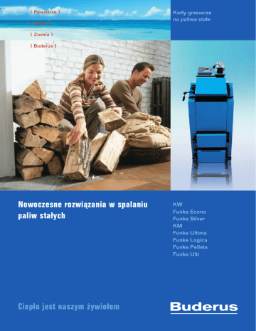 [ Powietrze ] [ Woda ] Kotły grzewcze na paliwa stałe [ Ziemia ] [ Buderus ] Nowoczesne rozwiązania w spalaniu paliw stałych Ciepło jest naszym żywiołem KW Funke Econo Funke Silver KM Funke Ultima Funke Logica Funke Pellets Funke Ulti Stalowe kotły retortowe KW Typoszereg KW zalecany jest dla użytkowników wymagających optymalnego komfortu użytkownika kotła. Kocioł zawiera układ automatycznego podawania paliwa oraz elektroniczny sterownik temperatury i pomp c.o. Zaawansowana budowa wymiennika zawierająca 3 ciągi spalania, palenisko retortowe zapewniają niską emisję zanieczyszczeń i sprawność urządzenia sięgającą 83%. Komfort użytkowania podnosi kosz zasypowy o zwiększonej pojemności (uzupełnienie paliwa od 2 do 4 dni). Optymalny komfort użytkowania kotła Konstrukcja kotła została opracowana na podstawie wieloletnich badań z myślą o wysokim komforcie cieplnym, eksploatacyjnym oraz z dbałością o ekologię. Kocioł ma budowę 3-ciągową w postaci pionowych kanałów konwekcyjnych, stanowiących powierzchnię wymiany ciepła. Wyposażony jest od frontu w drzwiczki do komory załadunkowej, drzwiczki wyczystne kanałów konwekcyjnych oraz drzwiczki popielnika. Korpus wykonano z atestowanych stali. Kocioł KW wyposażony jest w palnik retortowy z podajnikiem ślimakowym oraz kosz zasypowy. Sterownik kotła obsługuje pracę podajnika i wentylatora i zapewnia obsługę pomp c.o. oraz pomp do ładowania zasobnika c.w.u. Termostat pokojowy (wyposażenie dodatkowe) zapewnia komfort sterowania pracą kotła według temperatury pomieszczenia referencyjnego. Kotły KW oferowane są również z regulatorem pogodowym, umożliwiającym tygodniowe programowanie pracy w zależności od temperatury zewnętrznej. Automatyka umożliwia sterowanie pompą c.o. i posiada zabezpieczenie STB. 2 Kotły na „eko-groszek” KW „Bardzo dobrze, że istnieje opcja z dodatkowym rusztem – zapewnia to komfort w sytuacjach awaryjnych jak np. chwilowy brak dostawy paliwa podstawowego” KW w pigułce: stalowy kocioł grzewczy, którego paliwem podstawowym jest węgiel kamienny sortymentu 31.2 – tzw. „eko-groszek”, palnik retortowy zamknięty, wykonany KW KW – opcja z dodatkowym rusztem z żeliwa szarego ze specjalnym systemem nadmuchu powietrza, paliwo podawane poprzez podajnik ślimakowy ze wzmocnionym motoreduktorem, Dodatkowy ruszt – dodatkowy komfort wysoka sprawność do 83%, W ofercie występują 2 wersje kotła: KW bez rusztu, a także KW z dodatkowym rusztem możliwość podłączenia zbiornika c.w.u., (opcja). który jest urządzeniem posiadającym dodatkowe palenisko rusztowe umieszczo- przy zastosowaniu sterownika ne nad retortowym. Umożliwia ono pracę kotła w sytuacjach awaryjnych, wynikających z programowaniem tygodniowym z braku dostaw paliwa podstawowego, energii elektrycznej w dłuższym okresie, awarii (reg. A3000 EI) możliwość zastosowania podajnika ślimakowego lub palnika retortowego. Palenisko rusztowe, w przeciwieństwie czujnika pogodowego, do bezrusztowego, pozwala na okresowe spalanie innych paliw, np. węgla kamiennego. dodatkowy ruszt żeliwny, umożliwia Wówczas proces spalania regulowany jest ręcznie przepustnicą powietrza lub miarkow- spalanie paliwa zastępczego nikiem ciągu. Kotły z dodatkowym rusztem oferowane są w wersjach do 50 KW. (węgla i drewna) w sytuacjach awaryjnych. 3 Stalowe kotły retortowe Funke Econo Funke Econo zalecany jest dla użytkowników wymagających komfortu obsługi kotła. Kocioł zawiera układ automatycznego podawania paliwa oraz elektroniczny sterownik temperatury wody w kotle i pomp c.o. Zaawansowana budowa wymiennika zawierająca 3 ciągi spalania, palenisko retortowe zapewniają niską emisję zanieczyszczeń i sprawność urządzenia sięgającą 85%. Komfort użytkowania podnosi kosz zasypowy o zwiększonej pojemności (uzupełnienie paliwa średnio od 2 do 4 dni). Bezpieczeństwo i ekologia Funke Econo został zaprojektowany jako jedna z niewielu konstrukcji na rynku z myślą o wykorzystaniu techniki spalania retortowego. Oferowany w opcji układ sterowania kaskadowego pozwala na jednoczesne sterowanie pracą nawet do 10 kotłów. Kocioł posiada atest na znak bezpieczeństwa ekologicznego wydany przez Instytut Chemicznej Przeróbki Węgla w Zabrzu. Budowa kotła umożliwia także zastępcze spalanie drewna i węgla kamiennego. 4 Kotły na „eko-groszek” Funke Econo Funke Econo Nowowoczesna, solidna konstrukcja Funke Econo w pigułce: Konstrukcja została opracowana na podstawie wieloletnich badań z myślą o wysokim stalowy kocioł grzewczy, którego paliwem komforcie cieplnym, eksploatacyjnym oraz z dbałością o ekologię. Kocioł ma budowę podstawowym jest węgiel kamienny sorty- 3-ciągową w postaci pionowych i poziomych kanałów spalinowych, stanowiących po- mentu 31.2 – tzw. „eko-groszek”, wierzchnię wymiany ciepła. Komora spalania wyłożona jest częściowo szamotem. Kocioł 3-ciągowa budowa kotła, wyposażony jest od frontu w drzwiczki do komory załadunkowej, drzwiczki wyczystne palnik retortowy zamknięty, wykonany kanałów konwekcyjnych oraz drzwiczki popielnika. Korpus wykonano z atestowanych z żeliwa szarego ze specjalnym systemem stali i spawano w osłonie argonu. Funke Econo wyposażony jest w palnik retortowy nadmuchu powietrza, z podajnikiem ślimakowym oraz kosz zasypowy. Modele do 50 kW posiadają ruszt żeliw- paliwo podawane poprzez podajnik ślima- ny do spalania drewna lub węgla. Sterownik kotła obsługuje pracę podajnika i wentylatora kowy ze wzmocnionym motoreduktorem, i zapewnia obsługę pomp co. oraz pomp do ładowania zasobnika. Termostat pokojowy wysoka sprawność do 83%, (wyposażenie dodatkowe) zapewnia komfort sterowania pracą kotła z pokoju. Sterow- możliwość spalania węgla i drewna metodą nik kotła Funke Econo steruje pracą pomp c.o., pompy c.w.u., pracą podajnika, pracą rusztową, przy niewielkim nakładzie pracy. wen