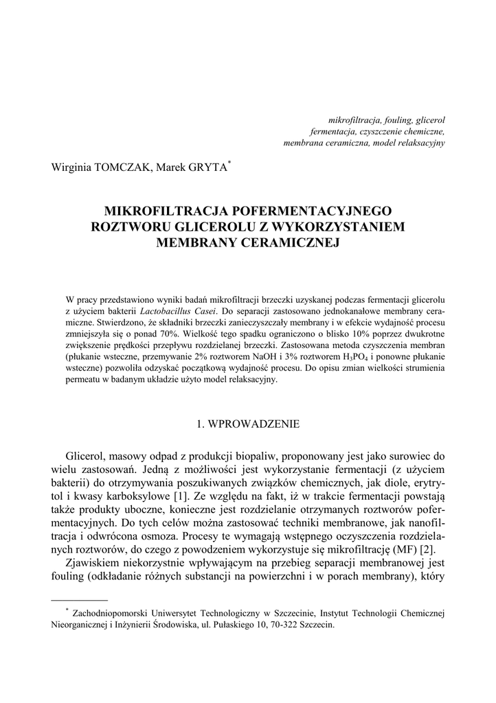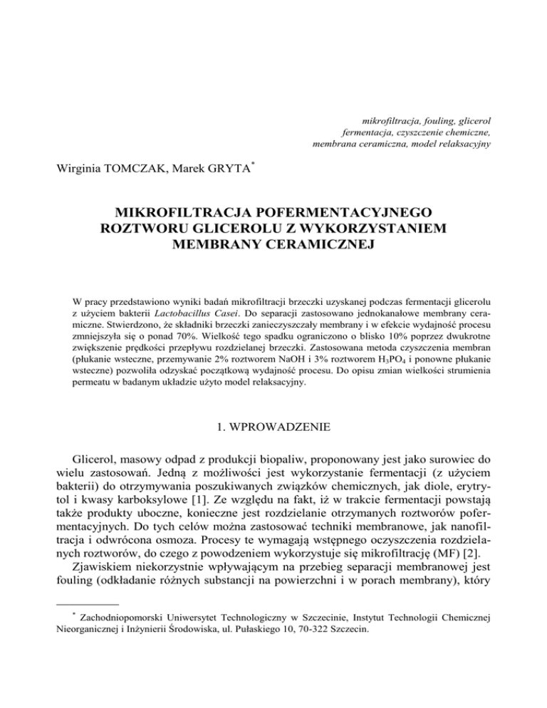 Mikrofiltracja pofermentacyjnego roztworu glicerolu z - Eko-DOk