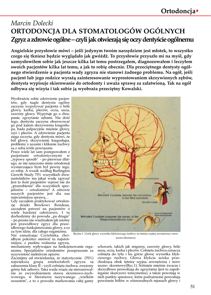 Ortodoncjas Marcin Dolecki ORTODONCJA DLA STOMATOLOGÓW OGÓLNYCH Zgryz a zdrowie ogólne – czyli jak otwierają się oczy dentyście ogólnemu Angielskie przysłowie mówi – jeśli jedynym twoim narzędziem jest młotek, to wszystko czego się tkniesz będzie wyglądało jak gwóźdź. To przysłowie przyszło mi na myśl, gdy uzmysłowiłem sobie jak jeszcze kilka lat temu postrzegałem, diagnozowałem i leczyłem swoich pacjentów kilka lat temu, a jak to robię obecnie. Dla przeciętnego dentysty ogólnego stwierdzenie u pacjenta wady zgryzu nie stanowi żadnego problemu. Na ogół, jeśli pacjent lub jego rodzice wyrażą zainteresowanie wyprostowaniem skrzywionych zębów, dentysta wypisuje skierowanie do ortodonty i uważa sprawę za załatwioną. Tak na ogół odbywa się wizyta i tak sobie ją wyobraża przeciętny Kowalski. Wyobraźcie sobie zdziwienie pacjentów, gdy nagle dentysta ogólny zaczyna wypytywać pacjenta o bóle głowy, karku, pleców, oczu, uszu, zawroty głowy. Wypytuje go o chrapanie, zgrzytanie zębami. Nie dość tego, dentysta zaczyna obserwować go pod kątem skrzywienia kręgosłupa, bada palpacyjnie mięśnie głowy, szyi i pleców. A zdziwienie pacjenta sięga szczytu, gdy dentysta mówi, że ból głowy, skrzywienie kręgosłupa, problemy z uszami i klikanie żuchwy są z sobą ściśle powiązane. Przez wiele lat sam postępowałem z pacjentami ortodontycznymi w „typowy sposób" - po pierwsze dlatego, że nie nauczono mnie ortodoncji wystarczająco bym był pewny tego, co robię. A wszak według Burlington Growth Study 75% wszystkich dwunastolatków ma jakąś wadę zgryzu! Jest to ilość pacjentów wprost nie do „przerobienia" dla wszystkich specjalistów – ortodontów! A zdrowie naszych pacjentów jest dla nas najważniejszą sprawą… Gdy zacząłem praktykować ortodoncję dzięki Brockowi Rondeau, zacząłem patrzeć na pacjentów o wiele bardziej całościowo. I tu dochodzimy do powodu „po drugie" – po prostu nie wiedziałem jak istotny jest prawidłowy zgryz dla prawidłowego funkcjonowania głowy, a co za tym idzie, dla całego organizmu. Rycina 1. Ucisk głowy wyrostka kłykciowego żuchwy na tętnicę szyjną zewnętrzną i nerw Nie zanudzając Czytelnika, chciuszno-skroniowy ałbym pokrótce omówić tu najistotniejsze, z punktu widzenia zgryzu, mechanizmy wpływające na funkcjonowanie orga- schorzeń, takich jak migreny, zawroty głowy, bóle nizmu. Specjalistów ortodontów przepraszam za uszu, oczu, karku i pleców. Cofnięta żuchwa oznacza cofniętą do tyłu i ku górze głowę wyrostka kłykoczywistość niektórym opisów. Zacznijmy od stwierdzenia, że statystycznie (70%) ciowego żuchwy. Głowa kłykcia uciska przenajwiększą grupą zniekształceń zgryzu są chodzącą obok tętnicę szyjną zewnętrzną i nerw zaburzenia klasy II – czyli cofnięta żuchwa, zwężony uszno- skroniowy(Ryc.1). Ściśnięte mięśnie żwacze i górny łuk zębowy. Taka wada wiąże się nierozerwal- skrzydłowe prowokują do zgrzytania (jest to zapobnie ze zwyrodnieniem stawu skroniowo-żuch- ieganie skurczowi tonicznemu), a także powstają w wowego, w literaturze nazywanego „wielkim nich punkty spustowe, które podrażnione powodują oszustem", a to z powodu markowania całej gamy powstanie bólów w różnorodnych rejonach głowy i 51 sOrtodoncja szyi. Czy zdarzyło Ci się Czytelniku leczyć kanałowo całe kwadranty kanałowo bez wyraźnej przyczyny – bo bolały? I co najgorsze, bóle po leczeniu nie przechodziły? To są właśnie najczęściej efekty podrażnień punktów spustowych, których lokalizację pozwolę sobie przedstawić w jednym z następnych artykułów opisującym przyczyny i sposoby leczenia większości bólów głowy. Zwężony górny łuk zębowy oznacza podniesienie sklepienia podniebienia co utrudnia oddychanie przez nos, ponieważ powoduje to zmniejszenie pojemności jamy nosa. Bardzo często powodem wad zgryzu jest przerost migdałków – środkowego i lub/i podniebiennych. Przerost środkowego migdałka blokuje nosogardziel i prowokuje do oddychania przez usta. A w ustach mamy dwa mięśniowe aparaty ortodontyczne, które gdy są w równowadze, korzystnie wpływają na kształt łuków zębowych i całej jamy ustnej. Język, który 2000 razy na dobę przy przełykaniu rozpycha się rozszerzając górny łuk zębowy jest jednym z nich. Mięśnie żwacze i skrzydłowe, które przy nieprawidłowym oddychaniu przez usta zwężają ten sam łuk. Żuchwa, chcąc nie chcąc, by „dopasować się" do wąskiego łuku zębowego, musi się cofnąć, co powoduje nie tylko zaburzenia ze strony SSŻ i ściśniętych mięśni, ale również ze strony reszty ciała. Zacznijmy jednak od sytuacji fizjologicznej. 52 Ryc. 2 Zdrowe ciało pozostaje w równowadze Przypatrzmy się najpierw ilustracjom na rycinie 2. W sytuacji idealnej żuchwa jest prawidłowo wysunięta do przodu i do dołu, nadzgryz wynosi 1-2mm., płaszczyzna zgryzu jest prostopadła do osi grawitacji, a język ma wystarczająco dużo miejsca dla siebie w jamie ustnej i nie zakłóca drożności dróg oddechowych. Płaszczyzna zgryzu jest równoległa do linii oczu (odzwierciedlającej środkową część czaszki) i linii uszu (odzwierciedlającej podstawę czaszki i SSŻ), a także do podłoża, co umożliwia pełną harmonię kostno – mięśniową z pozostałymi elementami ciała, reprezentowanymi przez pas barkowy (linia ramion pokazuje położenie korpusu, a linia bioder – położenie miednicy). Kolana i stopy są ustawione prawidłowo i w konsekwencji, całe ciało funkcjonuje mechanicznie prawidłowo. Ryc. 3 Wada zgryzu powoduje wielopłaszczyznową deformację ciała Przypatrzmy się teraz najbardziej typowej wadzie zgryzu – klasie II (70% przypadków wad zgryzu). Żuchwa jest cofnięta do góry i do tyłu. Poza typowymi zaburzeniami ze strony SSŻ – bólami głowy, oczu, uszu, zawrotami głowy – mamy zwykle do czynienia z sytuacj