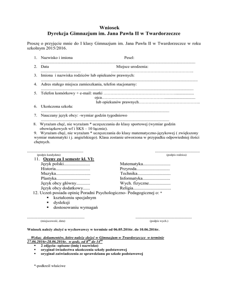 Wniosek o przyjęcie - Gimnazjum im. Jana Pawła II w Twardorzeczce