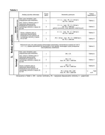 Tabela 1 Zbiorniki Gazy, gazy skroplone, gazy rozpuszczone pod ciśnieniem, pary, ciecze o ciśnieniu pary w najwyższej dopuszczalnej temperaturze wyższym od normalnego ciśnienia o więcej niż 0,5 bar Ciecze o ciśnieniu pary w najwyższej dopuszczalnej temperaturze nie wyższym od normalnego ciśnienia o więcej niż 0,5 bar Grupa płynu Parametry graniczne Tablica Załącznika II 1 V > 1 L oraz PS · V > 25 bar·L lub PS > 200 bar Tablica 1 2 V > 1 L oraz PS · V > 50 bar·L lub PS > 1000 bar gaśnice przenośne, butle aparatów oddechowych Tablica 2 1 V > 1 L oraz PS · V > 200 bar·L lub PS > 500 bar Tablica 3 2 PS > 10 bar oraz PS · V > 10000 bar·L lub PS > 1000 bar Tablica 4 Wytwornice pary lub wody gorącej wytwarzające parę/wodę o temperaturze wyższej niż 110 oC o V > 2 L, opalane płomieniem lub ogrzewane w inny sposób, stwarzające ryzyko przegrzania oraz szybkowary ciśnieniowe Gazy, gazy skroplone, gazy rozpuszczone pod ciśnieniem, Rurociągi 1. Rodzaj urządzenia (z wyjątkiem wytwornic opisanych niżej) Rodzaj czynnika roboczego pary, ciecze o ciśnieniu pary w najwyższej dopuszczalnej temperaturze wyższym od normalnego ciśnienia o więcej niż 0,5 bar Ciecze o ciśnieniu pary w najwyższej dopuszczalnej temperaturze nie wyższym od normalnego ciśnienia o więcej niż 0,5 bar Tablica 5 1 DN > 25 Tablica 6 2 DN > 32 oraz PS · DN > 1000 bar Tablica 7 1 DN > 25 oraz PS · DN > 2000 bar Tablica 8 2 PS > 10 bar, DN > 200 oraz PS · DN > 5000 bar 1. Oznaczenia w Tabeli 1: DN – wymiar nominalny, PS – najwyższe dopuszczalne ciśnienie, V – pojemność ca 9 Tabli