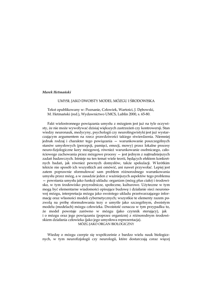 Marek Hetmański UMYSŁ JAKO DWOISTY MODEL