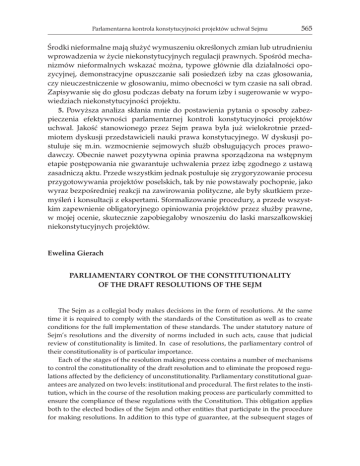 Parlamentarna kontrola konstytucyjności projektów uchwał Sejmu 565 Środki nieformalne mają służyć wymuszeniu określonych zmian lub utrudnieniu wprowadzenia w życie niekonstytucyjnych regulacji prawnych. Spośród mechanizmów nieformalnych wskazać można, typowe głównie dla działalności opozycyjnej, demonstracyjne opuszczanie sali posiedzeń izby na czas głosowania, czy nieuczestniczenie w głosowaniu, mimo obecności w tym czasie na sali obrad. Zapisywanie się do głosu podczas debaty na forum izby i sugerowanie w wypowiedziach niekonstytucyjności projektu. 5. Powyższa analiza skłania mnie do postawienia pytania o sposoby zabezpieczenia efektywności parlamentarnej kontroli konstytucyjności projektów uchwał. Jakość stanowionego przez Sejm prawa była już wielokrotnie przedmiotem dyskusji przedstawicieli nauki prawa konstytucyjnego. W dyskusji postuluje się m.in. wzmocnienie sejmowych służb obsługujących proces prawodawczy. Obecnie nawet pozytywna opinia prawna sporządzona na wstępnym etapie postępowania nie gwarantuje uchwalenia przez izbę zgodnego z ustawą zasadniczą aktu. Przede wszystkim jednak postuluje się zrygoryzowanie procesu przygotowywania projektów poselskich, tak by nie powstawały pochopnie, jako wyraz bezpośredniej reakcji na zawirowania polityczne, ale były skutkiem przemyśleń i konsultacji z ekspertami. Sformalizowanie procedury, a przede wszystkim zapewnienie obligatoryjnego opiniowania projektów przez służby prawne, w mojej ocenie, skutecznie zapobiegałoby wnoszeniu do laski marszałkowskiej niekonstytucyjnych projektów. Ewelina Gierach Parliamentary Control of the Constitutionality of the Draft Resolutions of the Sejm The Sejm as a collegial body makes decisions in the form of resolutions. At the same time it is required to comply with the standards of the Constitution as well as to create conditions for the full implementation of these standards. The under statutory nature of Sejm’s resolutions and the diversity of norms included in such acts, cause that judicial review of constitutionality is limited. In case of resolutions, the parliamentary control of their constitutionality is of particular importance. Each of the stages of the resolution making process contains a number of mechanisms to control the constitutionality of the draft resolution and to eliminate the proposed regulations affected by the deficiency of unconstitutionality. Parliamentary constitutional guarantees are analyzed on two levels: institutional and procedural. The first relates to the institution, which in the course of the resolution making process are particularly committed to ensure the compliance of these regulations with the Constitution. This obligation applies both to the elected bodies of the Sejm and other entities that participate in the procedure for making resolutions. In addition to this type of guarantee, at the subsequent stages of 566 Ewelina Gierach the resolution making process a set of procedures designed to protect the constitutionality of a proposal can be identified. The procedural guaranties can be divided into those that are directly designed to protect the constitutionality of the proposal and those which serve other functions, but in an indirect way contribute to the reflection on the constitutionality of the proposed regulation. The latter ones make up the largest group. The characteristic feature of the parliamentary control of constitutionality is that it is „scattered” in the process of resolution making. The attention to the compliance of a draft resolution with the Constitution starts before submitting the proposal to the Marshal of the Sejm. Then it takes place at the next stages of the resolution making process. The parliamentary control of the resolutions focuses on: the assumptions of the draft resolution, the draft itself, and finally the resolution adopted by the Sejm.