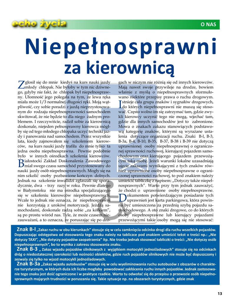 echo życia O NAS Niepełnosprawni Z za kierownicą głosił się do mnie kiedyś na kurs nauki jazdy młody chłopak. Nie byłoby w tym nic dziwnego, gdyby nie fakt, że chłopak był niepełnosprawny. Ułomność jego polegała na tym, że lewa ręka miała może 1/3 normalnej długości ręki. Moją wątpliwość, czy sobie poradzi z jazdą nieprzystosowanym do rodzaju niepełnosprawności samochodem skwitował, że nie będzie to dla niego żadnym problemem. I rzeczywiście, radził sobie za kierownicą doskonale, niejeden pełnosprawny kierowca mógłby się od tego młodego chłopaka uczyć techniki jazdy i panowania nad samochodem. Przez wszystkie lata, kiedy zajmowałem się szkoleniem kierowców, na kurs nauki jazdy trafiła do mnie tylko ta jedna osoba niepełnosprawna. Pewnie podobnie było w innych ośrodkach szkolenia kierowców. iałostocki Zakład Doskonalenia Zawodowego miał swego czasu samochód przystosowany do nauki jazdy osób niepełnosprawnych. Mogły się na nim szkolić osoby pozbawione kończyn dolnych. Jednak na szkolenie inwalidzi zgłaszali się sporadycznie, dwa - trzy razy w roku. Pewnie dlatego w Białymstoku nie ma ośrodka specjalizującego się w szkoleniu kierowców niepełnosprawnych. Wcale to jednak nie oznacza, że niepełnosprawni nie korzystają z uroków motoryzacji. Jeżdżą samochodami, doskonale radzą sobie „za kółkiem”, są po prostu wśród nas. Tyle, że może czasem niezauważani, a to oznacza, że poruszając się po dro- B gach w niczym nie różnią się od innych kierowców. Mają nawet swoje przywileje na drodze, bowiem właśnie z myślą o niepełnosprawnych sformułowano niektóre przepisy prawa o ruchu drogowym. stnieje cała grupa znaków i sygnałów drogowych, do których niepełnosprawni nie muszą się stosować. Często wolno im się zatrzymać tam, gdzie zwykli kierowcy uczynić tego nie mogą, wjechać tam, gdzie dla innych samochodów jest to zabronione. Mowa o znakach zakazu stanowiących podstawową kategorię znaków, którymi są wyrażane ustalenia dotyczące organizacji ruchu. Znaki B-l, B-3, B-3a, B-4, B-10, B-35, B-37, B-38 i B-39 nie dotyczą uprawnionej osoby niepełnosprawnej o ograniczonej sprawności ruchowej, kierującej pojazdem samochodowym oraz kierującego pojazdem przewożącym taką osobę. Jeżeli warunki lokalne uzasadniają ujęcie zakazami wynikającymi z tych znaków również uprawnione osoby niepełnosprawne o ograniczonej sprawności ruchowej, to pod znakiem należy umieścić tabliczkę z napisem: „Dotyczy także niepełnosprawnych”. Warto przy tym jednak zauważyć, że chodzi o uprawnione osoby niepełnosprawne. okumentem potwierdzającym posiadanie tych uprawnień jest karta parkingowa, która powinna być umieszczona za przednią szybą pojazdu samochodowego. A oto znaki drogowe, co do których osoby niepełnosprawne lub kierujący pojazdami przewożącymi takie osoby mogą się nie stosować: I D Znak B-l „Zakaz ruchu w obu kierunkach” stosuje się w celu zamknięcia odcinka drogi dla ruchu wszelkich pojazdów. Dopuszczając odstępstwa od stosowania tego znaku należy na tabliczce pod znakiem umieścić tekst o treści np.: „Nie dotyczy TAXI”, „Nie dotyczy pojazdów zaopatrzenia” itp. Nie trzeba jednak stosować tabliczki o treści: „Nie dotyczy osób niepełnosprawnych”, bo to wynika z zakresu stosowania znaku. Znak B-3 „ Zakaz wjazdu pojazdów silnikowych z wyjątkiem motocykli jednośladowych” stosuje się na odcinkach dróg o niedostatecznej szerokości lub nośności obiektów, gdzie ruch pojazdów silnikowych nie może być dopuszczony i zezwala się tylko na wjazd motocykli jednośladowych. Znak B-3a „Zakaz wjazdu autobusów” stosuje się w celu wyeliminowania ruchu autobusów z obszarów o charakterze turystycznym, w których duża ich liczba mogłaby powodować zakłócenia ruchu innych pojazdów. Jednak zastosowanie tego znaku jest dość ograniczone i w praktyce rzadkie. Warto tu odwołać się do przepisu o przewozie osób niepełnosprawnych mających trudności w poruszaniu się. Takie sytuacje np. na obszarach turystycznych, gdzie znak 13 echo życia O NAS został ustawiony, mogą zdarzać się często. Sam fakt przewożenia osób niepełnosprawnych trudny jest jednak do weryfikacji, gdy taka osoba opuści już pojazd, a kierowca wraca drogą objętą zakazem poruszania się danego typu pojazdów. Wyjątek, jaki daje ten przepis może być niestety wykorzystywany przez nieuczciwych kierowców nie mających nic wspólnego z przewożeniem osób niepełnosprawnych ruchowo. Znak B-4 „Zakaz wjazdu motocykli” stosuje się na drogach (ulicach), na których trzeba ograniczyć hałas wytwarzany zwykle przez motocykle, co może być uciążliwe dla osób przebywających w pobliżu drogi, np. w szpitalach, w parkach, w budynkach przy wąskich ulicach. Znak B-4 zabrania wjazdu wszelkich motocykli, zarówno jednośladowych jak i wielośladowych. Znak B-10 „Zakaz wjazdu motorowerów” stosuje się na tych drogach, na których nie dopuszcza się ruchu jakichkolwiek pojazdów wyposażonych w silnik. Znak ten może być także umieszczony jako uzupełnienie znaku B-4. Znak B-35 „Zakaz postoju” stosuje się w miejscach, w których występuje konieczność ograniczenia postoju na drodze. Stosuje się go także wówczas, gdy należy umożliwić krótkotrwałe unieruchomienie pojazdu w celu zabrania lub wysadzenia pasażera przed takimi obiektami jak urzędy, instytucje, budynki użyteczności publicznej. Zatrzymanie nie może jednak trwać dłużej niż jedną minutę. Znak B-37 „Zakaz postoju w dni nieparzyste” i znak B-38 „Zakaz postoju w dni parzyste” stosuje się przede wszystkim w miastach w celu udostępnienia jednej strony jezdni co drugi dzień np. w celu zaopatrzenia sklepów, odśnieżania, itp. Znak B-39 „Strefa ograniczonego postoju” stosuje się w celu oznakowania strefy, w której obowiązuje zakaz postoju pojazdów na ws
