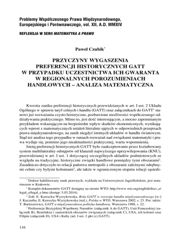 Problemy Współczesnego Prawa Międzynarodowego, Europejskiego i Porównawczego, vol. XII, A.D. MMXIV REFLEKSJA W SERII MATEMATYKA A PRAWO Paweł Czubik* PRZYCZYNY WYGASZENIA PREFERENCJI HISTORYCZNYCH GATT W PRZYPADKU UCZESTNICTWA ICH GWARANTA W REGIONALNYCH POROZUMIENIACH HANDLOWYCH – ANALIZA MATEMATYCZNA Kwestia zaniku preferencji historycznych przewidzianych w art. I ust. 2 Układu Ogólnego w sprawie taryf celnych i handlu (GATT) oraz załącznikach do GATT1 stanowi już rozważania czysto historyczne, pozbawione możliwości współczesnego oddziaływania praktycznego. Mimo to, jest dość interesującym, a mocno zapomnianym przykładem wskazującym na bezpośredni wpływ skutków ekonomicznych, wynikających wprost z matematycznych ustaleń literalnie ujętych w odpowiednich przepisach prawa międzynarodowego, na zanik niegdyś istotnych układów w handlu światowym. Stąd też analiza tego przypadku w ramach rozważań nad związkami matematyki i prawa wydaje się, pomimo jego nieaktualności praktycznej, warta wspomnienia. Istotą preferencji historycznych GATT było zaakceptowanie przez kształtowany system multilateralny odstępstw od klauzuli najwyższego uprzywilejowania (KNU), przewidzianej w art. I ust. 1 dotyczącej szczególnych układów podmiotowych ze względu na tradycyjne, historyczne związki handlowe pomiędzy tymi obszarami2. Zasadniczo dotyczyło to relacji państwa metropolii z obszarami zależnymi odrębnymi celnie czy byłymi koloniami3, ale także w ograniczonym stopniu relacji sąsiedzDoktor habilitowany nauk prawnych, wykłada na Uniwersytecie Jagiellońskim, jest notariuszem w Krakowie. 1 Komplet dokumentów GATT dostępny na stronie WTO: http://www.wto.org/english/docs_e/ legal_e/legal_e.htm (dostęp: 5.03.2014). 2 Zob. E. Kawecka-Wyrzykowska, Rola GATT w rozwoju handlu międzynarodowego [w:] J. Kaczurba, E. Kawecka-Wyrzykowska (red.), Polska w WTO, Warszawa 2002, s. 23. Por. także: T. Bartoszewicz, GATT a międzynarodowa polityka handlowa, Warszawa 1988, s. 22. 3 Preferencje Brytyjskiej Wspólnoty Narodów (załącznik A do GATT), Unii Francuskiej (załącznik B), Beneluksu i zamorskich obszarów związanych (załącznik C), USA, ich kolonii oraz Filipin (załącznik D), USA i Kuby (art. I ust. 2 pkt (c) GATT). * 116 kich państw4. Wymiar możliwych do stosowania preferencji historycznych różnił się pomiędzy poszczególnymi obszarami celnymi, choć zasadniczo ograniczony był zakresem marży preferencji5, co z czasem wraz z obniżaniem poziomu ceł objętych klauzulą najwyższego uprzywilejowania czyniło je coraz bardziej ekonomicznie niezauważalnymi. Była to jedna z podstawowych przyczyn wygaśnięcia preferencji historycznych – wobec znaczącego obniżania ceł w efekcie działań liberalizacyjnych stron GATT – wysokość ceł do których zastosowanie miała klauzula najwyższego uprzywilejowania, zbliżała się do wysokości ceł preferencyjnych. W chwili, kiedy cła określone przez KNU okazywały się niższe od ceł preferencyjnych, utrzymywanie tych drugich okazywałoby się de facto kreowaniem nie tyle marży preferencji, co marży dyskryminacji i jako takie nie byłoby logiczne i przeczyło celom ich powołania do życia. Ponadto, część preferencji historycznych wygasła z przyczyn czysto politycznych6. Jednakże najistotniejszą przyczyną wygaszenia tych preferencji okazała się szeroka akceptacja przez państwa strony GATT mechanizmów integracji regionalnej, wynikających z art. XXIV GATT – w ramach stref wolnego handlu i unii celnych. W literaturze spotyka się niekiedy lapidarne odniesienia do tej kwestii. Podnosi się proste zastępowanie preferencji historycznych preferencjami regionalnymi jako swoistego rodzaju zjawisko naturalne, wynikające ze zmiany optyki państw na oba te mechanizmy handlowe i postrzeganie regionalizmu handlowego jako bardziej korzystnego handlowo. Nie jest to do końca zgodne z prawdą. Państwa w rzeczywistości nie tyle kalkulowały rachunek korzyści, decydując się na zawieranie umów regionalnych co były, ze względu na postanowienia dołączone do Układu Ogólnego, zmuszone do zmiany preferencji historycznych na preferencje regionalne. Stanowiło to konsekwencje prostego ujęcia w Załączniku I do GATT (zatytułowanym „Uwagi i postanowienia uzupełniające (Załącznik I do GATT)” mechanizmów sumowania i zwrotów ceł w przypadku równoległego uczestnictwa jednego z państw, względem którego obowiązywały preferencje regionalne (w zasadzie bez znaczenia czy było ich beneficjantem czy gwarantem) w wolnohandlowym układzie regionalnym. W uwagach do art. XXIV ust. 9 pojawia się jedynie następujące unormowanie: Rozumie się, że postanowienia art. I wymagają, że jeżeli produkt importowany na terytorium członka unii celnej lub strefy wolnego handlu przy zastosowaniu preferencyjnej stawki celnej jest następnie reeksportowany na terytorium innego członka takiej unii lub strefy, ten ostatni członek powinien pobierać cło równe różnicy między cłem już uiszczonym, a jakimkolwiek wyższym cłem, które byłoby pobrane, gdyby produkt ten był importowany bezpośrednio na jego terytorium. 4 Stosunki Chile z Argentyną, Boliwią i Peru (załącznik E), stosunki Libańsko-Syryjskiej Unii Celnej z Palestyną i Transjordanią (zał. F). 5 Upraszczając, można stwierdzić, że preferencje historyczne mogły być ustanawiane w zakresie – z jednej strony (od góry) ograniczonym wysokością ceł stosowanych w warunkach zastosowania klauzuli najwyższego uprzywilejowania – z drugiej strony (od dołu), wysokością minimalną wskazaną w marży preferencji, zgodnie z interpretacją zawartą w art. I ust. 4 GATT i uwagach i postanowieniach uzupełniających do art. I ust. 4 (Załącznik G i I do GATT). 6 Np. konflikt kubański, powstanie państwa Izrael na geograficznym obszarze Palestyny. 117 Jak widać, cytowane przepisy zyskują zastosowanie jedynie w przypadku zawarc