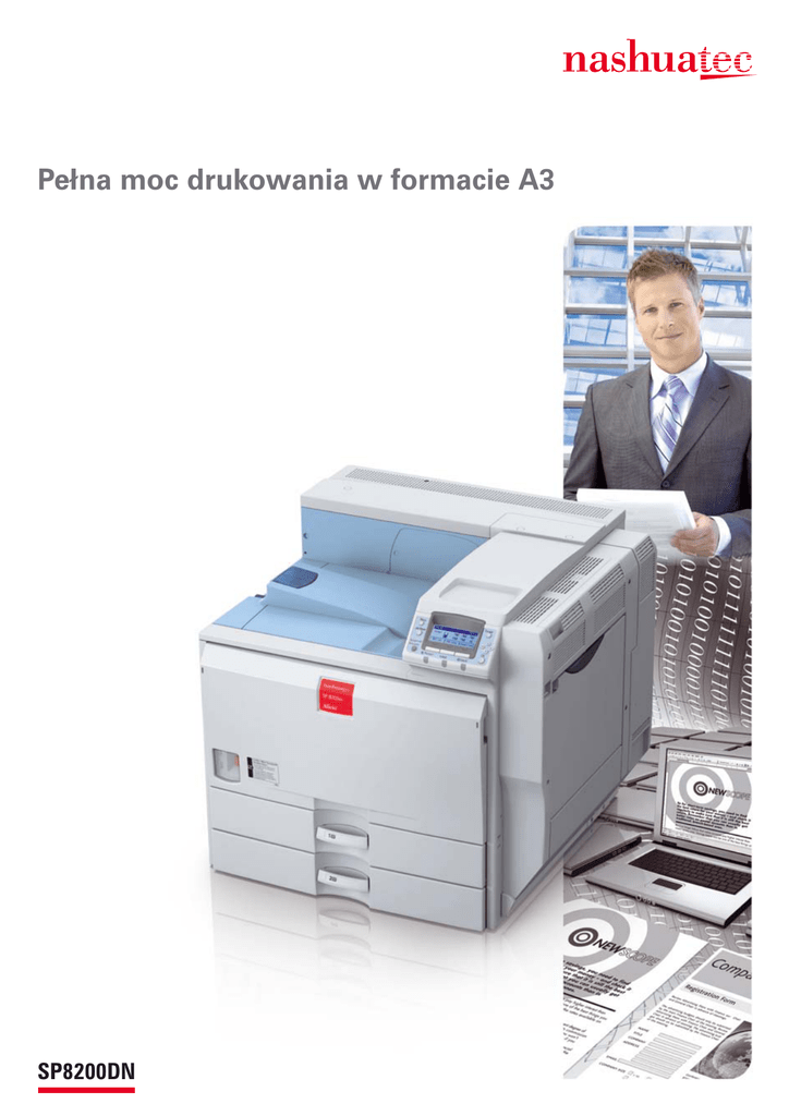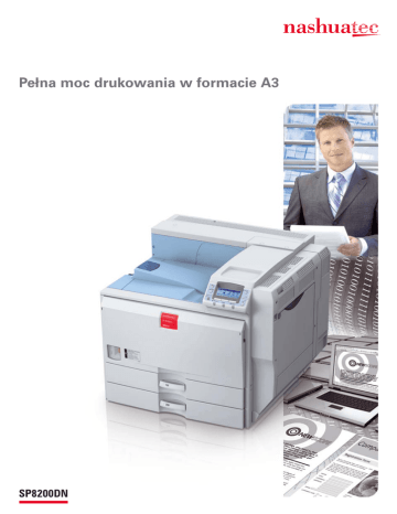 Pena moc drukowania w formacie A3 SP8200DN SzybkoyÂ, wydajnoyÂ, trwaoy By sprosta kademu, nawet najtrudniejszemu zadaniu – duym nakadom czy pilnym wydrukom potrzebnym na zaraz – potrzebujesz sprawdzonego urzdzenia integrujcego w sobie bezkompromisowe rozwizania. Zbudowanego tak, by czy w sobie moliwoyci biurowego druku codziennego oraz zadaÍ wysokonakadowych. czcego bardzo niskie koszty eksploatacji oraz niezwyk wszechstronnoyÂ. Takim urzdzeniem jest nowa drukarka Nashuatec SP8200DN. Nashuatec SP8200DN to: • maksymalna pojemnoy papieru wynoszca do 4400 arkuszy • doskonaa atwoy obsugi • unikalne funkcje zabezpieczeÍ danych i dokumentów • moliwoy bezpoyredniego drukowania w yrodowisku IPDS • moliwoy przenoszenia wysokich obcieÍ miesiÆcznych Wysoka wydajnoy drukowania • czas nagrzewania wynoszcy do 25 sekund • czas otrzymania pierwszego wydruku to maksymalnie 3,5 sekundy • wydruk w dupleksie nie powoduje spowolnienia tempa drukowania Najwysza produktywnoy i praca bez przestojów Drukarka Nashuatec SP8200 jest skonstruowana w taki sposób, by zapewni jak najdusz pracÆ bez niepotrzebnych przestojów. Pojemnoy maksymalna papieru moe siÆga nawet 4400 arkuszy. Elastycznoy wyboru podajników papieru jest niespotykana w tej klasie urzdzeÍ, dostÆpne s dodatkowe dwie kasety o pojemnoyci 550 arkuszy i dua kaseta tandemowa o pojemnoyci 2000 arkuszy. Dodatkowo mona skorzysta z zewnÆtrznej kasety LCT o pojemnoyci 1200 arkuszy. Szeroka gama obsugiwanych noyników • drukowanie na papierze o gramaturze do 220g/m2 • szeroki wybór noyników, urzdzenie moe drukowa miÆdzy innymi na kopertach, foliach, etykietach i papierze z recyklingu • profesjonalna obróbka dokumentów za pomoc dwóch dostÆpnych finiszerów, jednego o pojemnoyci 1000 arkuszy i drugiego o pojemnoyci wynoszcej a 3000 arkuszy (z opcjonalnym moduem dziurkacza) SP8200DN Pena elastycznoy w yrodowiskach sieciowych Drukarka Nashuatec SP8200DN jest zgodna z olbrzymi wiÆkszoyci sieciowych systemów operacyjnych dostÆpnych na rynku. Oferuje równie wsparcie dla zaawansowanych systemów do zarzdzania przedsiÆbiorstwami takich jak SAP® R/3®, IBM® System i5 HPT, w tym dla funkcjonalnoyci drukowania kodów kreskowych i obsugi druku strumieniowego. Opcjonalny modu IPDS umoliwia bezpoyredni druk transakcyjny bez koniecznoyci uywania dodatkowego sprzÆtu. Istnieje moliwoy wykorzystania drukarki Nashuatec SP8200DN jako jednostki druku rozproszonego w yrodowisku hosta. Wyjtkowa atwoy obsugi • dziÆki intuicyjnemu panelowi uytkownika obsuga urzdzenia nie jest kopotliwa nawet dla pocztkujcych uytkowników • wydajny sterownik RPCS pozwala na sterowanie urzdzeniem poprzez kompaktowy interfejs z systemem ikon • dziÆki wygodnemu rozwizaniu tacy przesuwnej moliwy jest atwy i funkcjonalny podzia wydruków, zestawów, czy te pojedynczych kartek Zaawansowana ochrona twoich danych • zabezpieczenia danych poprzez zaawansowane metody szyfrowania • pena kontrola dostÆpu do wszystkich funkcji urzdzenia • kontrola kasowania danych tymczasowych zapisanych na opcjonalnym dysku twardym urzdzenia • szyfrowanie danych zapisanych na opcjonalnym dysku twardym urzdzenia SP8200DN SPECYFIKACJA TECHNICZNA DRUKARKA OBSUGA PAPIERU Technologia elektrofotograficzna, laserowa, toner dwuskadnikowy Szybkoy drukowania 50 stron na minutÆ Pojemnoy podajników papieru standardowo dwie kasety na 550 arkuszy i podajnik rÆczny na 100 arkuszy, maksymalnie 4400 arkuszy Czas nagrzewania mniej ni 25 sekund Pojemnoy tacy odbiorczej 500 arkuszy Czas uzyskania pierwszej strony mniej ni 3,5 sekundy Formaty papieru kasety: A3 – A5, podajnik rÆczny: A3 – A6 Wymiary 670 x 640 x 560mm Gramatura papieru Waga mniej ni 73kg Zasilanie 220 – 240V, 50-60Hz kasety na papier: 60 – 216g/m2 podajnik rÆczny: 52 – 220g/m2 dupleks: 60 – 169g/m2 Pobór mocy maksymalnie 1,42kW, mniej ni 7W w trybie uypienia Typy papieru papier standardowy, papier z recyklingu, folie, etykiety, koperty OPCJE KONTROLER Procesor 533MHz 128 lub 256MB dodatkowej pamiÆci JÆzyki drukarki RPCS, PCL5c, PCL6, Adobe Postscript 3, PDF Direct Print Dysk twardy o pojemnoyci 40GB Rozdzielczoy 600dpi Wireless LAN (IEEE802.11a/g) PamiÆÂ 256MB, maksymalnie 512MB opcjonalny dysk twardy 40GB Wireless LAN (IEEE802.11b/g) Czcionki PCL5c/PCL6: 35 czcionek intelli, 10 czcionek true type, 1 czcionka bitmap, 13 czcionek miÆdzynarodowych PostScript 3: 136 czcionek Adobe typu 1 opcjonalnie: OCR oraz kody kreskowe Modu zabezpieczenia dokumentów przed kopiowaniem Dwukierunkowy port LPT Gigabit Ethernet Modu IPDS (pena obsuga) Karta Java Virtual Machine Modu szyfrowania danych na dysku twardym Dwie kasety na papier o pojemnoyci 550 arkuszy kada Kaseta tandemowa o pojemnoyci 2000 arkuszy POCZENIA SIECIOWE Kaseta LCT o pojemnoyci 1200 arkuszy Protokoy sieciowe TCP/IP, IPX/SPX, EtherTalk, IPP, RHPP Finiszer o pojemnoyci 1000 arkuszy Systemy operacyjne Windows® 2000/XP/Server 2003/Vista, Novell® NetWare® 3.12/3.2/4.1/4.11/5.0/5.1/6/6.5, UNIX Sun® Solaris 2.6/7/8/9, HP-UX 10.x/11.x/11iv1/11i, SCO OpenServer 5.0.6, RedHat® Linux 6.x/7.x/8.x/9.x/Enterprise, IBM® AIX v4.3 & 5L v5.1/5.2, Macintosh 8.6 – 9.2.x, Macintosh X v.10.1 lub pó|niejszy (tryb natywny), SAP® R/3® 3.x lub pó|niejszy, IBM® System i5™ HPT Interfejsy Finiszer o pojemnoyci 3000 arkuszy Modu dziurkacza do finiszera Modu mostka Modu sortowania z przesuniÆciem na tacy finiszera Ethernet 10/100, USB 2.0, opcjonalnie: dwukierunko wy port LPT, Wireless LAN (a/g lub b/g), Gigabit Ethernet Oprogramowanie sieciowe DeskTop Binder™ Lite, SmartDevice Monitor™ for Admin/Client, Web SmartDevice Monitor™, WebImage Monitor, Printer Utility for Macintosh, Font Manager 2000 Wszystkie produkty Nashuatec speniaj normy jakoyci ISO 9001 oraz ochrony yrodowiska naturalnego ISO 14001. Zastrzegamy sobie prawo do wprowadzenia zmian w specyfikacji technicznej oraz wygldzie produktów. Pena gama produktów pokazana