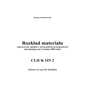 Dorota Ostaszewska Rozkład materiału (opracowany zgodnie z nową podstawą programową obowiązującą od września 2009 roku) CLICK ON 2 Poziom A2 wg CEF (ESOKJ) Wstęp Click On 2 jest podręcznikiem przeznaczonym dla uczniów gimnazjum i odpowiada poziomowi A2 w Europejskim Systemie Opisu Kształcenia Językowego. Zgodnie z nową podstawą programową, zajęcia z języka prowadzone będą na poziomie III.1. Podręcznik Click On 2 podzielony został na pięć modułów, z których kaŜdy zawiera dwa rozdziały powiązane tematycznie. Dobierając zagadnienia słuŜące prezentacji materiału obcojęzycznego, autorzy podręcznika ponownie dowiedli znajomości zainteresowań i potrzeb ucznia. Obok tematów „codziennych” (dom, rodzina, zakupy itd.), Click On 2 porusza powaŜne problemy (jak choćby kwestie związane z ochroną środowiska), z którymi uczniowie niewątpliwie się stykają. Ponadto treści kulturowe zawarte w podręczniku pozwalają uczniom zapoznać się ze specyfiką innych krajów (nie tylko anglojęzycznych), co sprzyja rozwijaniu toŜsamości narodowej oraz tolerancji. KaŜdy z dziesięciu rozdziałów rozpoczyna się „wizytówką” – trzema dialogami sygnalizującymi tak tematykę rozdziału, jak i zawarty w nim materiał gramatycznoleksykalny. W ten sposób uczeń ma moŜliwość wglądu w znaczenie i działanie struktury, zanim zacznie analizować ją w sposób formalny (technika indukcyjna). Dialogi słuŜą takŜe rozwijaniu sprawności rozumienia ze słuchu i rozumienia tekstu, a wykonanie towarzyszących im ćwiczeń zapewni nastolatkom poczucie sukcesu i będzie motywacją do dalszej pracy. Podobnie jak Click On 1, Click On 2 zwraca w równym stopniu uwagę na wszystkie sprawności językowe i rozwija je w sposób zintegrowany. Dzięki temu w nienaturalnym kontekście klasy szkolnej język pozostaje „Ŝywy”, jego róŜnorodne funkcje splatają się ze sobą, a uczeń ma świadomość, Ŝe „mówić po angielsku” to takŜe „czytać, słuchać i pisać po angielsku”, Ŝe język obcy moŜna opanować jedynie jako całość. Autorzy podręcznika nie zapomnieli takŜe o znaczeniu systematyczności w nauce języka obcego. KaŜdy z pięciu modułów zakończony jest rozdziałem powtórzeniowym, którego celem jest utrwalenie struktur gramatycznych i słownictwa (ze szczególnym naciskiem na związki wyrazowe – jeden z najtrudniejszych aspektów nauki języka obcego). Ponadto wszystkie rozdziały powtórzeniowe zawierają zadania sprawdzające stopień opanowania sprawności językowych: mówienia, czytania ze zrozumieniem i pisania. Ostatnie ćwiczenie – sprawdzian rozumienia ze słuchu – ma zawsze formę muzyczną, uczniowie uzupełniają brakujące słowa w tekście piosenki. 2 Poza rozdziałami właściwymi i powtórzeniowymi, Click On 2 zawiera podzieloną na siedem części, komiksową wersję powieści A. Conan-Doyla Pies Baskerville’ów. I znów trzeba tu pochwalić wybór autorów kursu – wszyscy dobrze znają postać Sherlocka Holmesa, a pełna grozy i tajemnic opowieść z pewnością pobudzi wyobraźnię kaŜdego nastolatka. Dodatkowe zalety podręcznika stanowią: 1. zestawienie zagadnień gramatycznych wraz z przykładami; 2. Photo File Section – zestaw bogato ilustrowanych ćwiczeń utrwalających słownictwo i gramatykę poprzez odtwarzanie bądź uzupełnianie krótkich tekstów; 3. Guide to UK & USA Culture – dziesięć lekcji poświęconych kulturze Wielkiej Brytanii i Stanów Zjednoczonych, tematycznie dopasowanych do poszczególnych rozdziałów. Opisując kurs Click On 2 nie moŜna pominąć Zeszytu ćwiczeń, składającego się z trzech części: • dziesięciu rozdziałów podstawowych (odpowiadających rozdziałom podręcznika), zawierających ćwiczenia utrwalające i/ lub poszerzające materiał podręcznikowy, które nauczyciel moŜe wykorzystać jako uzupełnienie lekcji lub jako pracę domową; • dziesięciu rozdziałów gramatycznych, zawierających przejrzyste tabele prezentujące materiał gramatyczny omawiany w danym rozdziale części pierwszej Zeszytu ćwiczeń oraz ćwiczenia z tym materiałem korespondujące); • zbioru dziesięciu testów przeznaczonych do sprawdzenia postępów uczniów po zakończeniu pracy nad kaŜdym rozdziałem części pierwszej. Wśród komponentów kursu – oprócz podręcznika (Student’s Book) i wspomnianego juŜ zeszytu ćwiczeń (Workbook w wersji dla ucznia i dla nauczyciela) – znajdują się: płyty CD do wykorzystania w klasie (Audio Class CDs); płyta CD dla ucznia do pracy indywidualnej w domu (Student’s CD); DVD; zeszyt ćwiczeń do DVD (DVD Activity Book); Companion; portfolio językowe (My Language Portfolio); 3 zestaw testów (Test Booklet); ksiąŜka nauczyciela (Teacher’s Book). KsiąŜka nauczyciela stanowi połączenie podręcznika z przewodnikiem metodycznym i zawiera dokładne omówienie wszystkich prezentacji i ćwiczeń (wraz z kluczem). Prezentowany rozkład materiału podzielono, podobnie jak w przypadku pierwszej części kursu, na następujące rubryki: Sprawności produktywne (mówienie i pisanie); Sprawności receptywne (słuchanie i czytanie); Słownictwo; Gramatyka; Wymowa. W pierwszej rubryce nauczyciel znajdzie listę funkcji językowych, które uczeń ma opanować w danym rozdziale, w mowie bądź w piśmie. W rubryce uwzględniono ćwiczenia związane z Photo File Section (project), mimo iŜ ich celem jest raczej utrwalenie gramatyki i słownictwa niŜ rozwijanie umiejętności pisania. Rubryka druga zawiera opis ćwiczeń rozwijających umiejętności rozumienia ze słuchu oraz rozumienia tekstu czytanego. W rubryce nie uwzględniono zadań związanych z rozpoczynającymi kaŜdy rozdział dialogami, gdyŜ pełnią one głównie funkcję prezentacji materiału zawartego w rozdziale. Rubryka trzecia zawiera zbiór dziedzin, z którymi związane jest słownictwo wprowadzane w danej części podręcznika, a w rubryce czwartej zna