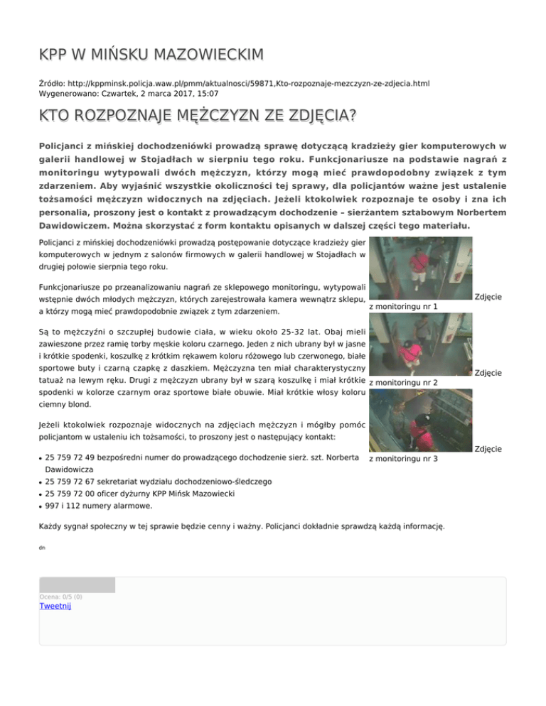 KPP W MIŃSKU MAZOWIECKIM Źródło: http://kppminsk.policja.waw.pl/pmm/aktualnosci/59871,Kto-rozpoznaje-mezczyzn-ze-zdjecia.html Wygenerowano: Czwartek, 2 marca 2017, 15:07 KTO ROZPOZNAJE MĘŻCZYZN ZE ZDJĘCIA? Policjanci z mińskiej dochodzeniówki prowadzą sprawę dotyczącą kradzieży gier komputerowych w galerii handlowej w Stojadłach w sierpniu tego roku. Funkcjonariusze na podstawie nagrań z monitoringu wytypowali dwóch mężczyzn, którzy mogą mieć prawdopodobny związek z tym zdarzeniem. Aby wyjaśnić wszystkie okoliczności tej sprawy, dla policjantów ważne jest ustalenie tożsamości mężczyzn widocznych na zdjęciach. Jeżeli ktokolwiek rozpoznaje te osoby i zna ich personalia, proszony jest o kontakt z prowadzącym dochodzenie – sierżantem sztabowym Norbertem Dawidowiczem. Można skorzystać z form kontaktu opisanych w dalszej części tego materiału. Policjanci z mińskiej dochodzeniówki prowadzą postępowanie dotyczące kradzieży gier komputerowych w jednym z salonów firmowych w galerii handlowej w Stojadłach w drugiej połowie sierpnia tego roku. Funkcjonariusze po przeanalizowaniu nagrań ze sklepowego monitoringu, wytypowali wstępnie dwóch młodych mężczyzn, których zarejestrowała kamera wewnątrz sklepu, a którzy mogą mieć prawdopodobnie związek z tym zdarzeniem. Zdjęcie z monitoringu nr 1 Są to mężczyźni o szczupłej budowie ciała, w wieku około 25-32 lat. Obaj mieli zawieszone przez ramię torby męskie koloru czarnego. Jeden z nich ubrany był w jasne i krótkie spodenki, koszulkę z krótkim rękawem koloru różowego lub czerwonego, białe sportowe buty i czarną czapkę z daszkiem. Mężczyzna ten miał charakterystyczny tatuaż na lewym ręku. Drugi z mężczyzn ubrany był w szarą koszulkę i miał krótkie z monitoringu nr 2 spodenki w kolorze czarnym oraz sportowe białe obuwie. Miał krótkie włosy koloru Zdjęcie ciemny blond. Jeżeli ktokolwiek rozpoznaje widocznych na zdjęciach mężczyzn i mógłby pomóc policjantom w ustaleniu ich tożsamości, to proszony jest o następujący kontakt: ● 25 759 72 49 bezpośredni numer do prowadzącego dochodzenie sierż. szt. Norberta Zdjęcie z monitoringu nr 3 Dawidowicza ● 25 759 72 67 sekretariat wydziału dochodzeniowo-śledczego ● 25 759 72 00 oficer dyżurny KPP Mińsk Mazowiecki ● 997 i 112 numery alarmowe. Każdy sygnał społeczny w tej sprawie będzie cenny i ważny. Policjanci dokładnie sprawdzą każdą informację. dn Ocena: 0/5 (0) Tweetnij