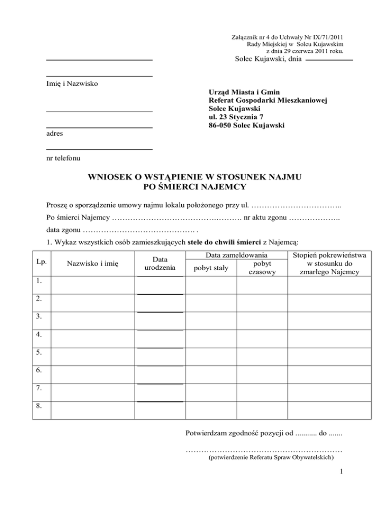 Załącznik nr 4 do Uchwały Nr IX/71/2011 Rady Miejskiej w Solcu Kujawskim z dnia 29 czerwca 2011 roku. Solec Kujawski, dnia Imię i Nazwisko Urząd Miasta i Gmin Referat Gospodarki Mieszkaniowej Solce Kujawski ul. 23 Stycznia 7 86-050 Solec Kujawski adres nr telefonu WNIOSEK O WSTĄPIENIE W STOSUNEK NAJMU PO ŚMIERCI NAJEMCY Proszę o sporządzenie umowy najmu lokalu położonego przy ul. …………………………….. Po śmierci Najemcy ………………………………….………. nr aktu zgonu ……………….. data zgonu ……………………………………. . 1. Wykaz wszystkich osób zamieszkujących stele do chwili śmierci z Najemcą: Lp. Nazwisko i imię Data urodzenia Data zameldowania pobyt pobyt stały czasowy Stopień pokrewieństwa w stosunku do zmarłego Najemcy 1. 2. 3. 4. 5. 6. 7. 8. Potwierdzam zgodność pozycji od ........... do ....... …………………………………………………… (potwierdzenie Referatu Spraw Obywatelskich) 1 Oświadczenie wnioskodawcy: Ja niżej podpisany, świadom odpowiedzialności karnej z art. 233§1 Kodeksu Karnego za złożenie danych niezgodnych z prawdą stwierdzam że: 1. Na terenie miasta i gminy, ani poza jej terenem ja, ani nikt z członków mieszkającej ze mną rodziny nie buduje własnego domu mieszkalnego. 2. Tak ja, jak i żaden z członków mieszkającej ze mną rodziny nie posiadamy mieszkania z zakładu pracy ani ze spółdzielni mieszkaniowej ani też nie oczekujemy na ich przydział. 3. Tak ja, jak i żaden z członków mieszkającej ze mną rodziny nie ma zamiaru przenieść się do innej miejscowości, wyjechać na stałe za granicę lub wyprowadzić się do nowo założonej rodziny. 4. W mieszkaniu, o które się staram zamieszkują osoby, których nie wykazałem jako zamieszkałych z wnioskodawcą na 1 str. wniosku. 5. Posiadam uregulowany prawnie stan cywilny (nie zachodzi wypadek separacji małżeńskiej) Solec Kujawski, dn. ……………………… …………………………………… /czytelny podpis/ …………………………………………………………………………………………………... /dowód osobisty, seria nr, wydany przez kogo, dnia/ PONIŻSZE WYPEŁNIA REFERAT KSIĘGOWOŚCI BUDŻETOWEJ TUT. URZĘDU 1. Występują/ nie występują* zaległości czynszowe wg stanu na dzień …………………………….. w wysokości…………………………………. 2. Została/nie została* zawarta ugoda z gminą na spłatę zaległości czynszowych. - data zawarcia ugody ................................. - wysokość zaległości na jaką spisano ugodę ..................................... zł - ilość rat .................................. - wysokość 1 raty ................................. zł * niepotrzebne skreślić Solec Kujawski, dn. ........................ ……………………………………………………….. (potwierdzenie Referatu Księgowości Budżetowej ) Załączniki 1. ksero aktu zgonu 2