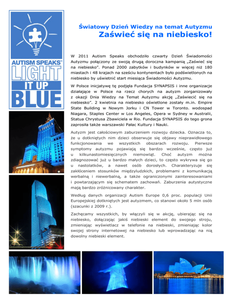 Światowy Dzień Wiedzy na temat Autyzmu Zaświeć się na niebiesko! W 2011 Autism Speaks obchodziło czwarty Dzień Świadomości Autyzmu połączony ze swoją drugą doroczna kampanią „Zaświeć się na niebiesko”. Ponad 2000 zabytków i budynków w więcej niż 180 miastach i 48 krajach na sześciu kontynentach było podświetlonych na niebiesko by uświetnić start miesiąca Świadomości Autyzmu. W Polsce inicjatywę tę podjęła Fundacja SYNAPSIS i inne organizacje działające w Polsce na rzecz chorych na autyzm zorganizowały z okazji Dnia Wiedzy na Temat Autyzmu akcję „Zaświecić się na niebiesko”. 2 kwietnia na niebiesko oświetlone zostały m.in. Empire State Building w Nowym Jorku i CN Tower w Toronto. wodospad Niagara, Staples Center w Los Angeles, Opera w Sydney w Australii, Statua Chrystusa Zbawiciela w Rio. Fundacja SYNAPSIS do tego grona zaprosiła także warszawski Pałac Kultury i Nauki. Autyzm jest całościowym zaburzeniem rozwoju dziecka. Oznacza to, że u dotkniętych nim dzieci obserwuje się objawy nieprawidłowego funkcjonowania we symptomy autyzmu u wszystkich pojawiają kilkunastomiesięcznych obszarach się bardzo niemowląt. rozwoju. Pierwsze wcześnie, często już Choć autyzm można zdiagnozować już u bardzo małych dzieci, to często wykrywa się go u nastolatków, a nawet osób dorosłych. Charakteryzuje się zakłóceniem stosunków międzyludzkich, problemami z komunikacją werbalną i niewerbalną, a także ograniczonymi zainteresowaniami i powtarzającym się schematem zachowań. Zaburzenia autystyczne mają bardzo zróżnicowany charakter. Według danych organizacji Autism Europe 0,6 proc. populacji Unii Europejskiej dotkniętych jest autyzmem, co stanowi około 5 mln osób (szacunki z 2009 r.). Zachęcamy wszystkich, by włączyli się w akcję, ubierając się na niebiesko, dołączając jakiś niebieski element do swojego stroju, zmieniając wyświetlacz w telefonie na niebieski, zmieniając kolor swojej strony internetowej na niebiesko lub wprowadzając na nią dowolny niebieski element.