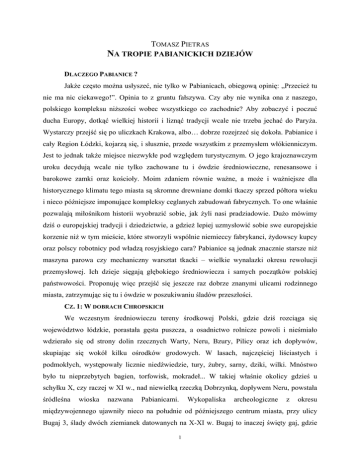 TOMASZ PIETRAS NA TROPIE PABIANICKICH DZIEJÓW DLACZEGO PABIANICE ? Jakże często można usłyszeć, nie tylko w Pabianicach, obiegową opinię: „Przecież tu nie ma nic ciekawego!”. Opinia to z gruntu fałszywa. Czy aby nie wynika ona z naszego, polskiego kompleksu niższości wobec wszystkiego co zachodnie? Aby zobaczyć i poczuć ducha Europy, dotkąć wielkiej historii i liznąć tradycji wcale nie trzeba jechać do Paryża. Wystarczy przejść się po uliczkach Krakowa, albo… dobrze rozejrzeć się dokoła. Pabianice i cały Region Łódzki, kojarzą się, i słusznie, przede wszystkim z przemysłem włókienniczym. Jest to jednak także miejsce niezwykłe pod względem turystycznym. O jego krajoznawczym uroku decydują wcale nie tylko zachowane tu i ówdzie średniowieczne, renesansowe i barokowe zamki oraz kościoły. Moim zdaniem równie ważne, a może i ważniejsze dla historycznego klimatu tego miasta są skromne drewniane domki tkaczy sprzed półtora wieku i nieco późniejsze imponujące kompleksy ceglanych zabudowań fabrycznych. To one właśnie pozwalają miłośnikom historii wyobrazić sobie, jak żyli nasi pradziadowie. Dużo mówimy dziś o europejskiej tradycji i dziedzictwie, a gdzież lepiej uzmysłowić sobie swe europejskie korzenie niż w tym mieście, które stworzyli wspólnie niemieccy fabrykanci, żydowscy kupcy oraz polscy robotnicy pod władzą rosyjskiego cara? Pabianice są jednak znacznie starsze niż maszyna parowa czy mechaniczny warsztat tkacki – wielkie wynalazki okresu rewolucji przemysłowej. Ich dzieje sięgają głębokiego średniowiecza i samych początków polskiej państwowości. Proponuję więc przejść się jeszcze raz dobrze znanymi ulicami rodzinnego miasta, zatrzymując się tu i ówdzie w poszukiwaniu śladów przeszłości. CZ. 1: W DOBRACH CHROPSKICH We wczesnym średniowieczu tereny środkowej Polski, gdzie dziś rozciąga się województwo łódzkie, porastała gęsta puszcza, a osadnictwo rolnicze powoli i nieśmiało wdzierało się od strony dolin rzecznych Warty, Neru, Bzury, Pilicy oraz ich dopływów, skupiając się wokół kilku ośrodków grodowych. W lasach, najczęściej liściastych i podmokłych, występowały licznie niedźwiedzie, tury, żubry, sarny, dziki, wilki. Mnóstwo było tu nieprzebytych bagien, torfowisk, mokradeł... W takiej właśnie okolicy gdzieś u schyłku X, czy raczej w XI w., nad niewielką rzeczką Dobrzynką, dopływem Neru, powstała śródleśna wioska nazwana Pabianicami. Wykopaliska archeologiczne z okresu międzywojennego ujawniły nieco na południe od późniejszego centrum miasta, przy ulicy Bugaj 3, ślady dwóch ziemianek datowanych na X-XI w. Bugaj to inaczej święty gaj, gdzie 1 składano ofiary słowiańskim bogom. Od tego miejsca proponuję rozpocząć zwiedzanie Pabianic. Założycielem dawnej wsi Pabianice, sądząc po nazwie, był zapewne kmieć noszący, dosyć rzadkie u nas, a popularne np. w sąsiednich Czechach, chrześcijańskie imię Fabian czyli Pabian. Późniejsza tradycja zapomniała jednak o nim, próbując inaczej wytłumaczyć pochodzenie nazwy tego miasta. Piszący przed 100 laty pabianicki historyk - Maksymilian Baruch przytoczył kilka podań ludowych objaśniających nazwę Pabianice. Pierwotnie miała ona brzmieć Pobawianice od bawienia się tu książąt na łowach albo Pobijanice od bijania tu dzikiej zwierzyny, czy wreszcie Fabianice od legendarnej księżnej Fabianki, pierwszej lokatorki tutejszego zamku, która była tak szpetna, że musiała tajemnym podziemnym korytarzem przemykać się z zamku do kościoła, aby ukryć swą twarz przed ludźmi. Wieś Fabiana przez pierwsze stulecie swojego istnienia była własnością książęcą. Na przełomie XI i XII stulecia, jak zanotowały źródła, drogą darowizny jednej z dwóch żon księcia Władysława Hermana o imieniu Judyta trafiła ona wraz z całą okolicą zwaną Chropy do majątku kościoła krakowskiego. Tradycja powiązała to nadanie z osobą pierwszej z żon księcia Władysława - księżniczką czeską, oraz, barwnie opisanymi przez Galla Anonima, żarliwymi modlitwami podstarzałej już pary książęcej o męskiego potomka. Modlitwy okazały się owocne i 25 sierpnia 1085 lub 1086 r. przyszedł na świat późniejszy książę Polski - Bolesław III Krzywousty, główny bohater kroniki Galla Anonima. Nazwa Chropy oznaczała podobno pierwotnie: „miejsca niskie wśród lasu (...) większą część roku wodą zalane”. Odpowiada to dokładnie topografii okolic Pabianic znanej z późniejszych map, a i dziś dostrzegalnej - rzeczka Dobrzynka, będąca obecnie smutnym skutkiem uprzemysłowienia brudnym kanałem, nadal często wylewa, a w południowej i zachodniej części miasta zachowały się spore pozostałości dawnych lasów. Dobra chropskie, położone około 200 km od Krakowa, któryś z biskupów krakowskich oddał w ciągu XII w. swym kanonikom. Duchowni spod Wawelu nie interesowali się nimi zbytnio, więc przed 1189 r. książę Kazimierz Sprawiedliwy na krótko objął zarząd nad tym majątkiem w celu poprawienia jego stanu gospodarczego. Oddając następnie dobra kapitule, zastrzegł dla siebie dożywotnie prawo do polowań na grubego zwierza na tym obszarze, co doskonale obrazuje ówczesny charakter tych okolic. Jan Długosz pisał, że tereny te dawniej: „częściej zwierz dziki za legowisko obierał, aniżeli dotykał pług rolnika”. W ciągu następnych stuleci karczunek tutejszych lasów i rolnictwo poczyniły ogromne postępy. Kompleks dóbr kapituły krakowskiej w ziemi sieradzkiej, których ośrodek zarządu znajdował się od przełomu XIII i XIV w. w Pabianicach, obejmował w końcu XVI w. 2 już 2 miasta (Pabianice i Rzgów) oraz 51 wsi. Kapituła krakowska oddawała je w dzierżawę, w zamian za stały czynsz, rozmaitym dzierżawcom - tenutariuszom, zwanym też regensami, rekrutującym się z grona kanoników tej kapituły. W praktyce zastępowali 