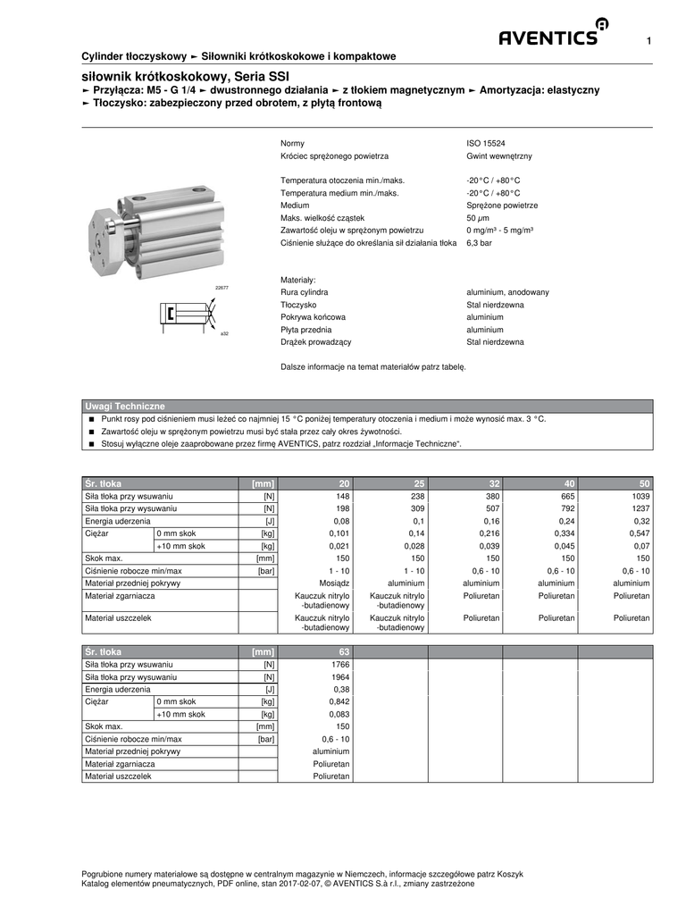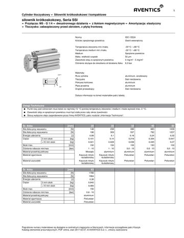 1 Cylinder tłoczyskowy ► Siłowniki krótkoskokowe i kompaktowe siłownik krótkoskokowy, Seria SSI ► Przyłącza: M5 - G 1/4 ► dwustronnego działania ► z tłokiem magnetycznym ► Amortyzacja: elastyczny ► Tłoczysko: zabezpieczony przed obrotem, z płytą frontową Normy ISO 15524 Króciec sprężonego powietrza Gwint wewnętrzny Temperatura otoczenia min./maks. -20°C / +80°C Temperatura medium min./maks. -20°C / +80°C Medium Sprężone powietrze Maks. wielkość cząstek 50 µm Zawartość oleju w sprężonym powietrzu 0 mg/m³ - 5 mg/m³ Ciśnienie służące do określania sił działania tłoka 6,3 bar Materiały: 22677 a32 Rura cylindra aluminium, anodowany Tłoczysko Stal nierdzewna Pokrywa końcowa aluminium Płyta przednia aluminium Drążek prowadzący Stal nierdzewna Dalsze informacje na temat materiałów patrz tabelę. Uwagi Techniczne ■ Punkt rosy pod ciśnieniem musi leżeć co najmniej 15 °C poniżej temperatury otoczenia i medium i może wynosić max. 3 °C. ■ Zawartość oleju w sprężonym powietrzu musi być stała przez cały okres żywotności. ■ Stosuj wyłączne oleje zaaprobowane przez firmę AVENTICS, patrz rozdział „Informacje Techniczne“. Śr. tłoka Siła tłoka przy wsuwaniu [mm] [N] 20 25 148 238 32 380 40 50 665 1039 1237 Siła tłoka przy wysuwaniu [N] 198 309 507 792 Energia uderzenia [J] 0,08 0,1 0,16 0,24 0,32 [kg] 0,101 0,14 0,216 0,334 0,547 0,07 Ciężar 0 mm skok [kg] 0,021 0,028 0,039 0,045 Skok max. +10 mm skok [mm] 150 150 150 150 150 Ciśnienie robocze min/max [bar] 1 - 10 1 - 10 0,6 - 10 0,6 - 10 0,6 - 10 Materiał przedniej pokrywy Mosiądz aluminium aluminium aluminium aluminium Materiał zgarniacza Kauczuk nitrylo -butadienowy Kauczuk nitrylo -butadienowy Poliuretan Poliuretan Poliuretan Materiał uszczelek Kauczuk nitrylo -butadienowy Kauczuk nitrylo -butadienowy Poliuretan Poliuretan Poliuretan Śr. tłoka Siła tłoka przy wsuwaniu [mm] 63 [N] 1766 Siła tłoka przy wysuwaniu [N] 1964 Energia uderzenia [J] 0,38 [kg] 0,842 [kg] 0,083 Ciężar 0 mm skok +10 mm skok Skok max. [mm] 150 Ciśnienie robocze min/max [bar] 0,6 - 10 Materiał przedniej pokrywy aluminium Materiał zgarniacza Poliuretan Materiał uszczelek Poliuretan Pogrubione numery materiałowe są dostępne w centralnym magazynie w Niemczech, informacje szczegółowe patrz Koszyk Katalog elementów pneumatycznych, PDF online, stan 2017-02-07, © AVENTICS S.à r.l., zmiany zastrzeżone 2 Cylinder tłoczyskowy ► Siłowniki krótkoskokowe i kompaktowe siłownik krótkoskokowy, Seria SSI ► Przyłącza: M5 - G 1/4 ► dwustronnego działania ► z tłokiem magnetycznym ► Amortyzacja: elastyczny ► Tłoczysko: zabezpieczony przed obrotem, z płytą frontową Śr. tłoka Przyłącza Śr. tłoczyska Skok 5 20 M5 10 25 M5 12 32 G 1/8 16 40 G 1/8 16 50 G 1/4 20 R480637940 R480637948 R480637956 R480637964 R480637972 10 R480637941 R480637949 R480637957 R480637965 R480637973 15 R480637942 R480637950 R480637958 R480637966 R480637974 20 R480637943 R480637951 R480637959 R480637967 R480637975 25 R480637944 R480637952 R480637960 R480637968 R480637976 30 R480637945 R480637953 R480637961 R480637969 R480637977 40 R480637946 R480637954 R480637962 R480637970 R480637978 50 R480637947 R480637955 R480637963 R480637971 R480637979 80 - - R480644584 R480644585 R480637980 100 - - R480641813 R480644586 R480637981 Śr. tłoka Przyłącza Śr. tłoczyska 63 G 1/4 20 Skok 5 R480637982 10 R480637983 15 R480637984 20 R480637985 25 R480637986 30 R480637987 40 R480637988 50 R480637989 80 R480637990 100 R480637991 Konfigurowalny produkt Ten produkt można konfigurować. Należy użyć naszego konfiguratora internetowego na stronie http://www. aventics.com lub skontaktować się z najbliższym centrum dystrybucyjnym AVENTICS. Maksymalna dozwolona siła boczna, Dynamiczny Fs [N] 70 60 Ø63 50 X 40 30 Ø50 Ø32/40 Ø25 20 Fs 10 S+X 23104 Ø20 0 0 40 80 120 160 200 S + X [mm] 23106 X = odległość między punktem przyłożenia siły i pokrywą cylindra FS = siła boczna S = skok Pogrubione numery materiałowe są dostępne w centralnym magazynie w Niemczech, informacje szczegółowe patrz Koszyk Katalog elementów pneumatycznych, PDF online, stan 2017-02-07, © AVENTICS S.à r.l., zmiany zastrzeżone 3 Cylinder tłoczyskowy ► Siłowniki krótkoskokowe i kompaktowe siłownik krótkoskokowy, Seria SSI ► Przyłącza: M5 - G 1/4 ► dwustronnego działania ► z tłokiem magnetycznym ► Amortyzacja: elastyczny ► Tłoczysko: zabezpieczony przed obrotem, z płytą frontową max. dozwolony moment obrotowy Mt [Nm] 3,0 2,5 X Ø63 2,0 Mt 1,5 Ø50 1,0 Ø40 0,5 S+X 23105 0 0 40 Ø32 Ø20 Ø25 80 120 160 200 S + X [mm] 23107 X = odległość między punktem przyłożenia siły i pokrywą cylindra M = max. dozwolony moment obrotowy S = skok Pogrubione numery materiałowe są dostępne w centralnym magazynie w Niemczech, informacje szczegółowe patrz Koszyk Katalog elementów pneumatycznych, PDF online, stan 2017-02-07, © AVENTICS S.à r.l., zmiany zastrzeżone 4 Cylinder tłoczyskowy ► Siłowniki krótkoskokowe i kompaktowe siłownik krótkoskokowy, Seria SSI ► Przyłącza: M5 - G 1/4 ► dwustronnego działania ► z tłokiem magnetycznym ► Amortyzacja: elastyczny ► Tłoczysko: zabezpieczony przed obrotem, z płytą frontową Rozmiary E EB TG E BC KA F KA FB DD KB EE PL LM EB KB TG E TG E OH TG PL RR WH DT RT MM SW ZA+S LB ZB+S BG X1 X1 Z 6,85 Z 2:1 3,05 5,35 X2 X2 Y Y 2:1 4,15 3,65 22836 S = skok Śr. tłoka BC BG 20 M4 16 25 M5 16 ØDD H13 ØDT E EB EE F FB KA KB LB 1) LM ØMM f8 4 9 36 34 M5 - 26 17 ±0,1 12 ±0,1 5,5 8 10 5 9 40 38 M5 - 30 22 ±0,1 15,6 ±0,1 5,5 8 12 32 M5 16 5 9 45 43 G 1/8 17 38 28 ±0,2 19,8 ±0,2 5,5 10 16 40 M5 16 5 9 52 50 G 1/8 17 46 33 ±0,2 23,3 ±0,2 5,5 10 16 50 M6 20 6 11 64 62 G 1/4 21 58 42 ±0,2 29,7 ±0,2 8 12 20 63 M6 25 6 14 77 74 G 1/4 21 69 50 ±0,2 35,4 ±0,2 10,5 12 20 Pogrubione numery materiałowe są dostępne w centralnym magazynie w