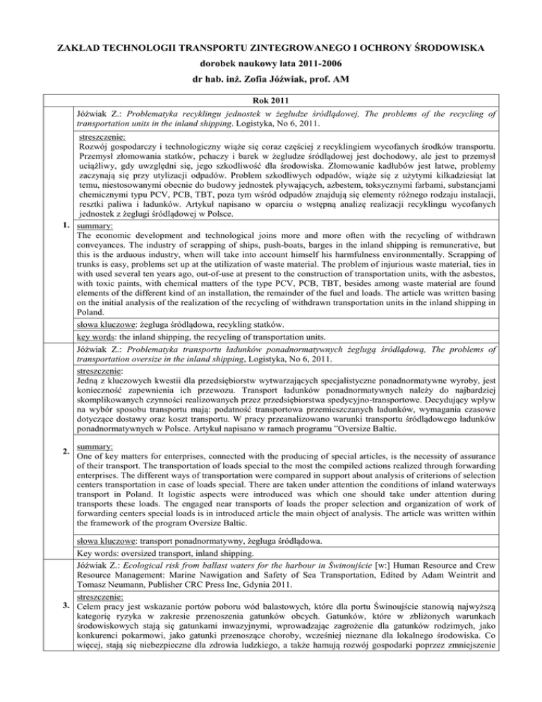 ZAKŁAD TECHNOLOGII TRANSPORTU ZINTEGROWANEGO I OCHRONY ŚRODOWISKA